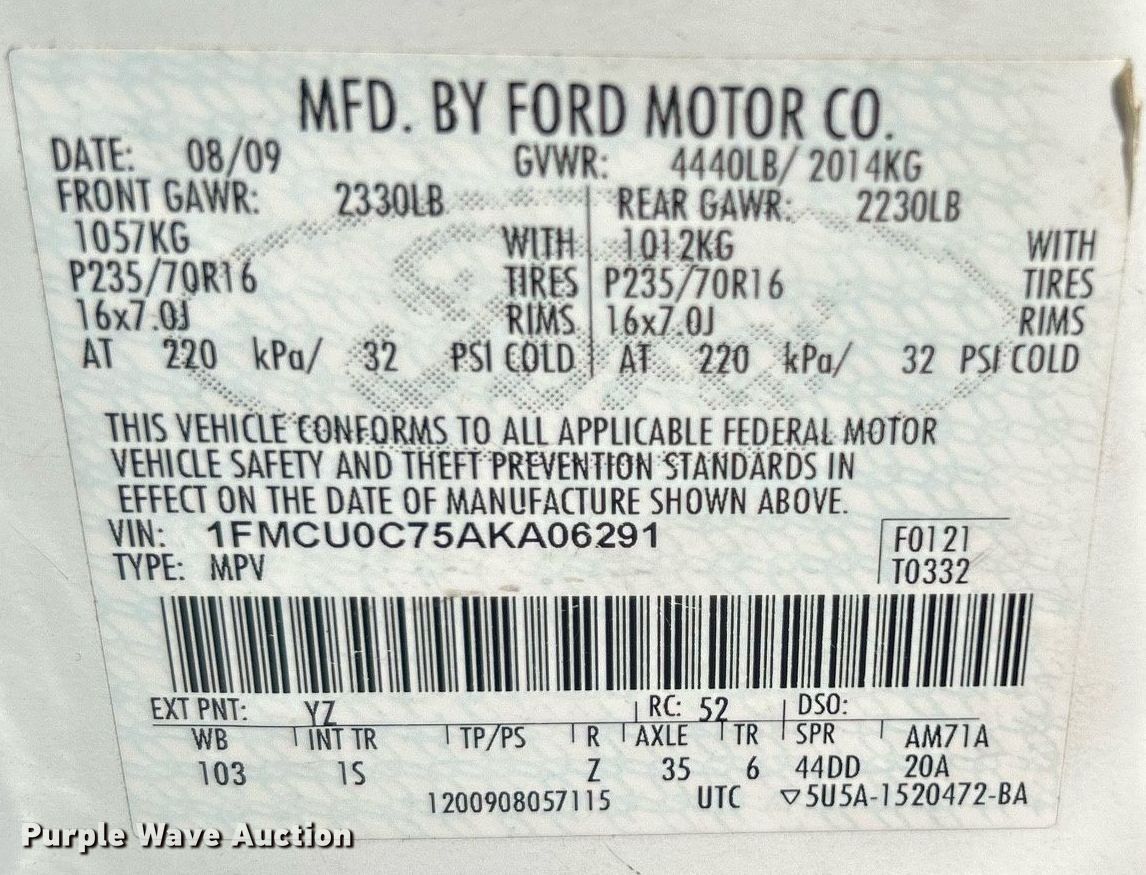 Purple Wave is selling a used Passenger Vehicle in Oklahoma. This item is a 2010 Ford Escape SUV with the following: Miles: 136,529 on odometer, VIN: 1FMCU0C75AKA06291, Unit #: 202