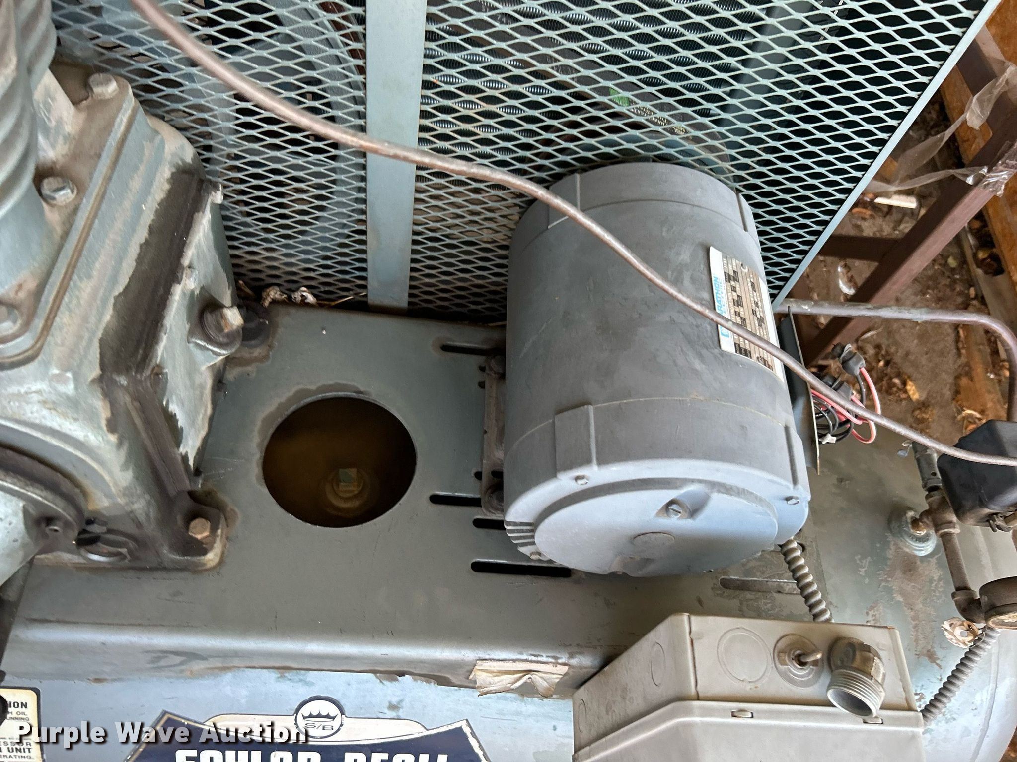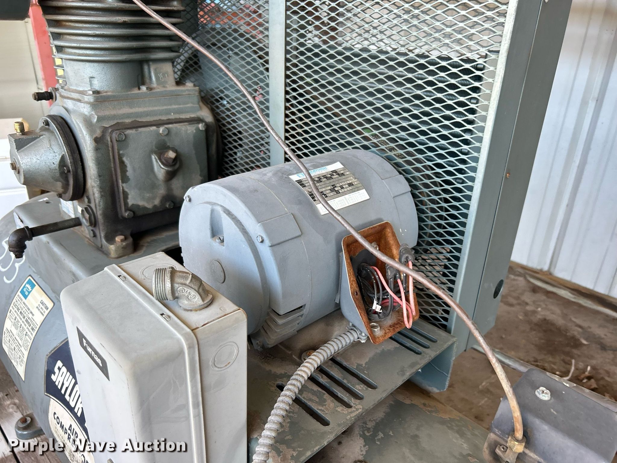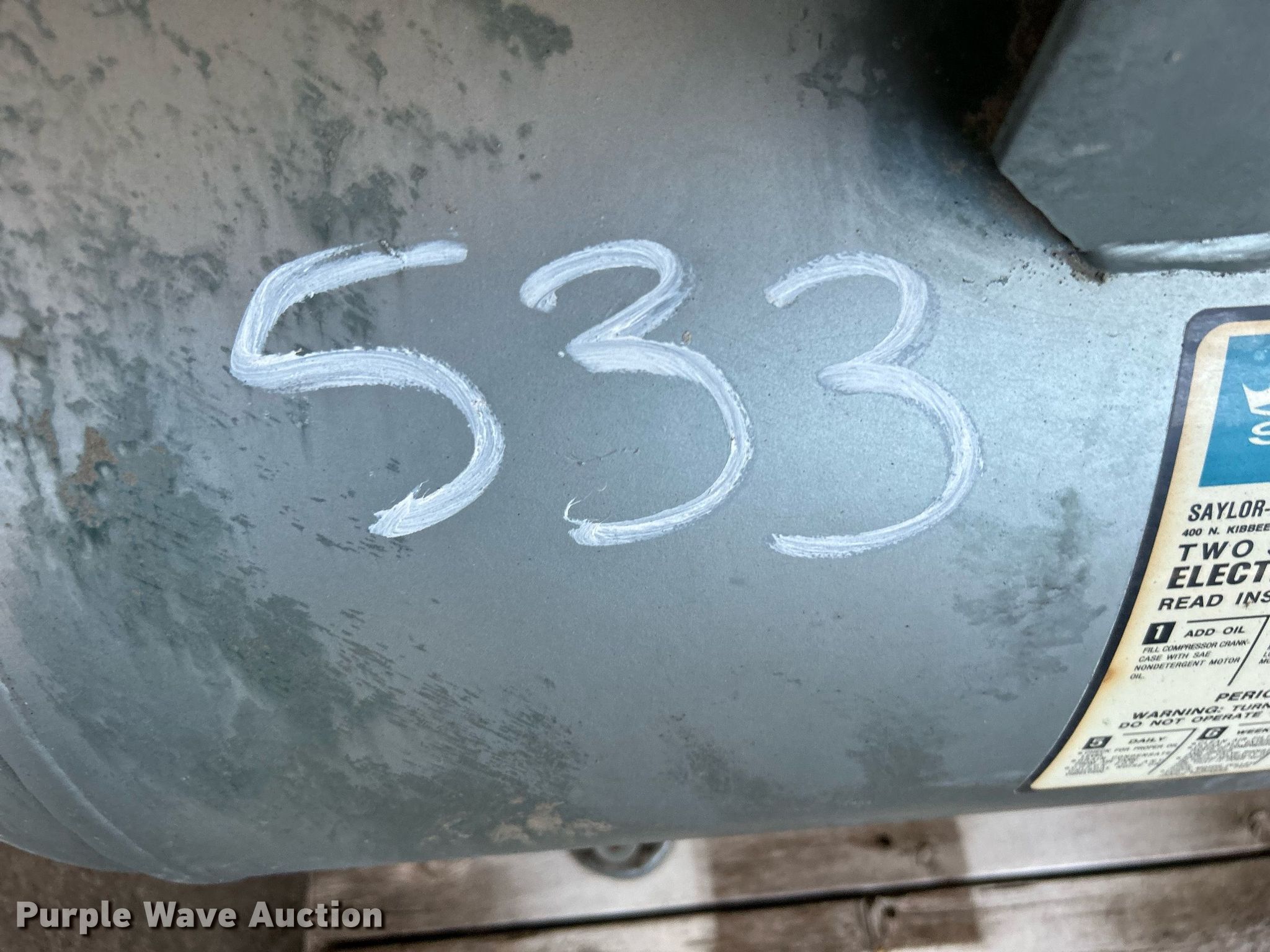 Purple Wave is selling a used Air Compressor in Oklahoma. This item is a Sayler Bell air compressor with the following: Tank capacity: 124 gallons, Skid mounted, Unit #: 533
