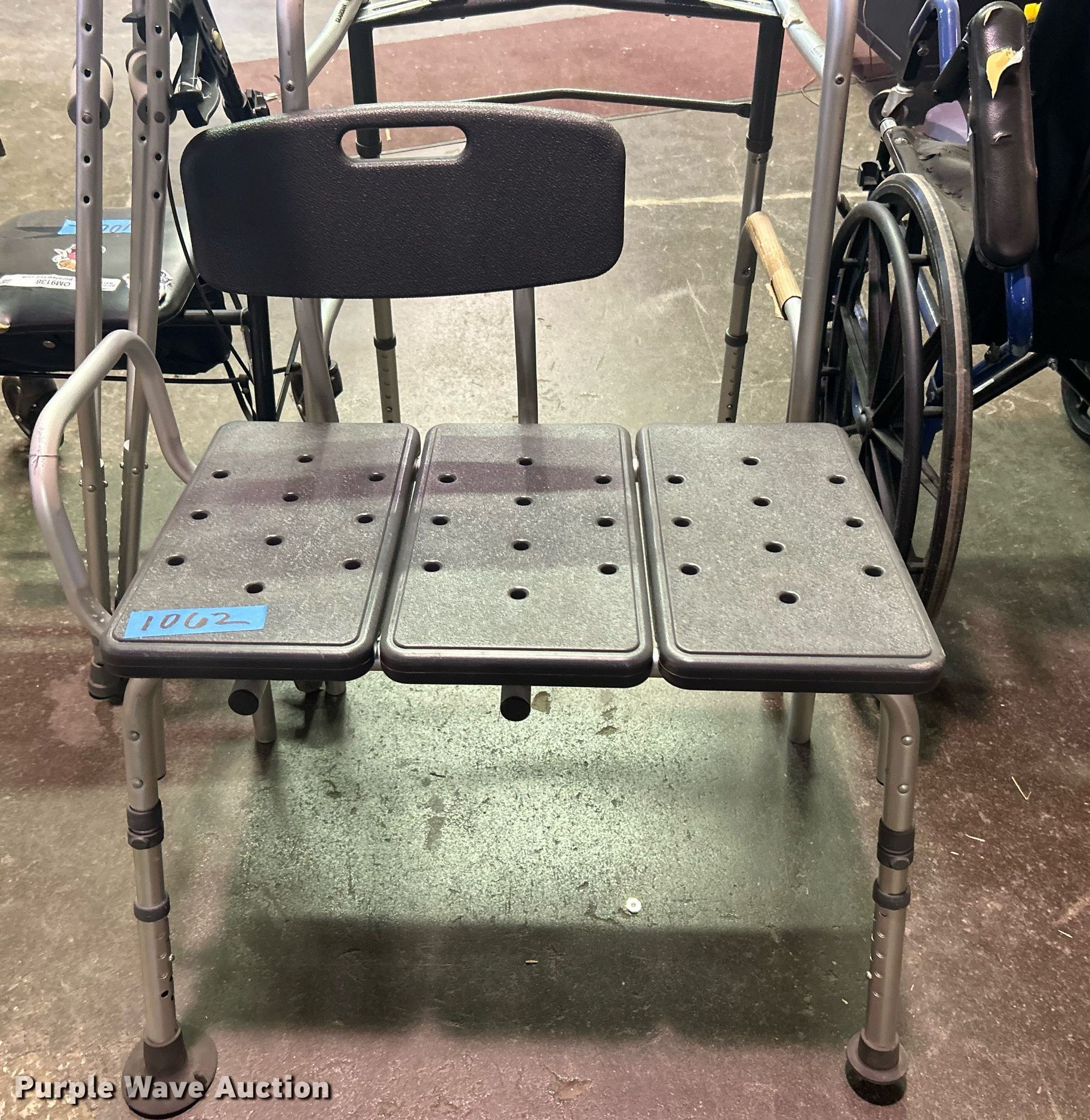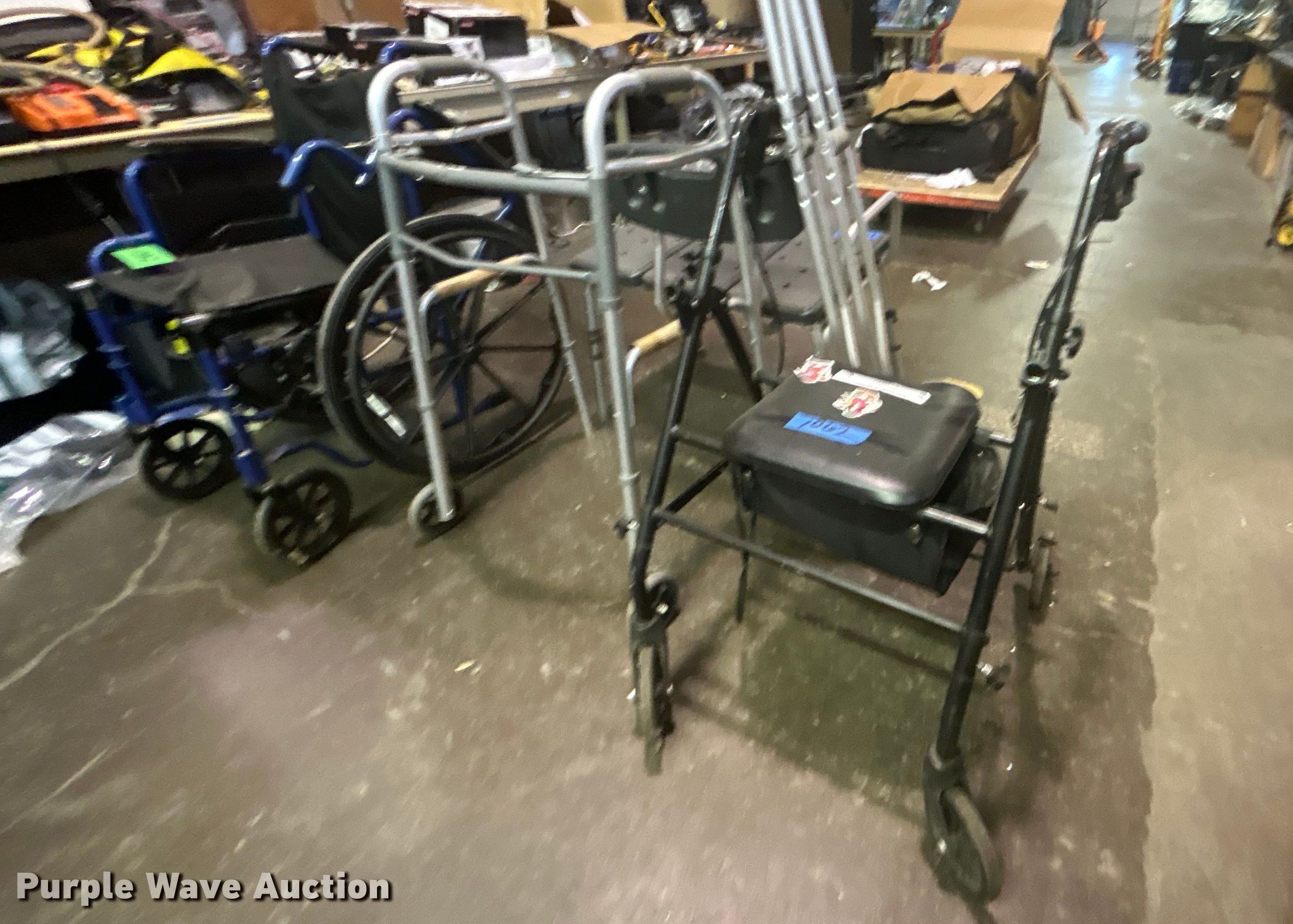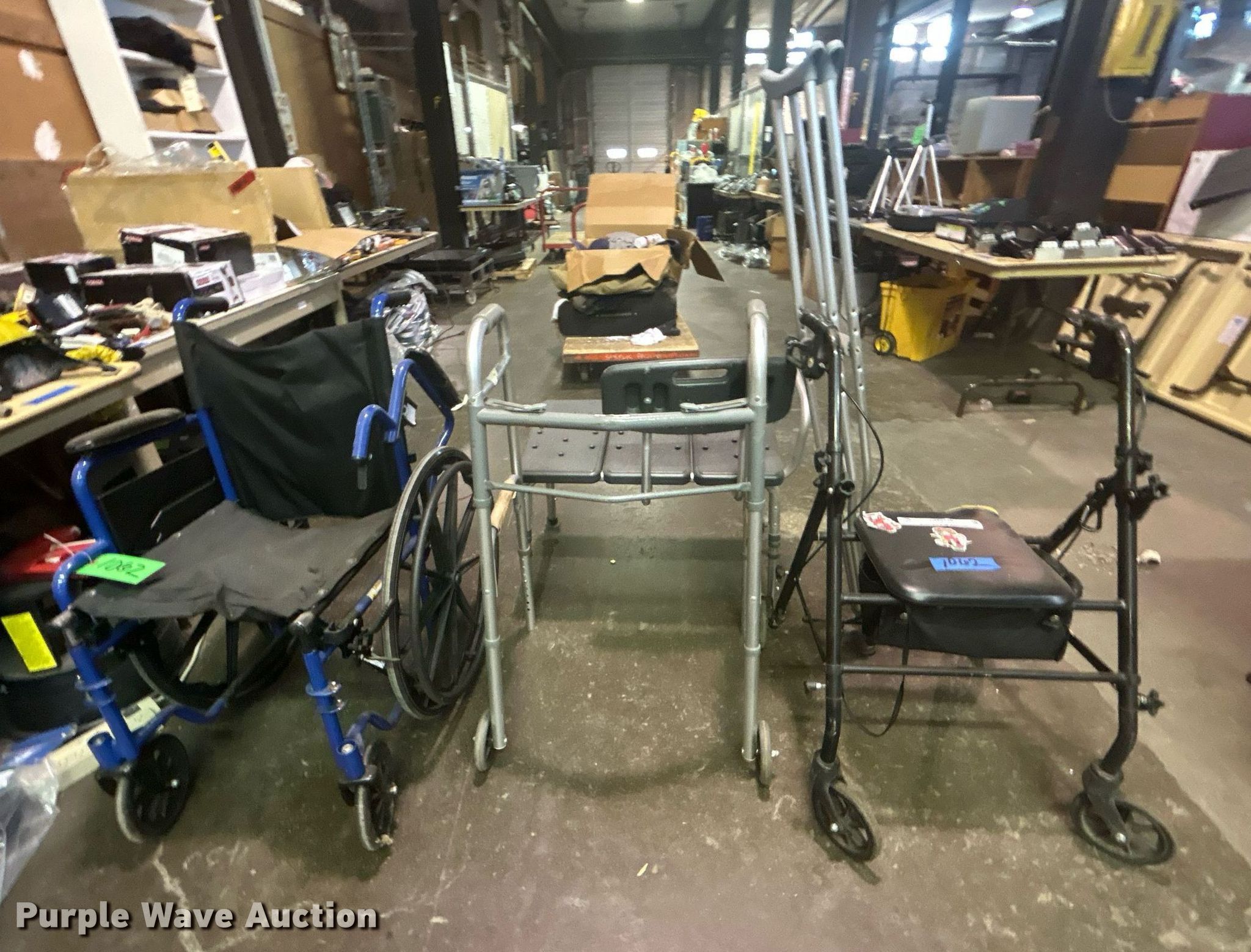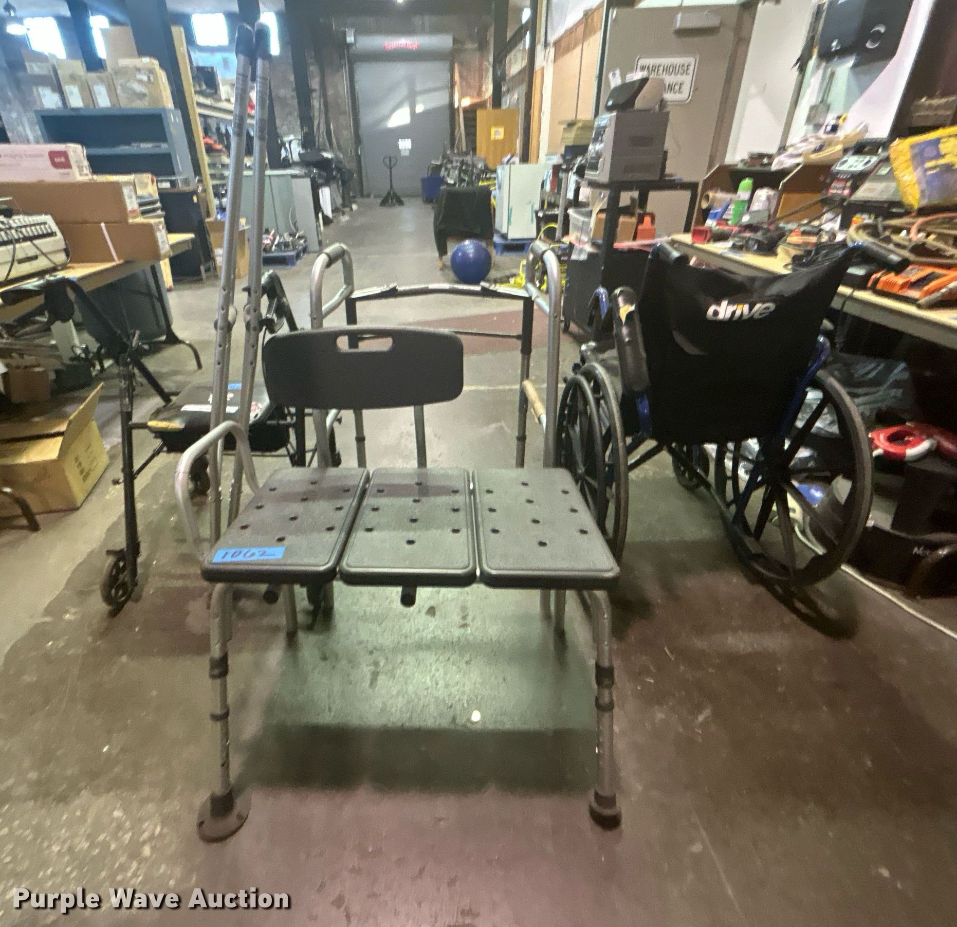 Purple Wave is selling a used Medical Equip. in Oklahoma. This item is a Medical supplies with the following: Wheelchair, Bath bench, Coasters missing, Walker, Crutches, Cane, Unit #: 1062