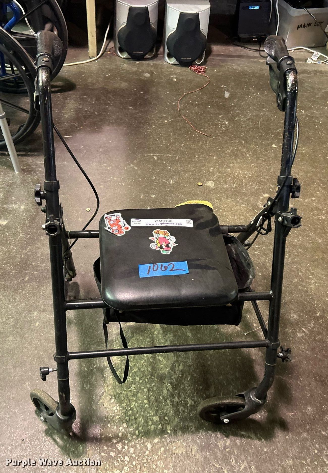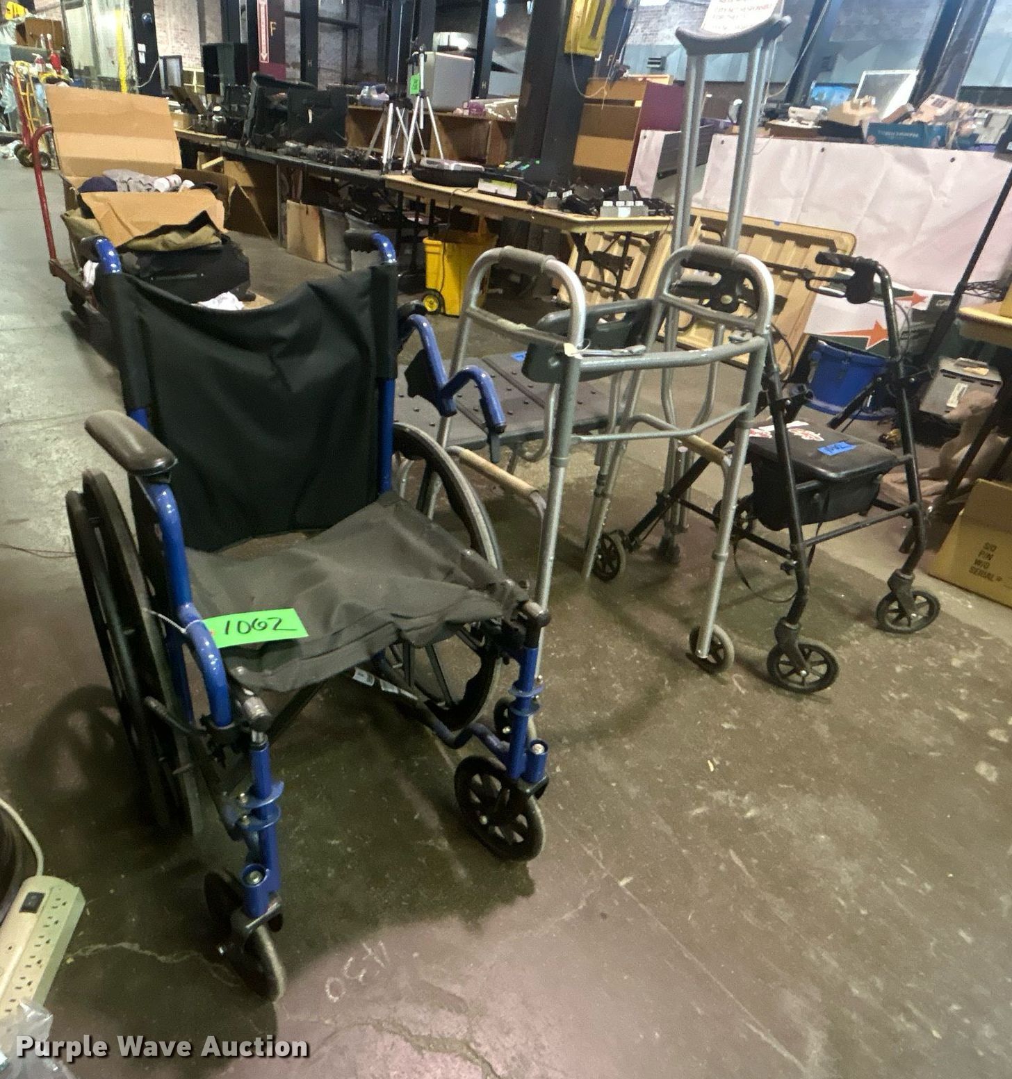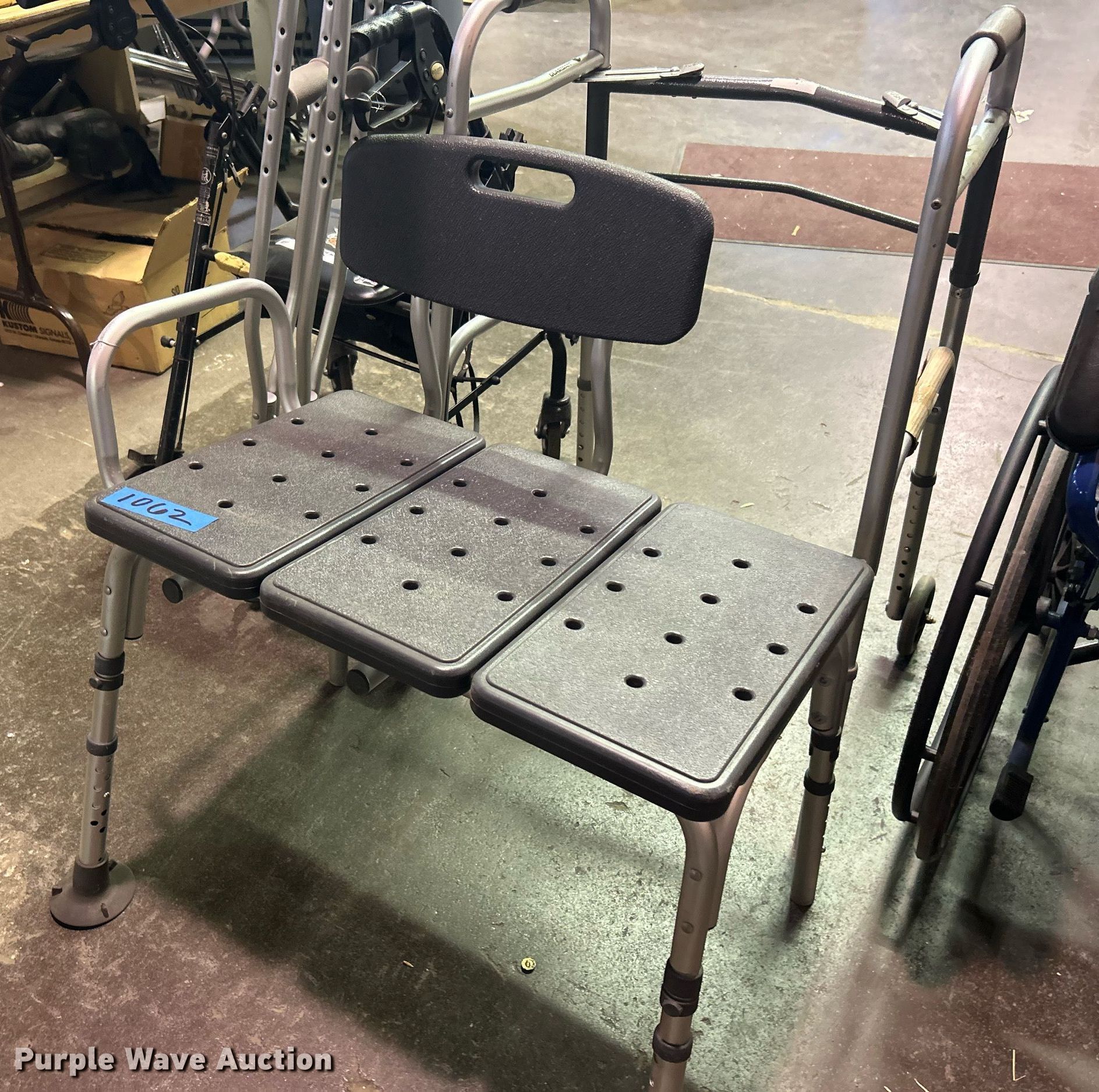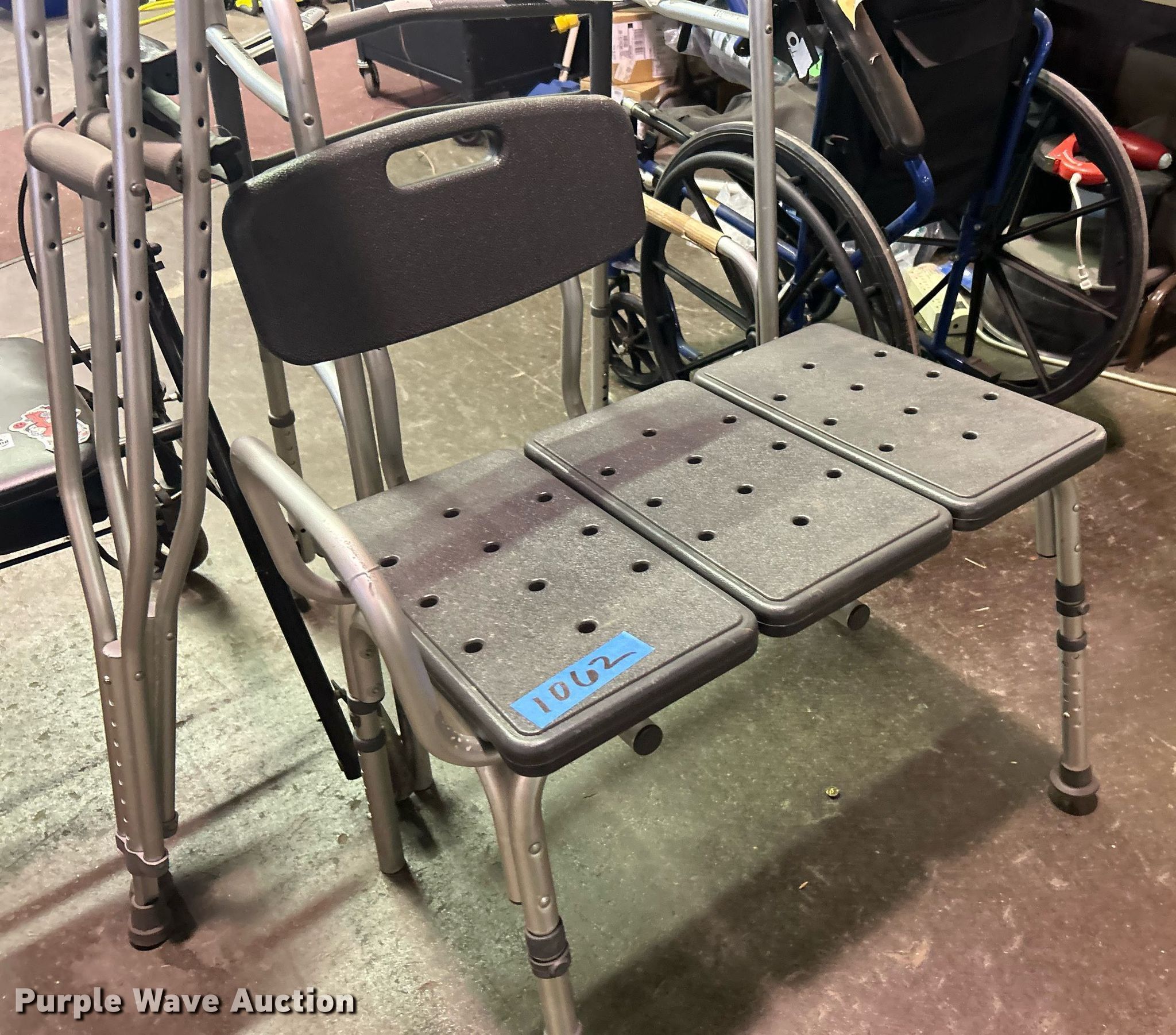 Purple Wave is selling a used Medical Equip. in Oklahoma. This item is a Medical supplies with the following: Wheelchair, Bath bench, Coasters missing, Walker, Crutches, Cane, Unit #: 1062