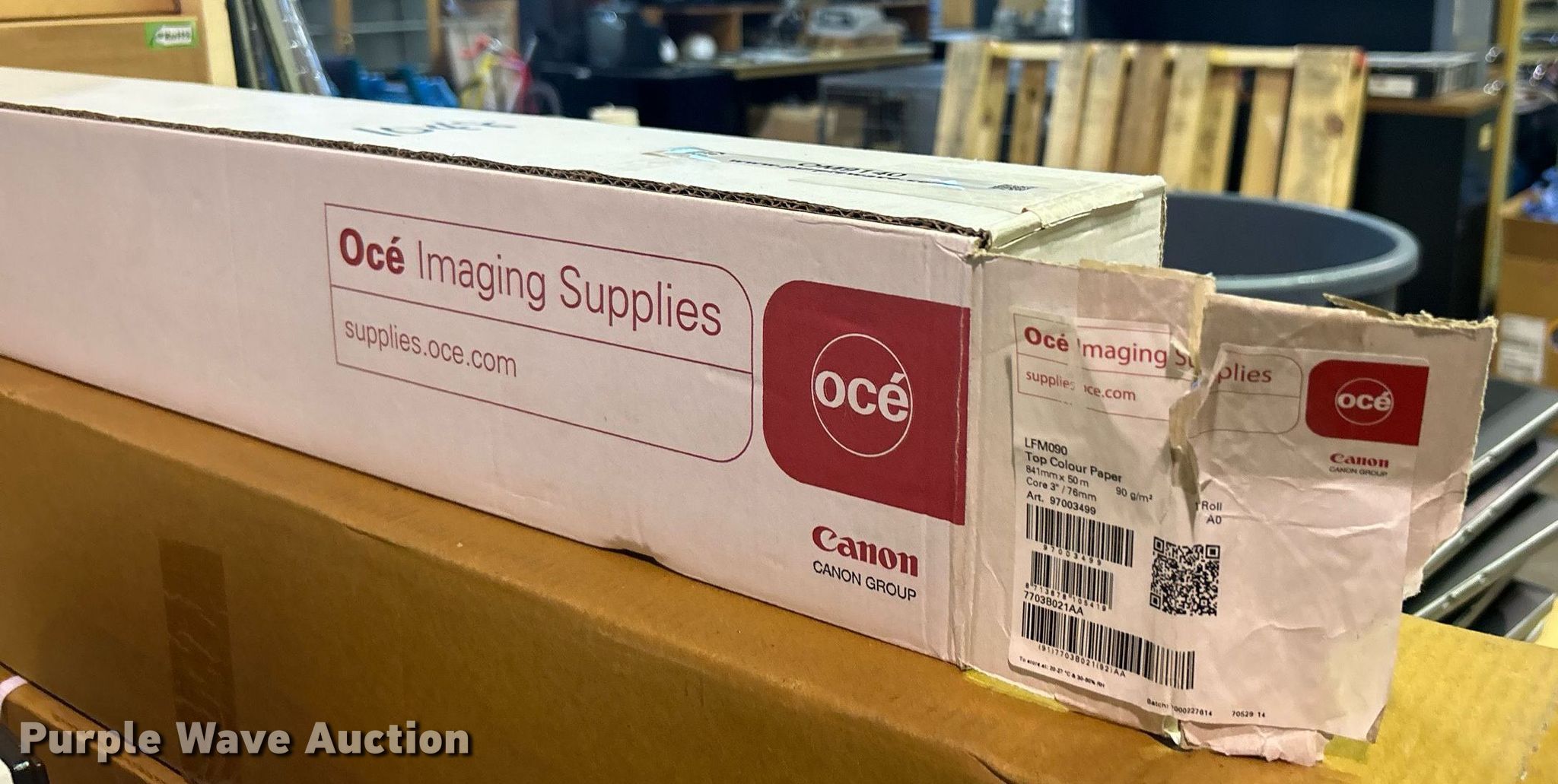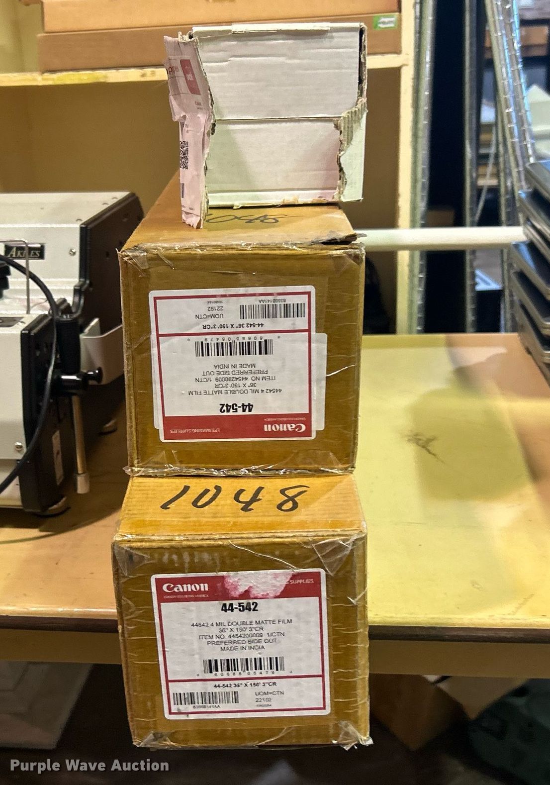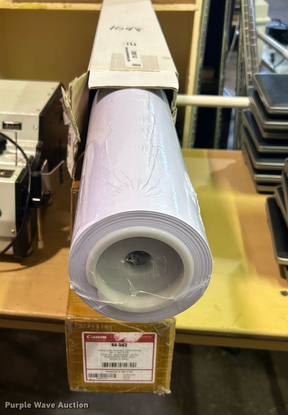 Purple Wave is selling a used Office Supplies and Equip. in Oklahoma. This item is a Canon plot paper with the following: (2) 44-542, 4 MIL double matte film, LFM090 Top Colour paper, Unit #: 1048