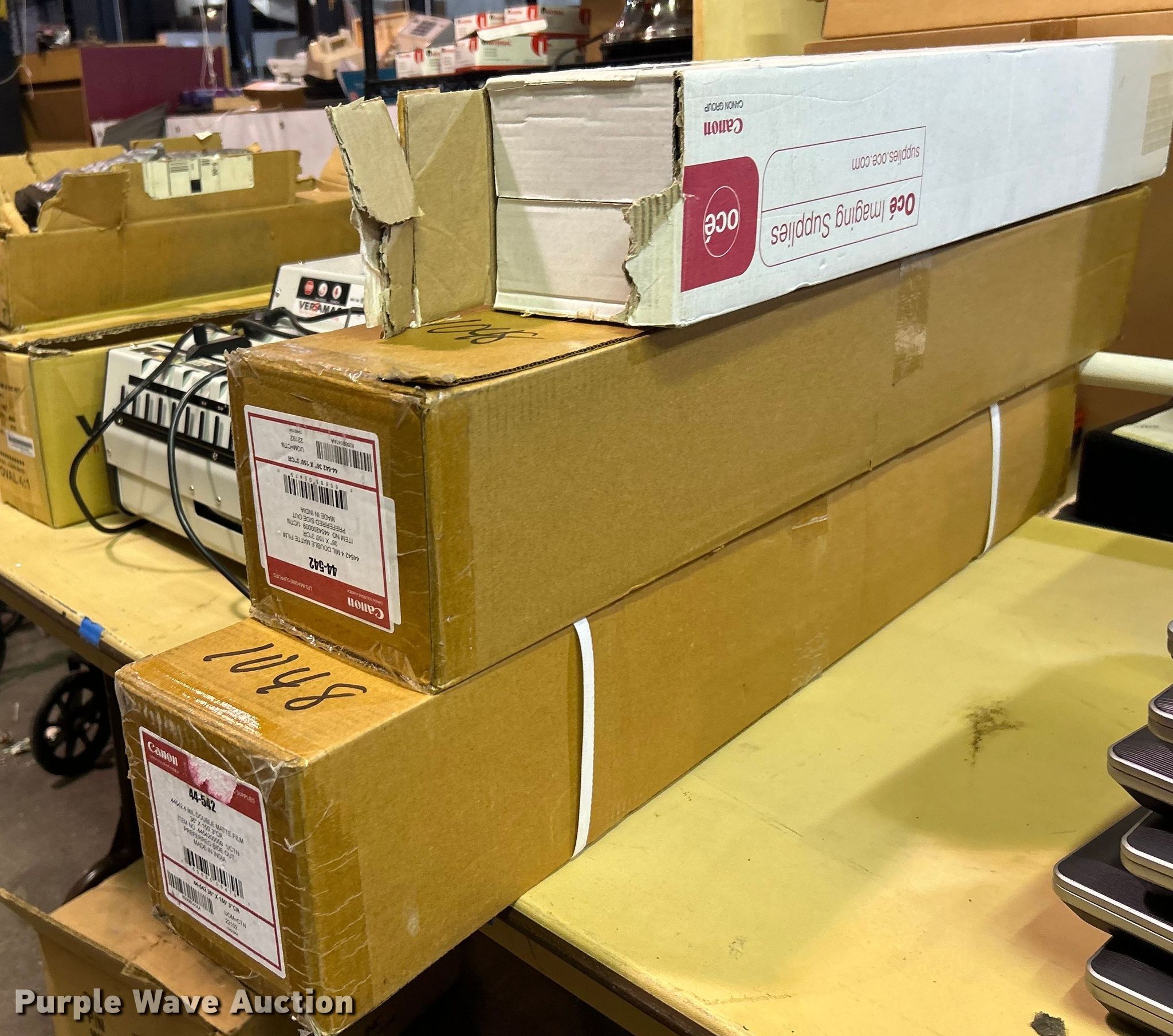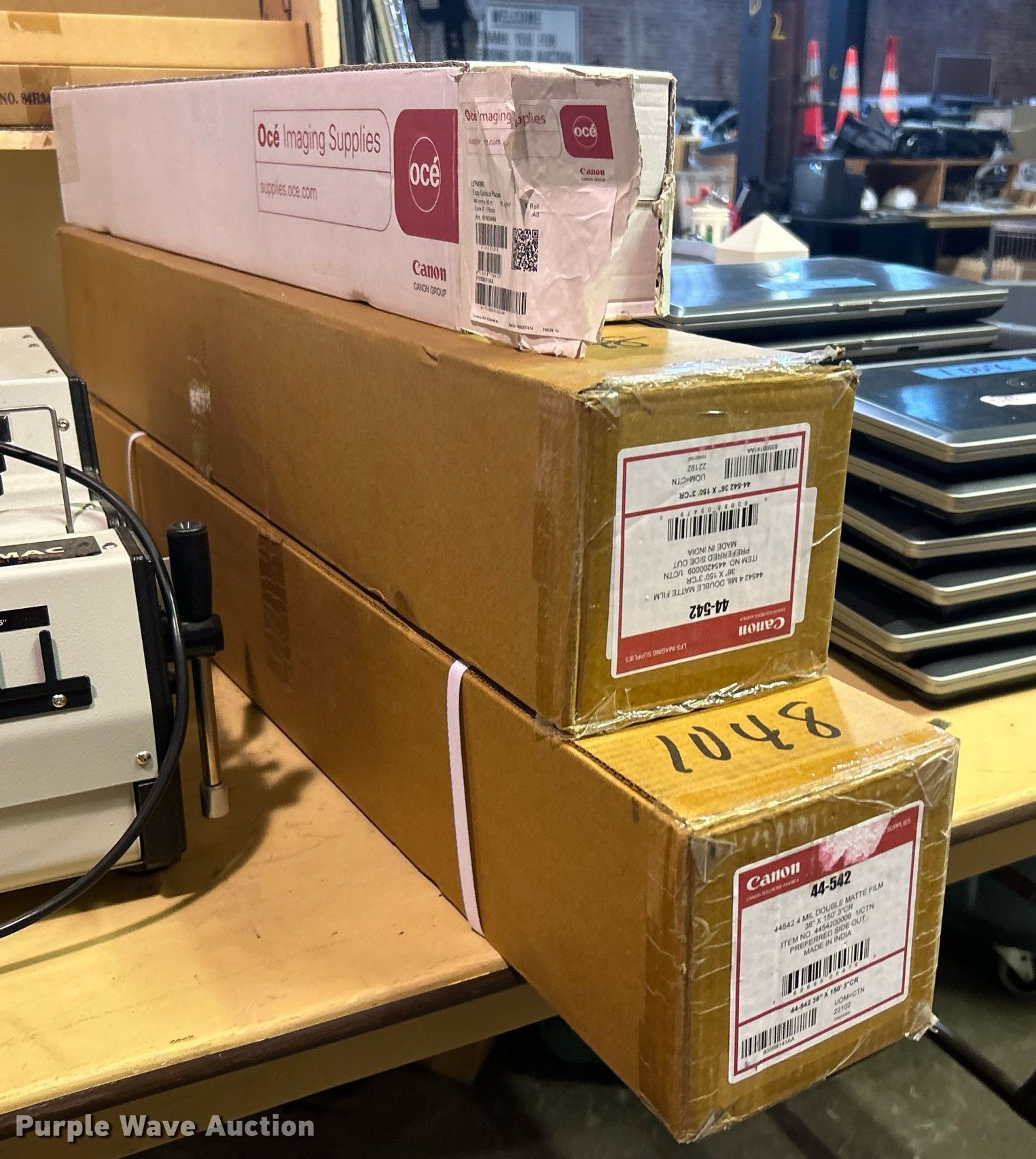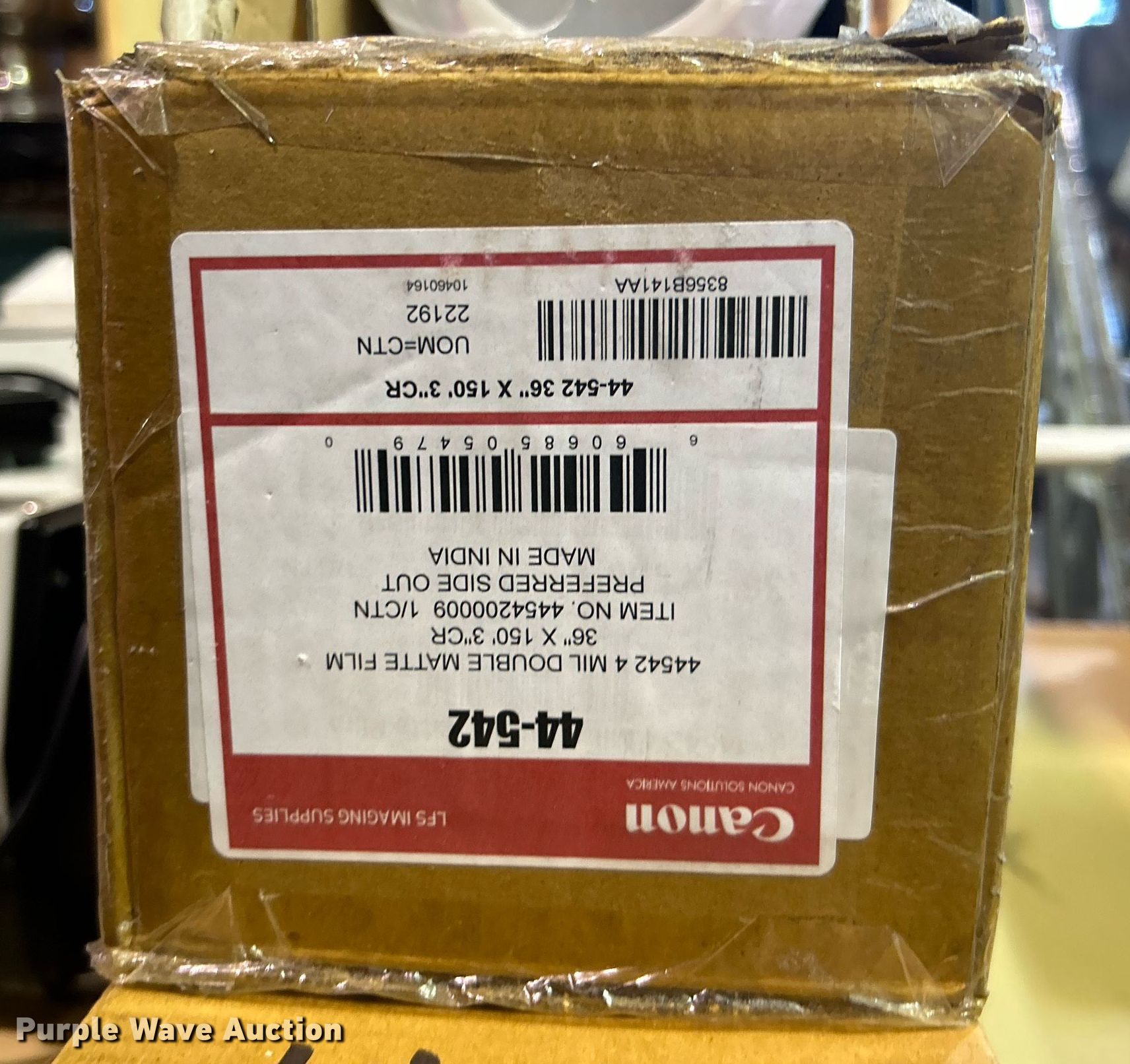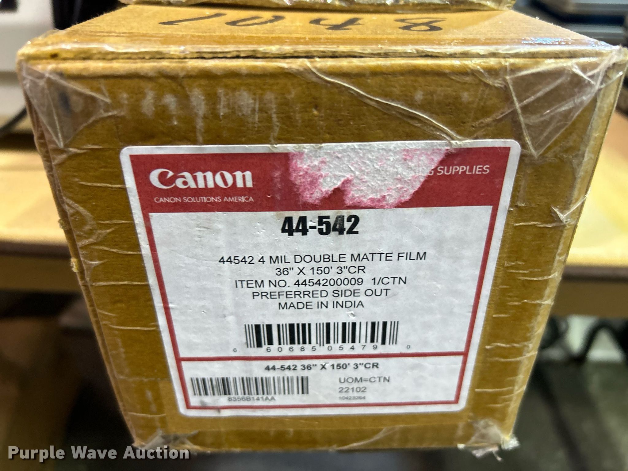 Purple Wave is selling a used Office Supplies and Equip. in Oklahoma. This item is a Canon plot paper with the following: (2) 44-542, 4 MIL double matte film, LFM090 Top Colour paper, Unit #: 1048