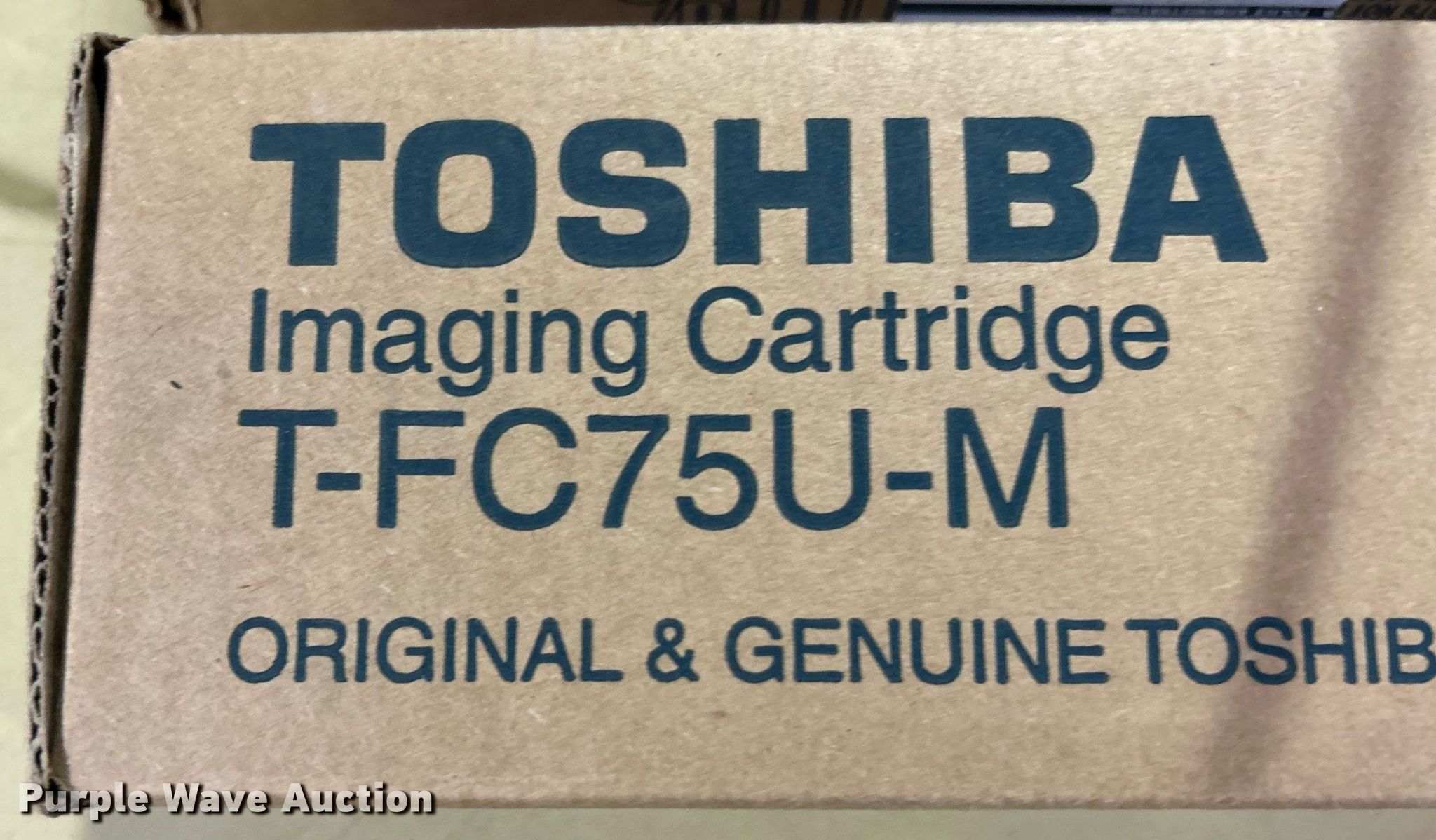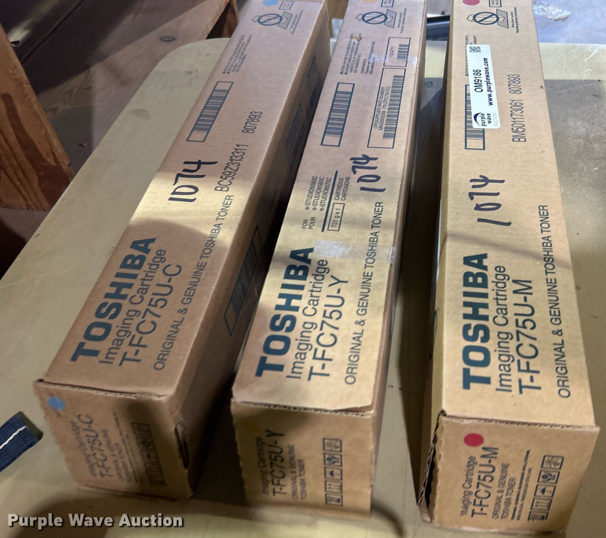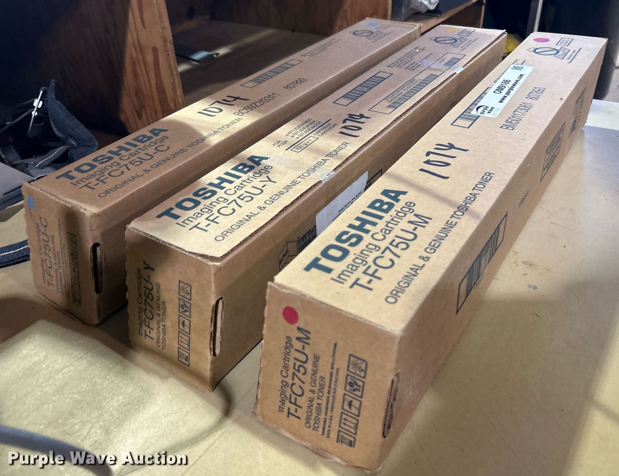 Purple Wave is selling a used Office Supplies and Equip. in Oklahoma. This item is a Toshiba imaging cartridges with the following: T-FC75U-C, T-FC75U-Y, T-FC75U-M, Unit #: 1074