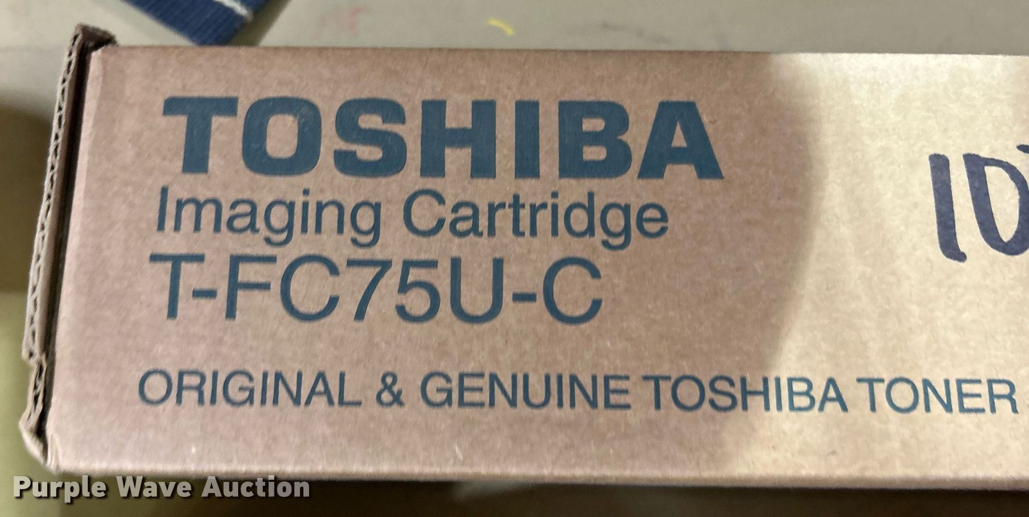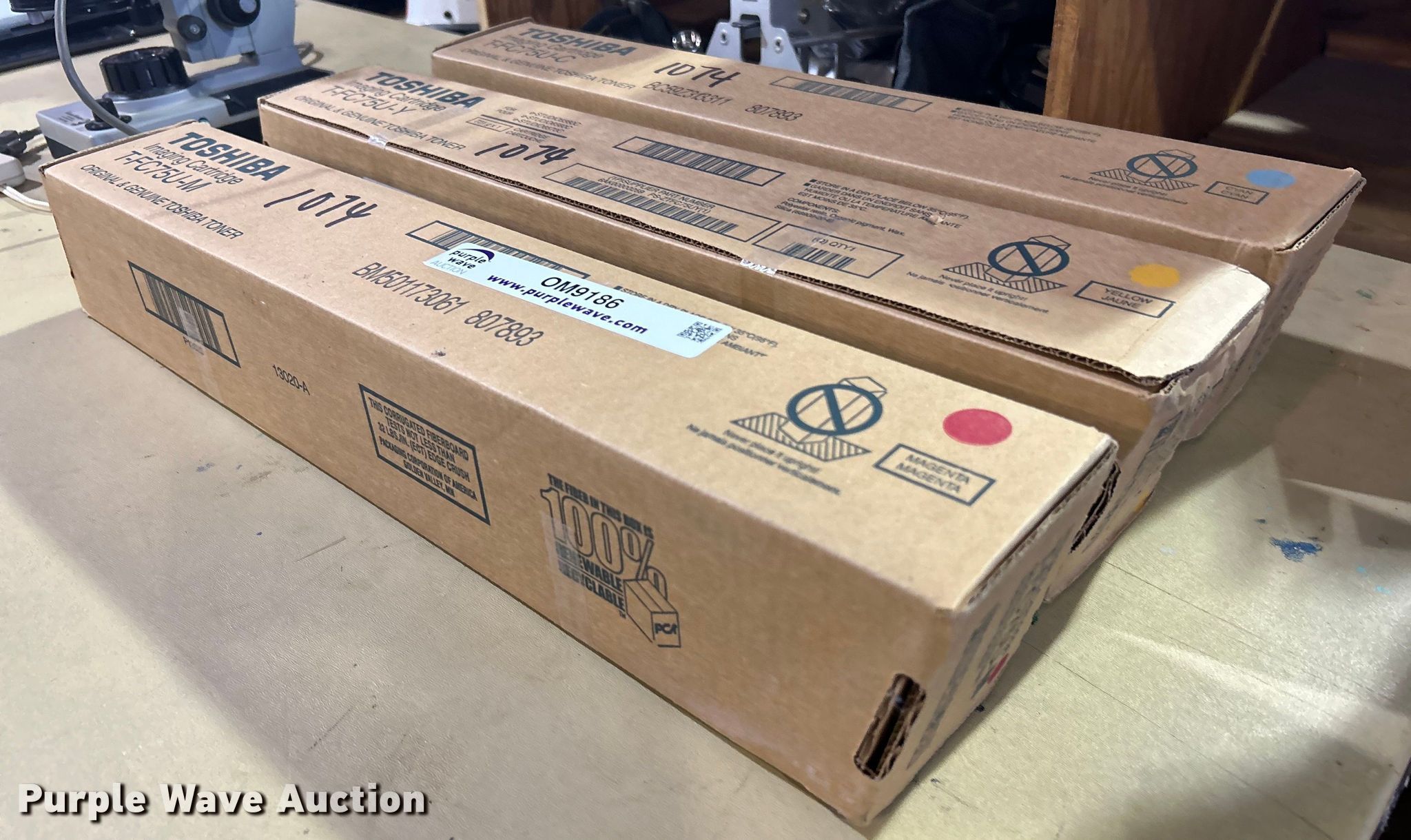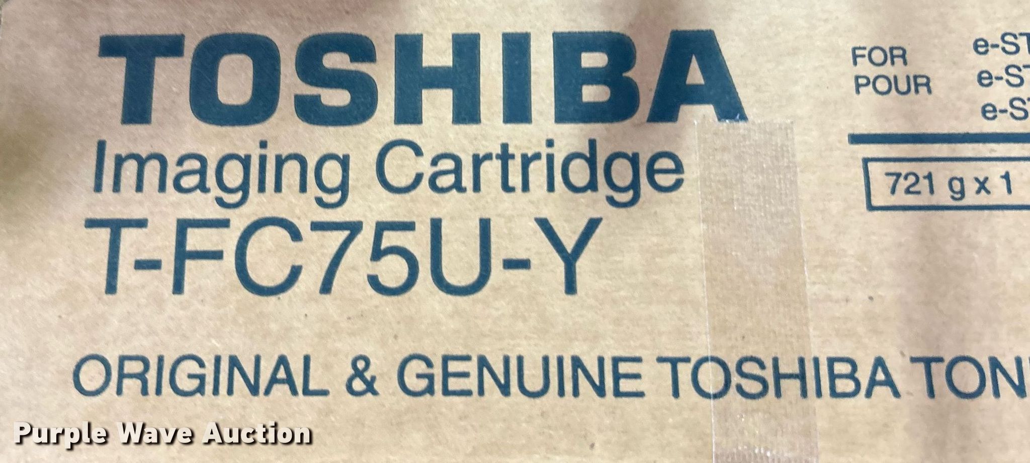 Purple Wave is selling a used Office Supplies and Equip. in Oklahoma. This item is a Toshiba imaging cartridges with the following: T-FC75U-C, T-FC75U-Y, T-FC75U-M, Unit #: 1074