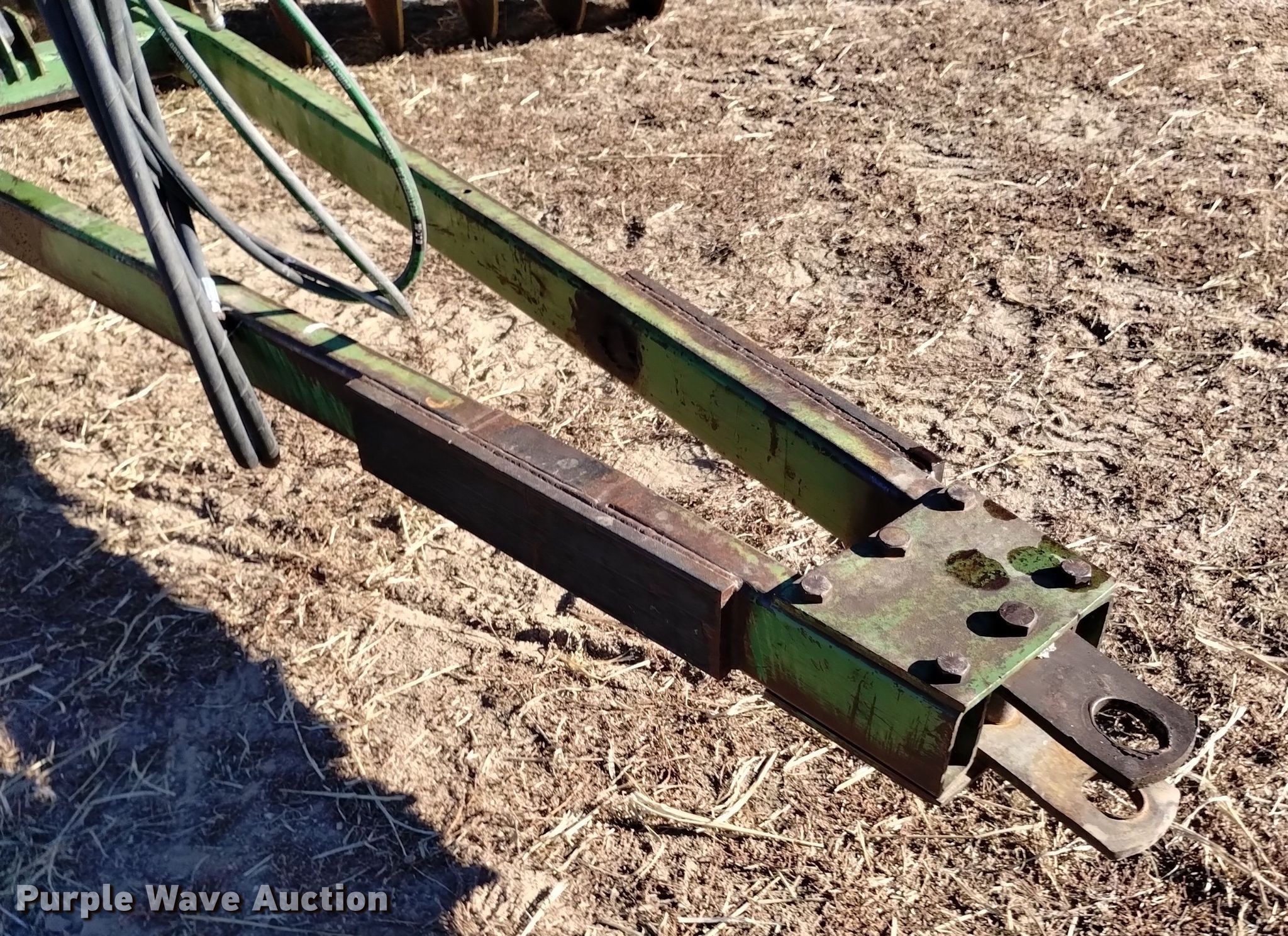 John Deere 230 double off-set disk. Overall width: 22', Serial: 020953. Features Front blades Diameter: 20", Spacing: 9", Rear blades Diameter: 20", Spacing: 9", Disk scrapers, Operation Hydraulic lift, Hydraulic fold, Leveler: Manual, Walking tandem axle, Attachments Tine harrow Harrow bars: 3.. Tires Tire size: 11L-15SL. Notes Axle issues. Carpenter, WY 82054