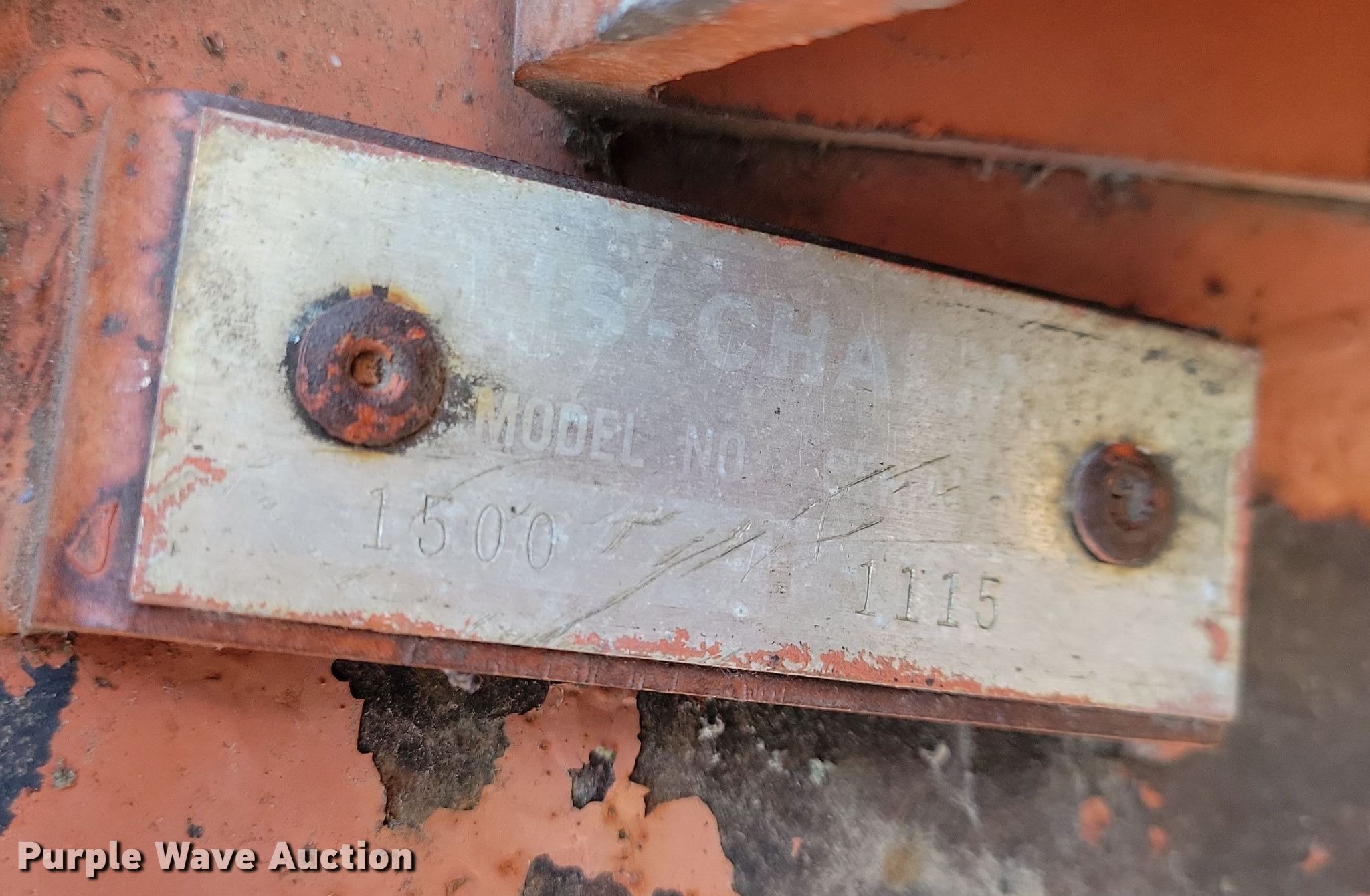 Allis Chalmers 1500 disk ripper. Overall width: 12', Serial: 1115. Features Blade diameter Front: 19", Spacing: 8", Disk scrapers, Rippers: 9 Length: 20", Spacing: 14", Operation Hydraulic lift. Tires Tire size: 11L-15SL. Notes Parts included. Tiernan Bros Farm Retirement. Woodward, IA 50276