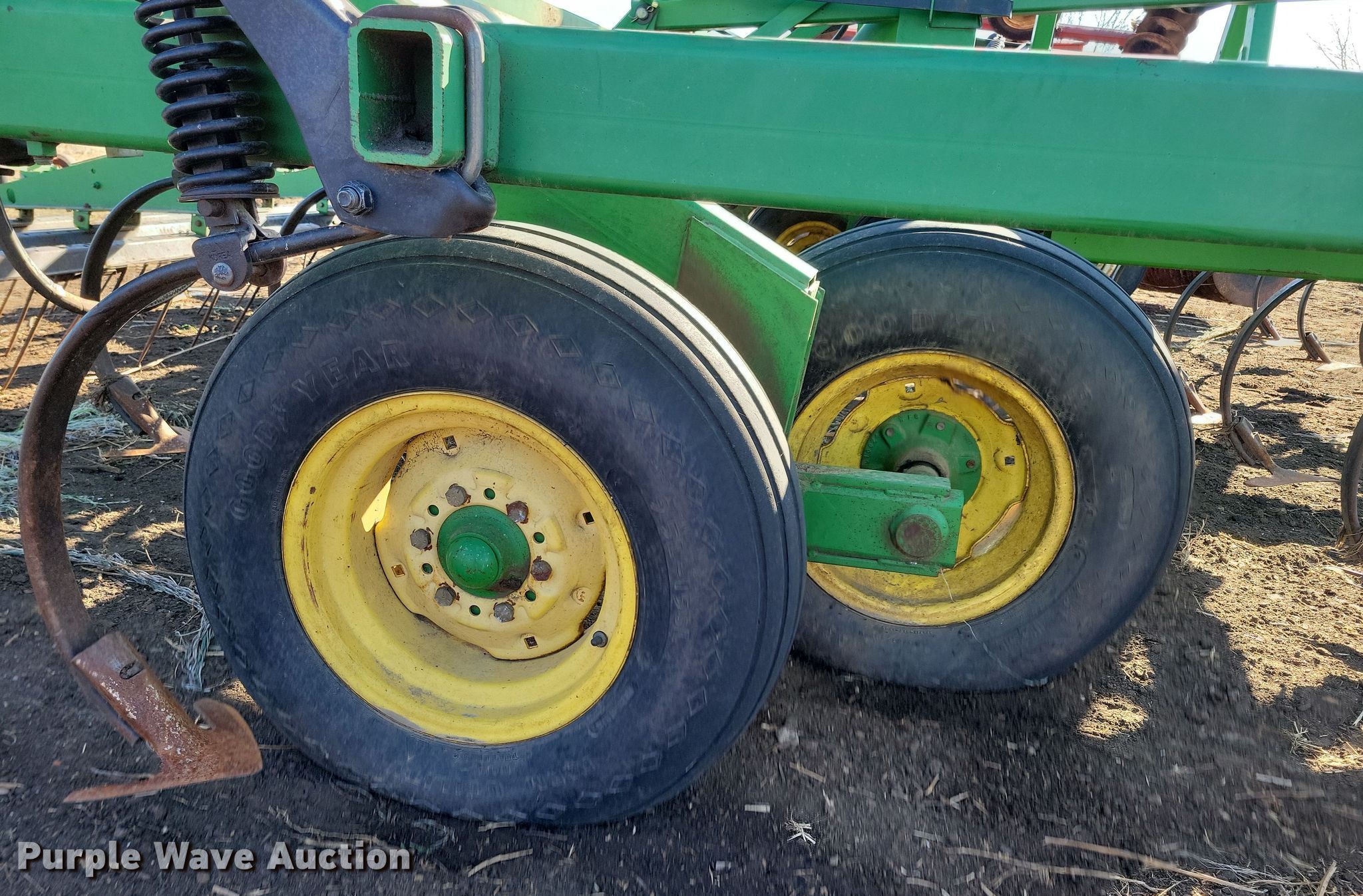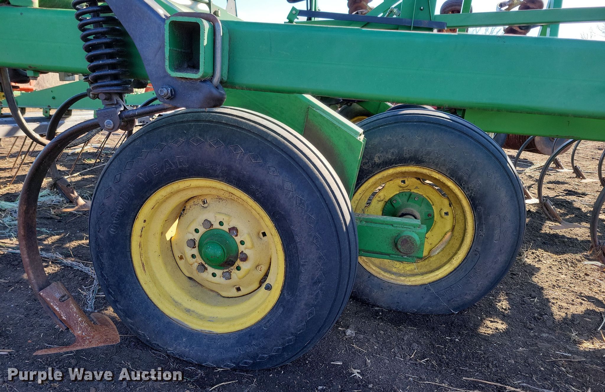 John Deere field cultivator. Overall width: 35' 8", Serial: N00980X010007. Features Shanks: 72, Sweep width: 9.5", Operation Hydraulic lift, Hydraulic fold, Walking tandem axle, Attachments Harrow bars: 6. Tires Tire size: 9.5L-15SL. Tiernan Bros Farm Retirement. Woodward, IA 50276