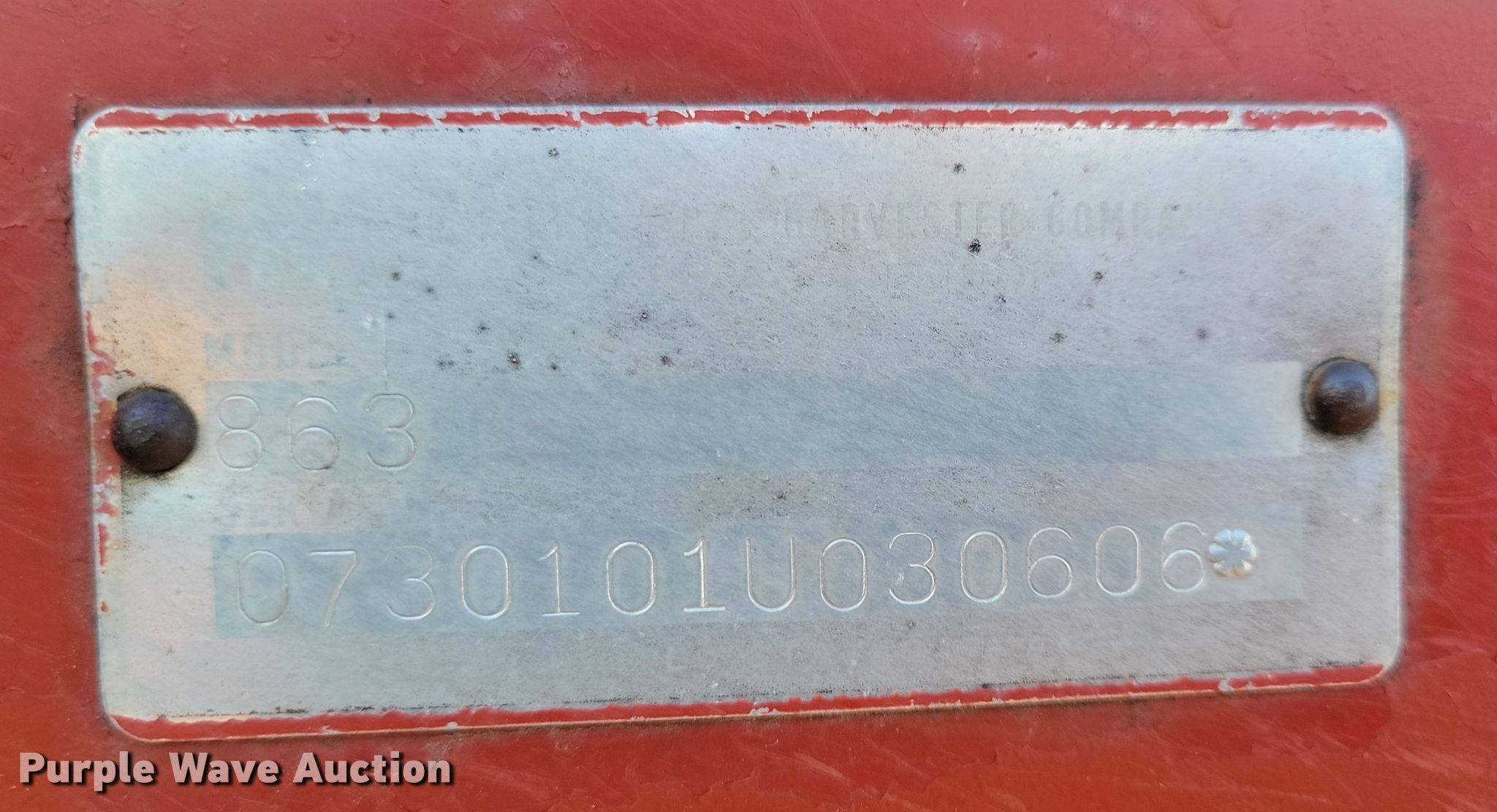 International 863 corn head. Serial: 0730101U030606. Features Rows: 6, Row spacing: 30", Drivelines: Dual. Tiernan Bros Farm Retirement. Woodward, IA 50276