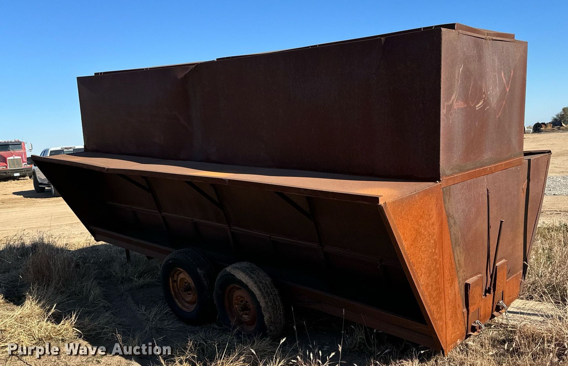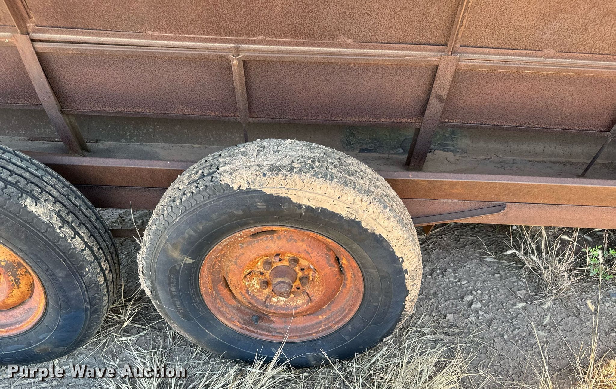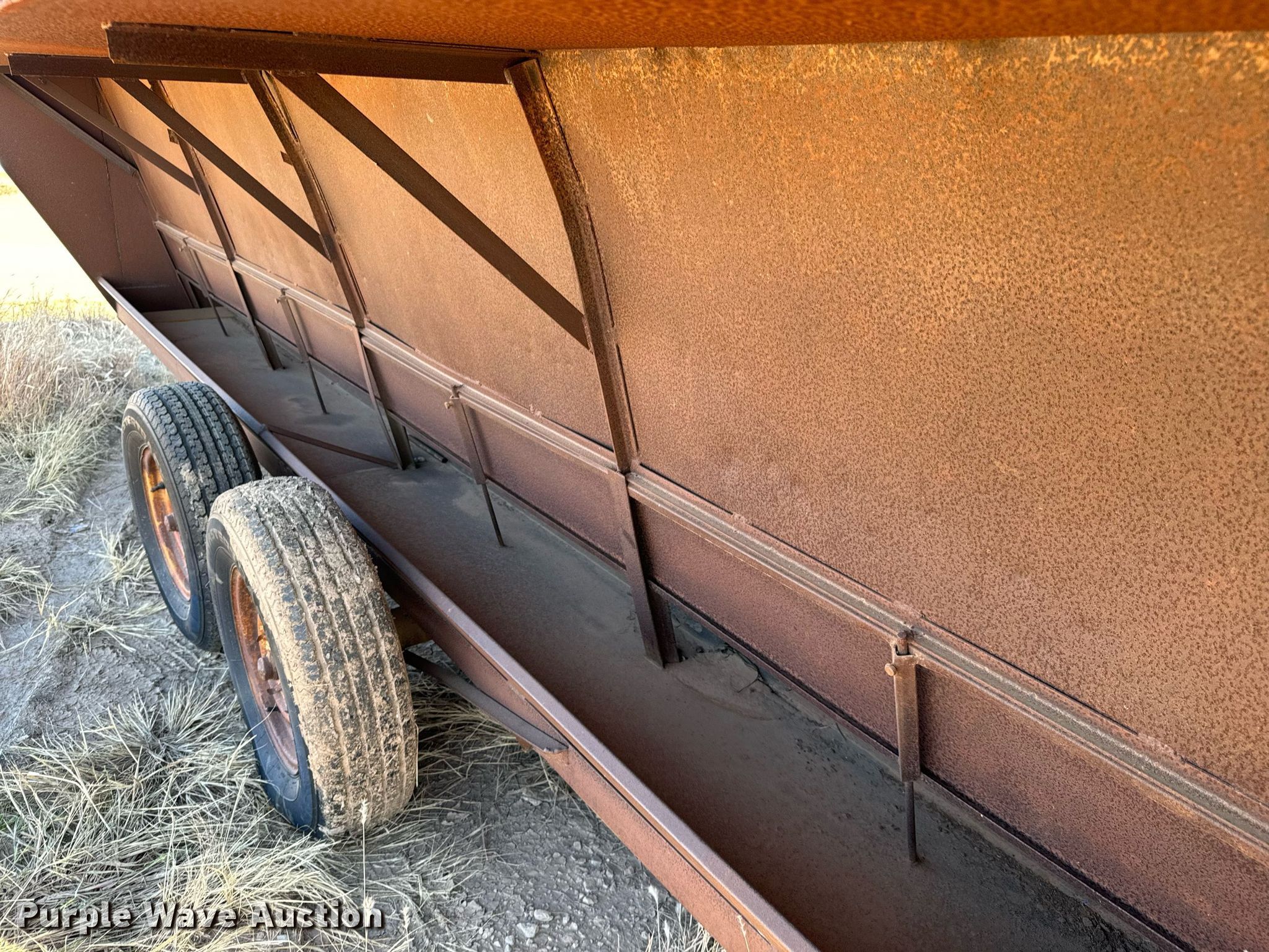 Purple Wave is selling a used Livestock Equip. in Oklahoma. This item is a Shop built creep feeder with the following: Overall: 19' 6" L x 94" W, Tires: 225/75R15