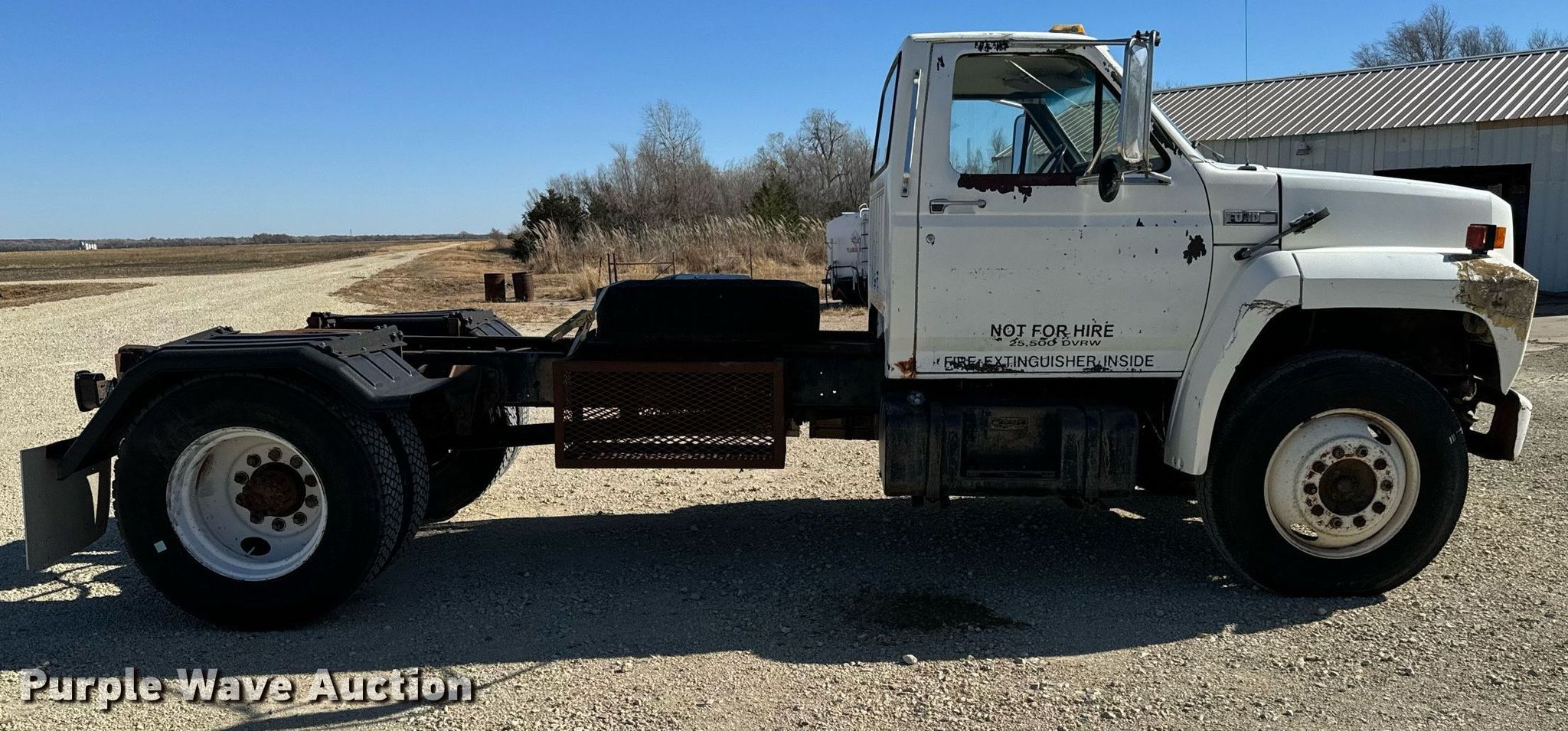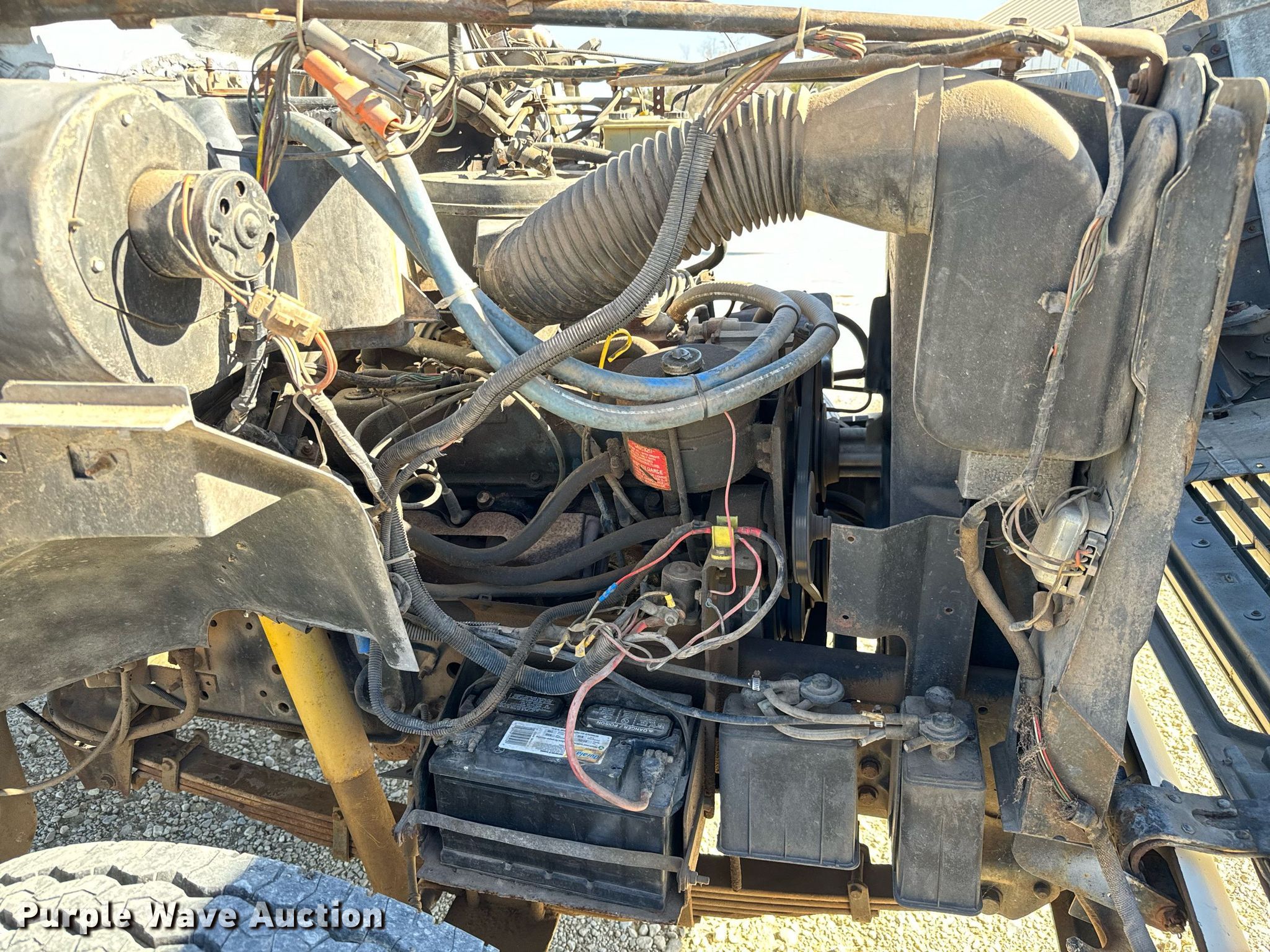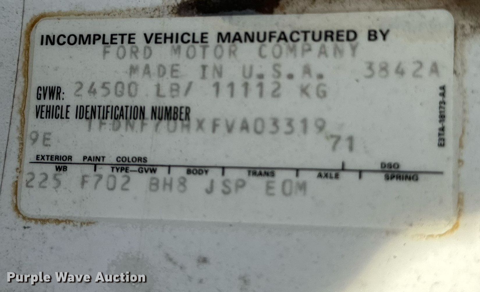1985 Ford F700 truck cab and chassis. Miles: 144,684 on odometer, VIN: 1FDNF70HXFVA03319. Engine Displacement: 6.1L, Cylinders: 8, Fuel type: Gas. Transmission Manual, Speed: 5, plus 2. Chassis Axles: Single, Suspension: Spring, Brakes: Hydraulic, Truck chassis: 10' 8", GVWR: 24,500 lbs. Interior Heat. Features Deck plate: Steel, Fuel tank: Dual, Hitch: Gooseneck. Tires Front: 10R22.5, Rear: 295/75R22.5. Notes Windshield chipped or cracked, Gooseneck hitch , Drivers side window crank issues. Kansas title. Title distribution may be delayed up to 14 days from verification of funds. Phoenix Equipment. Nickerson, KS 67561