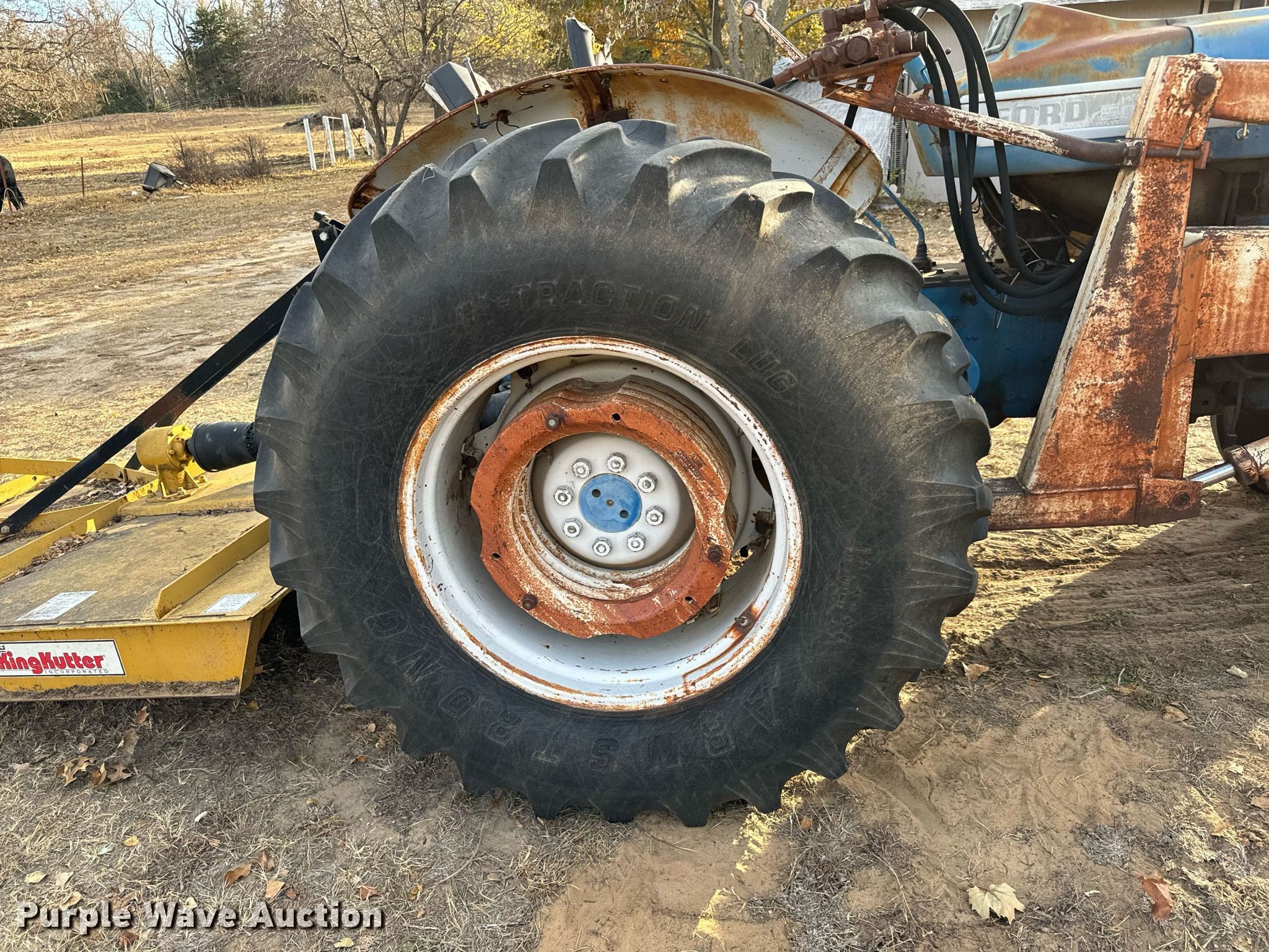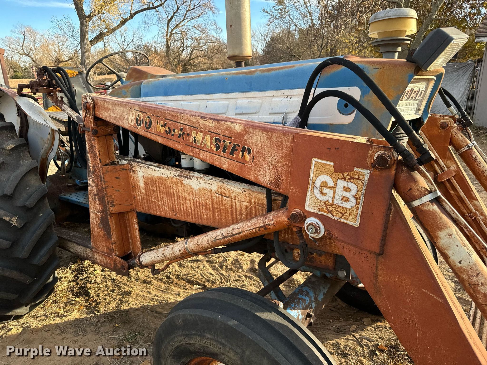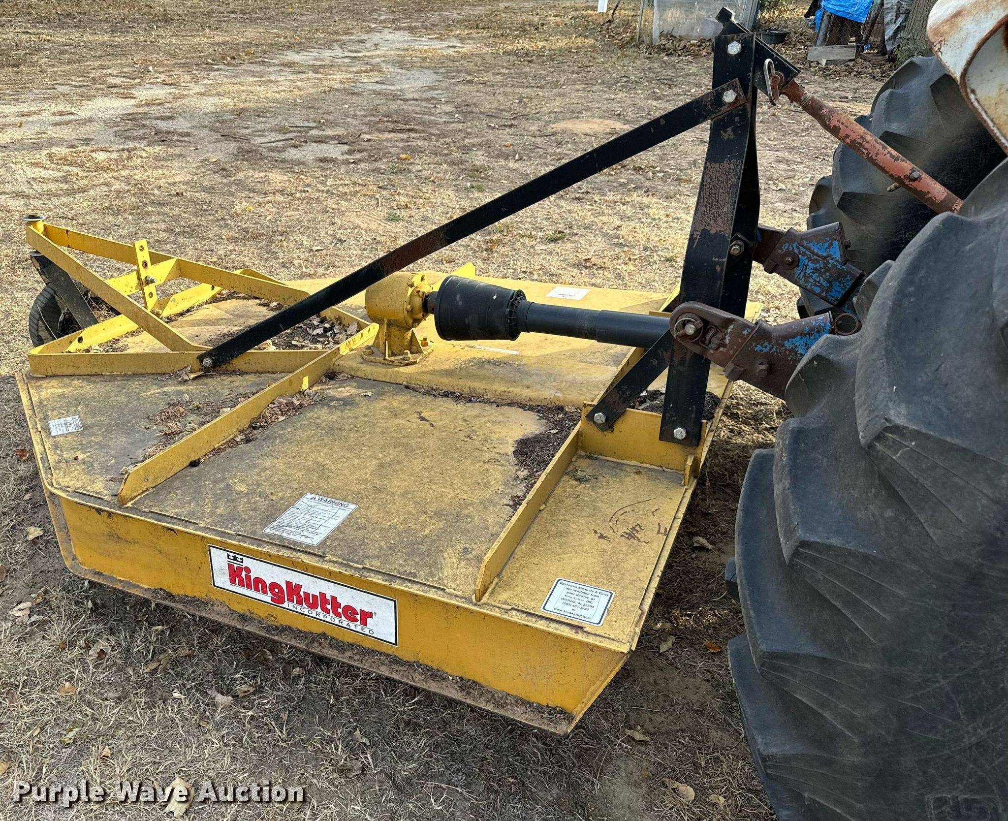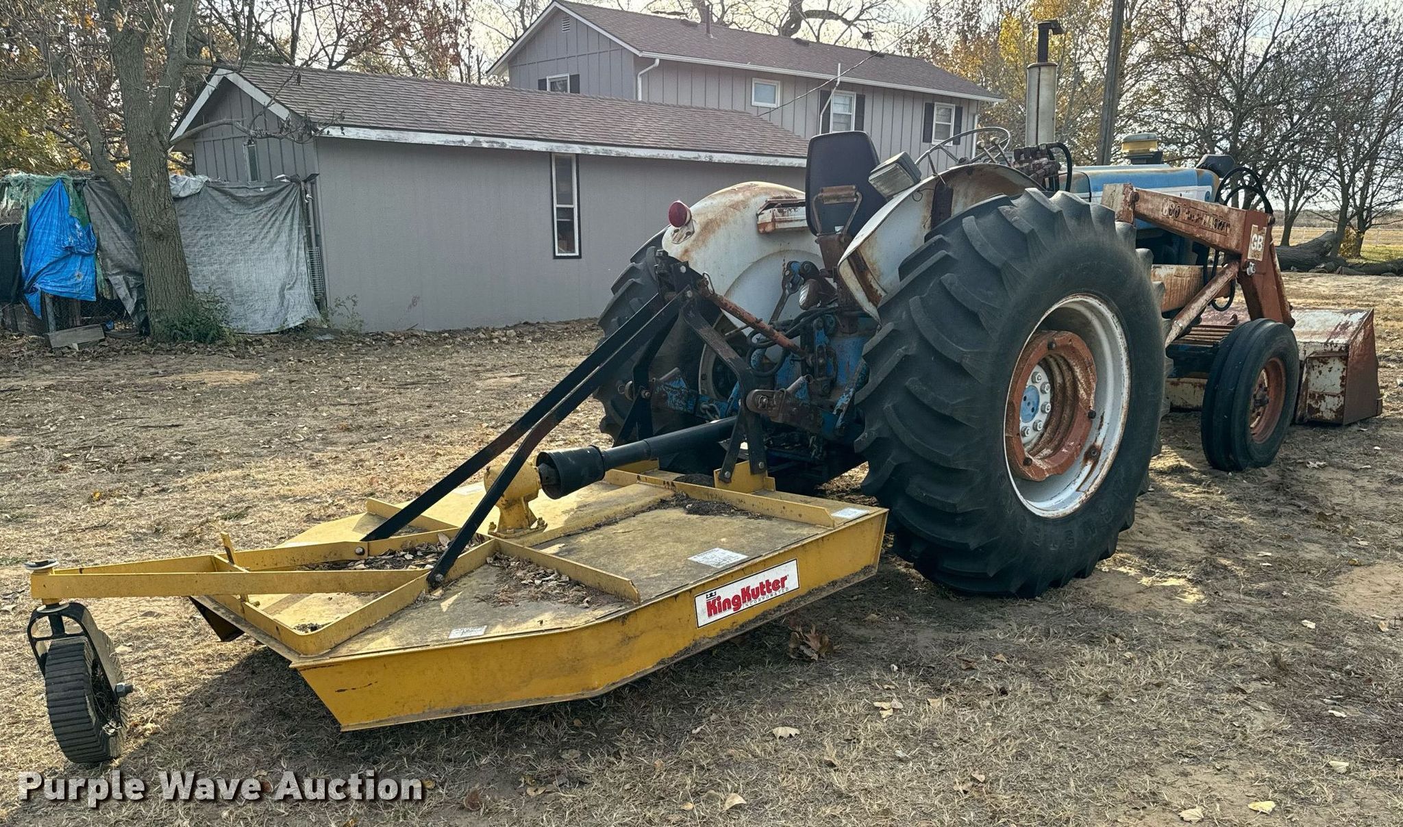 Ford 5000 tractor. Hours: 386 on meter, Serial: 7016. Engine Ford, Displacement: 3.8L, Cylinders: 4, Fuel type: Diesel. Transmission Manual, 8F - 2R. Features PTO: 540, Three point Top link, Hydraulic remote sets Rear: 1, Loader GB 800 Work-Master , Controls: Two-lever, Bucket Width: 60", Rotary mower King Kutter L-72-40-PYK, Width: 6', PTO: 540, TIres: Solid. Tires Front: 7.50-16, Rear: 18.4-30, Wheel weights: 8. Notes Unknown operating condition of hour meter. 7900 N Plum. Hutchinson, KS 67502