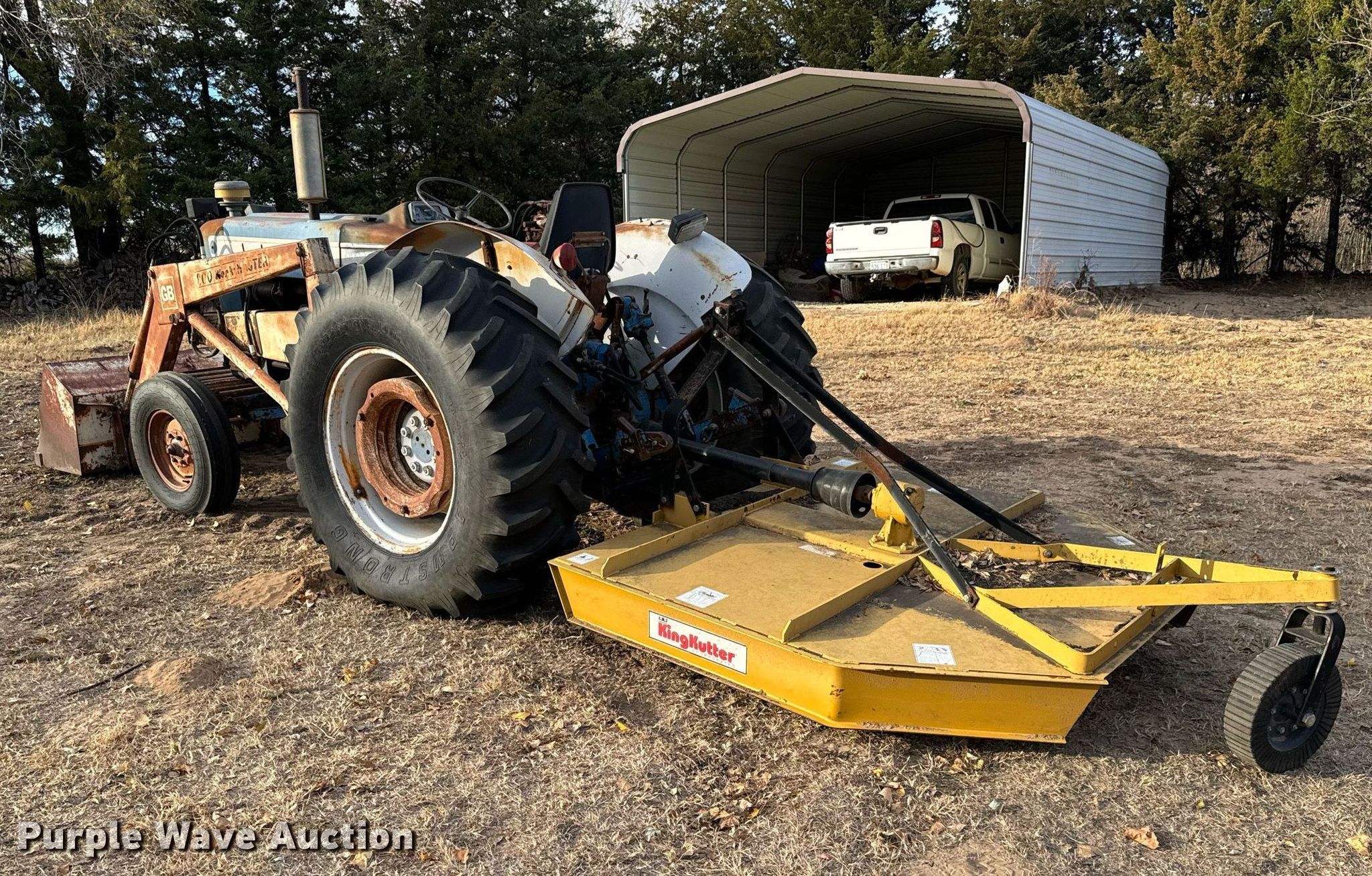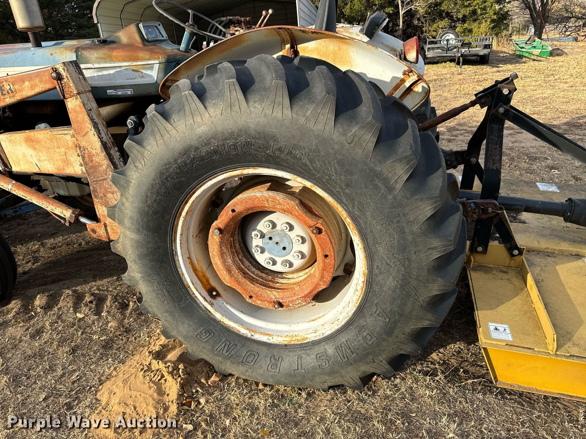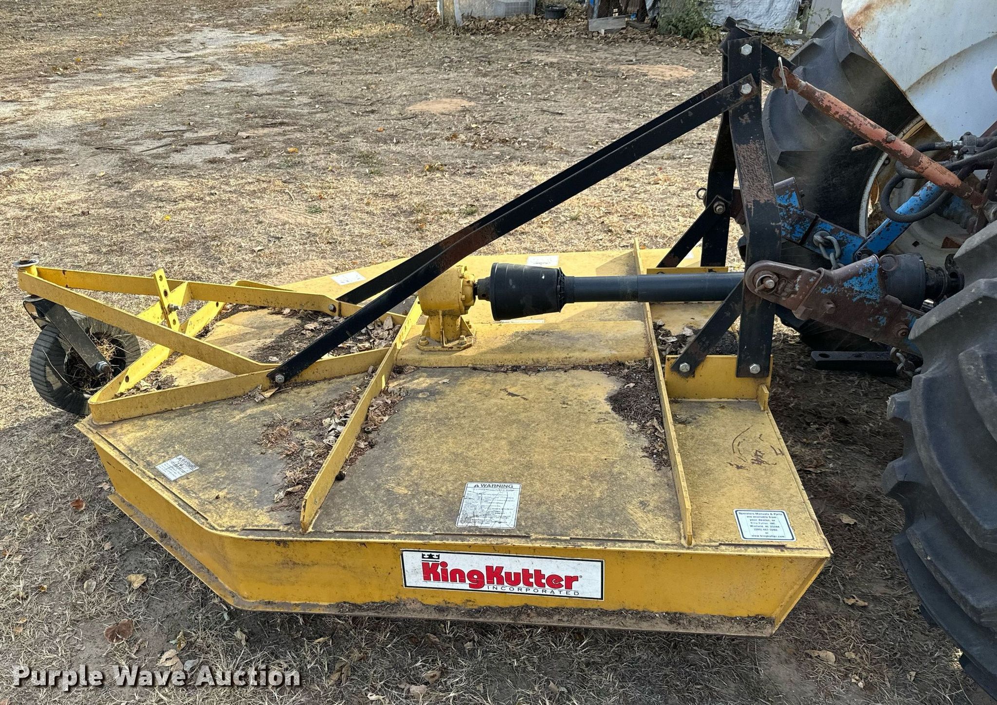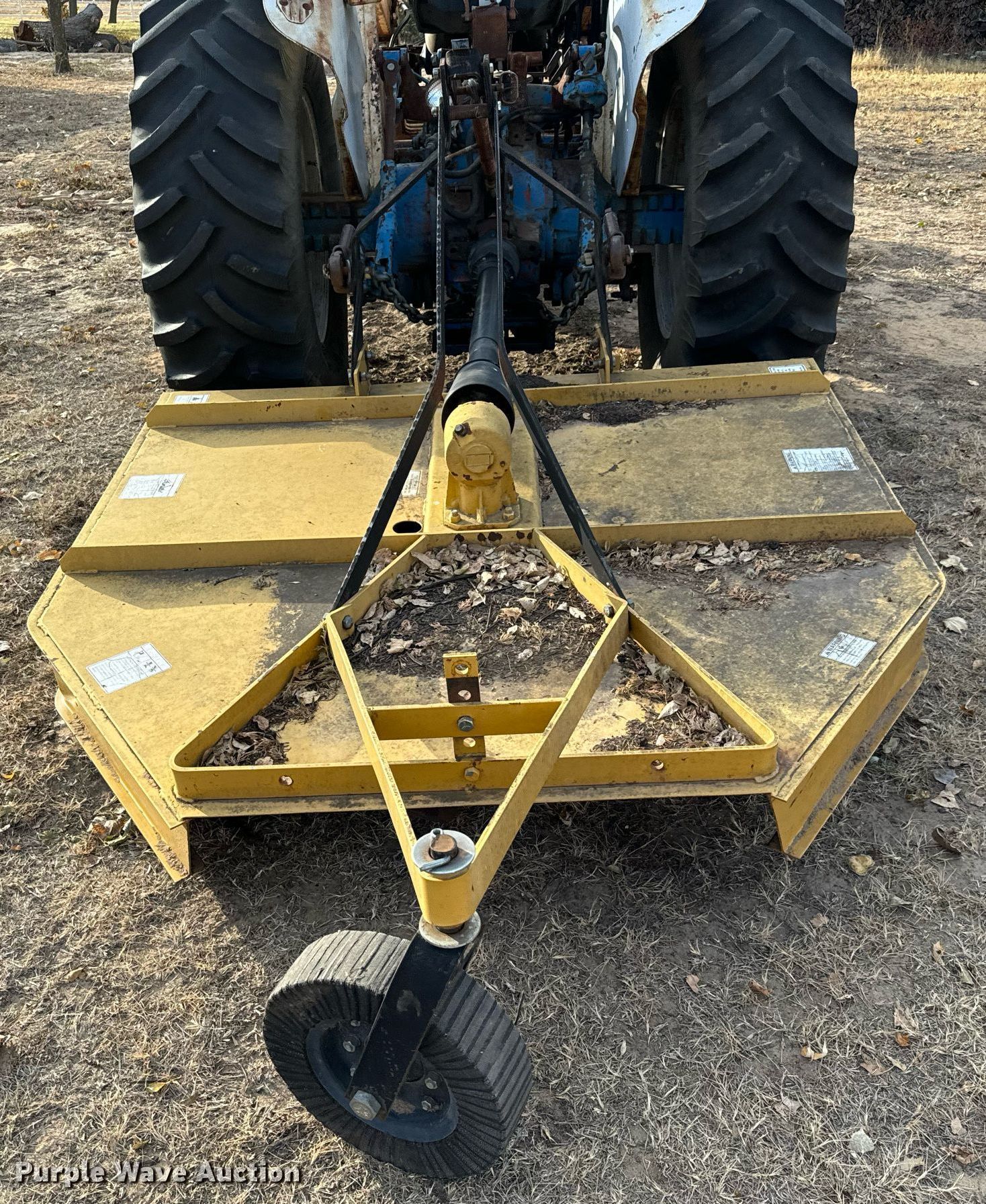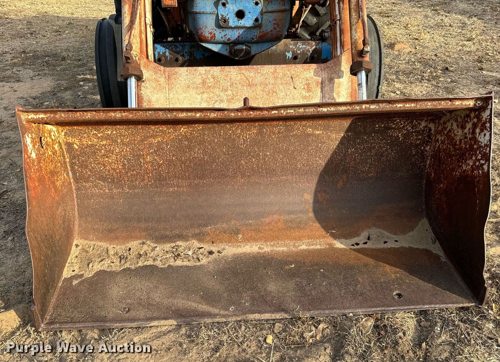 Ford 5000 tractor. Hours: 386 on meter, Serial: 7016. Engine Ford, Displacement: 3.8L, Cylinders: 4, Fuel type: Diesel. Transmission Manual, 8F - 2R. Features PTO: 540, Three point Top link, Hydraulic remote sets Rear: 1, Loader GB 800 Work-Master , Controls: Two-lever, Bucket Width: 60", Rotary mower King Kutter L-72-40-PYK, Width: 6', PTO: 540, TIres: Solid. Tires Front: 7.50-16, Rear: 18.4-30, Wheel weights: 8. Notes Unknown operating condition of hour meter. 7900 N Plum. Hutchinson, KS 67502