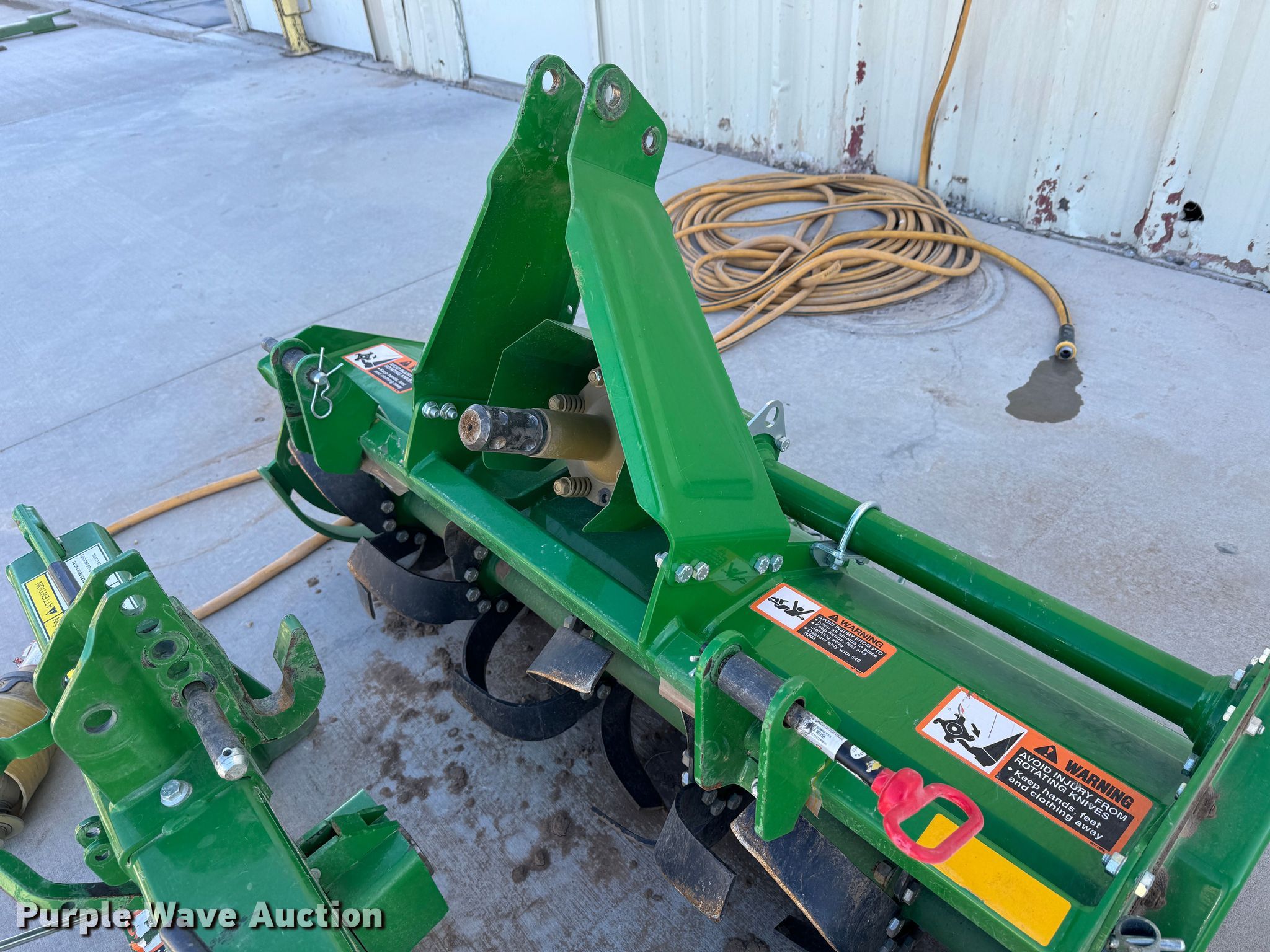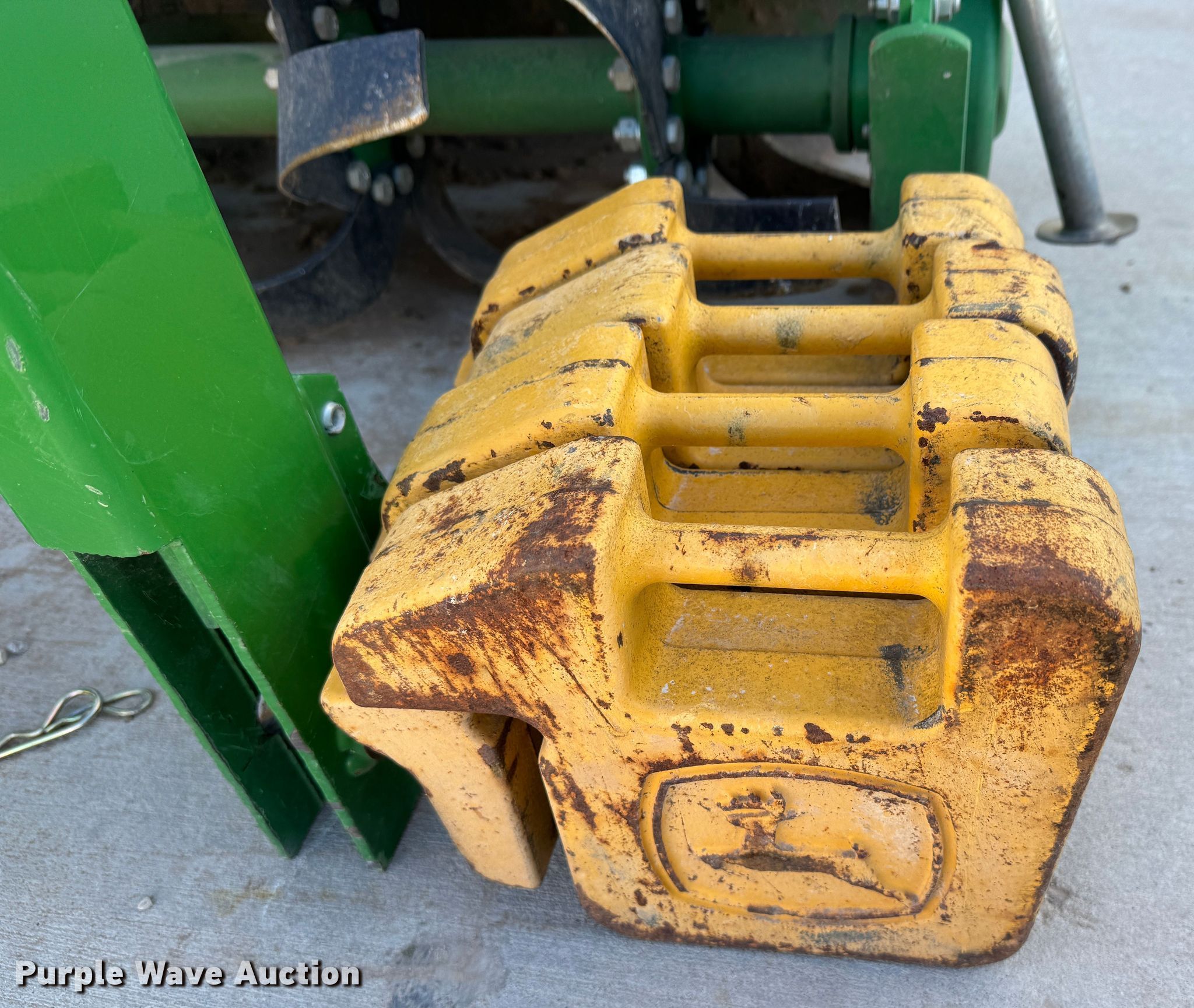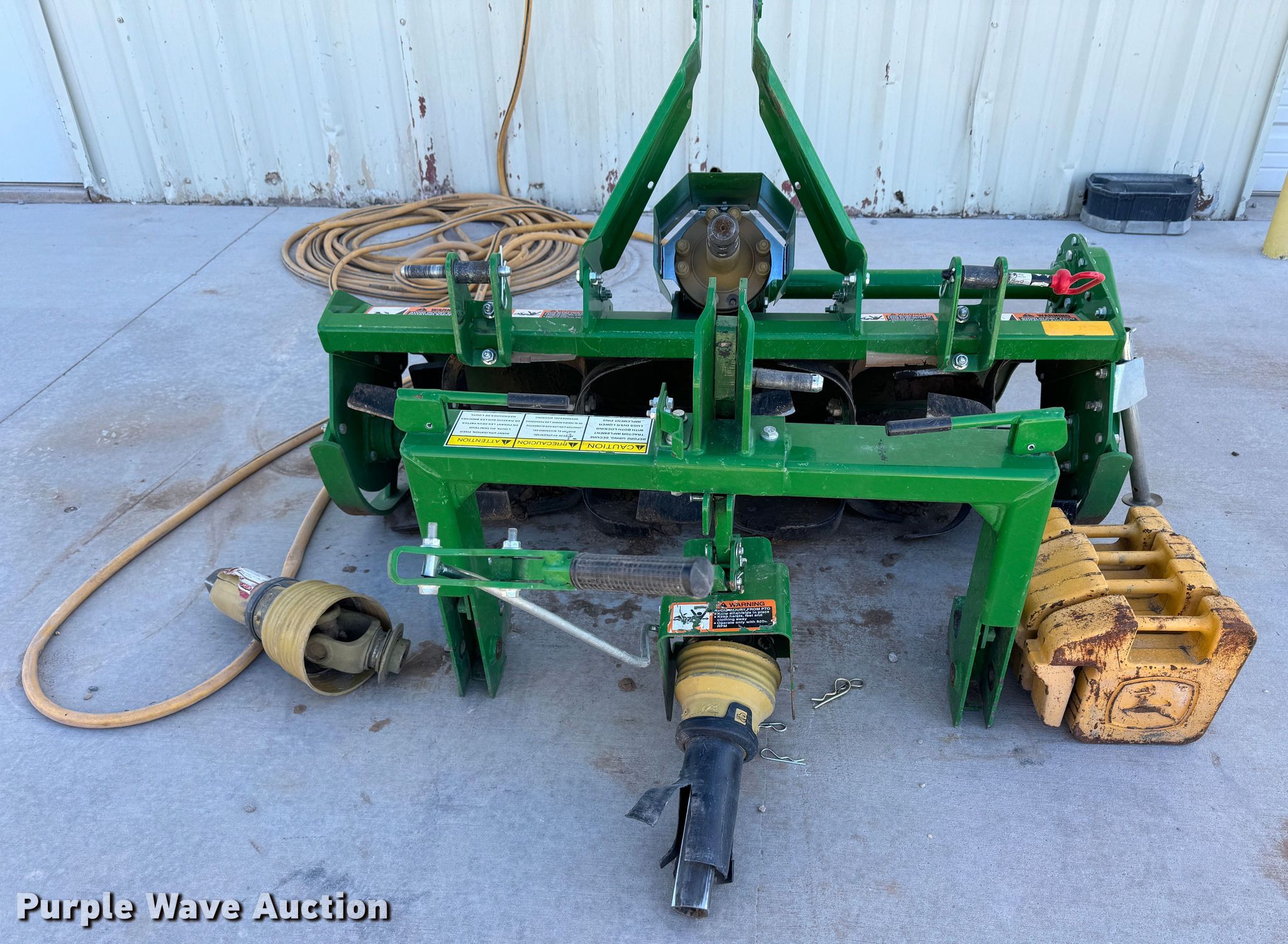 John Deere 647 rototiller. Overall width: 48", Serial: 1LV0647BVE0082183. Features PTO: 540, Hitch: Three point, John Deere I-Match quick hitch, (4) John Deere suitcase weights Weight: 40 lbs. Notes Unknown operating condition. Western Equipment, LLC. 10800 I-27. Amarillo , TX 79119