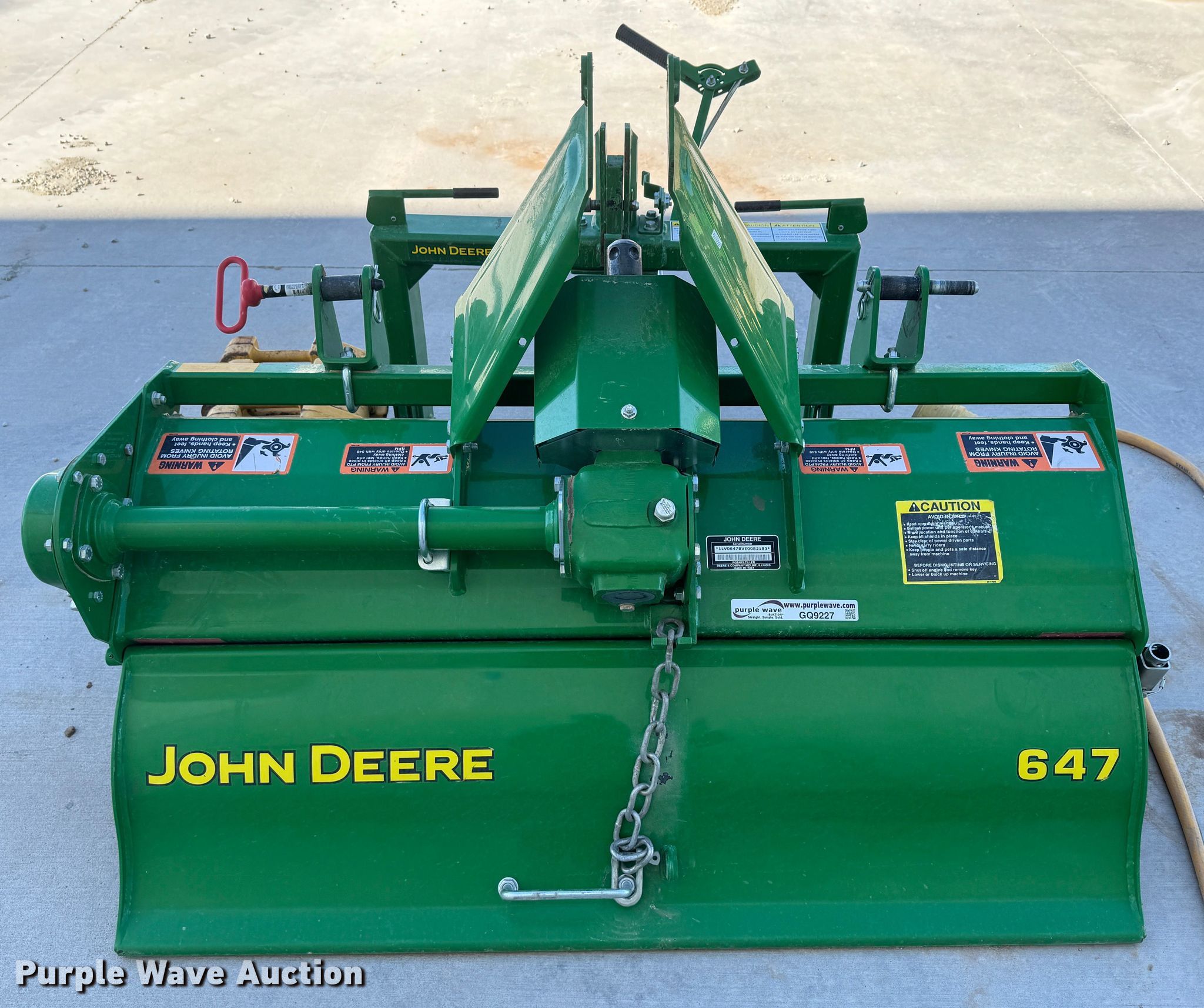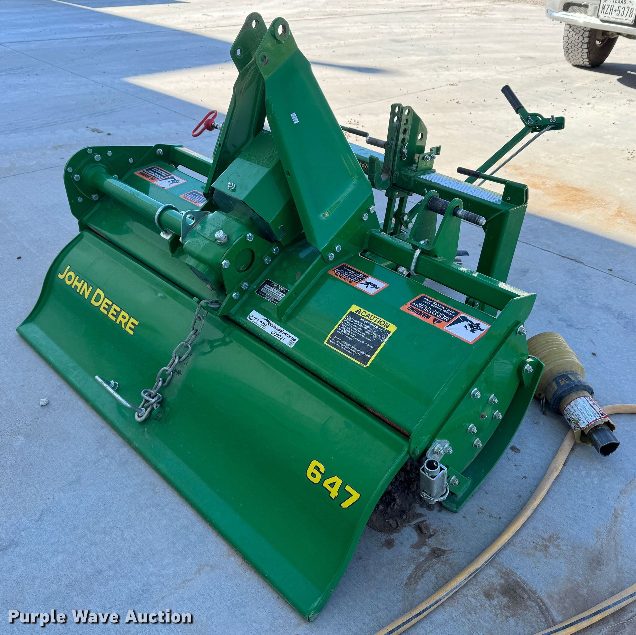 Purple Wave is selling a used Rotary Tillage in Texas. This item is a John Deere 647 rototiller with the following: Overall width: 48", Serial: 1LV0647BVE0082183