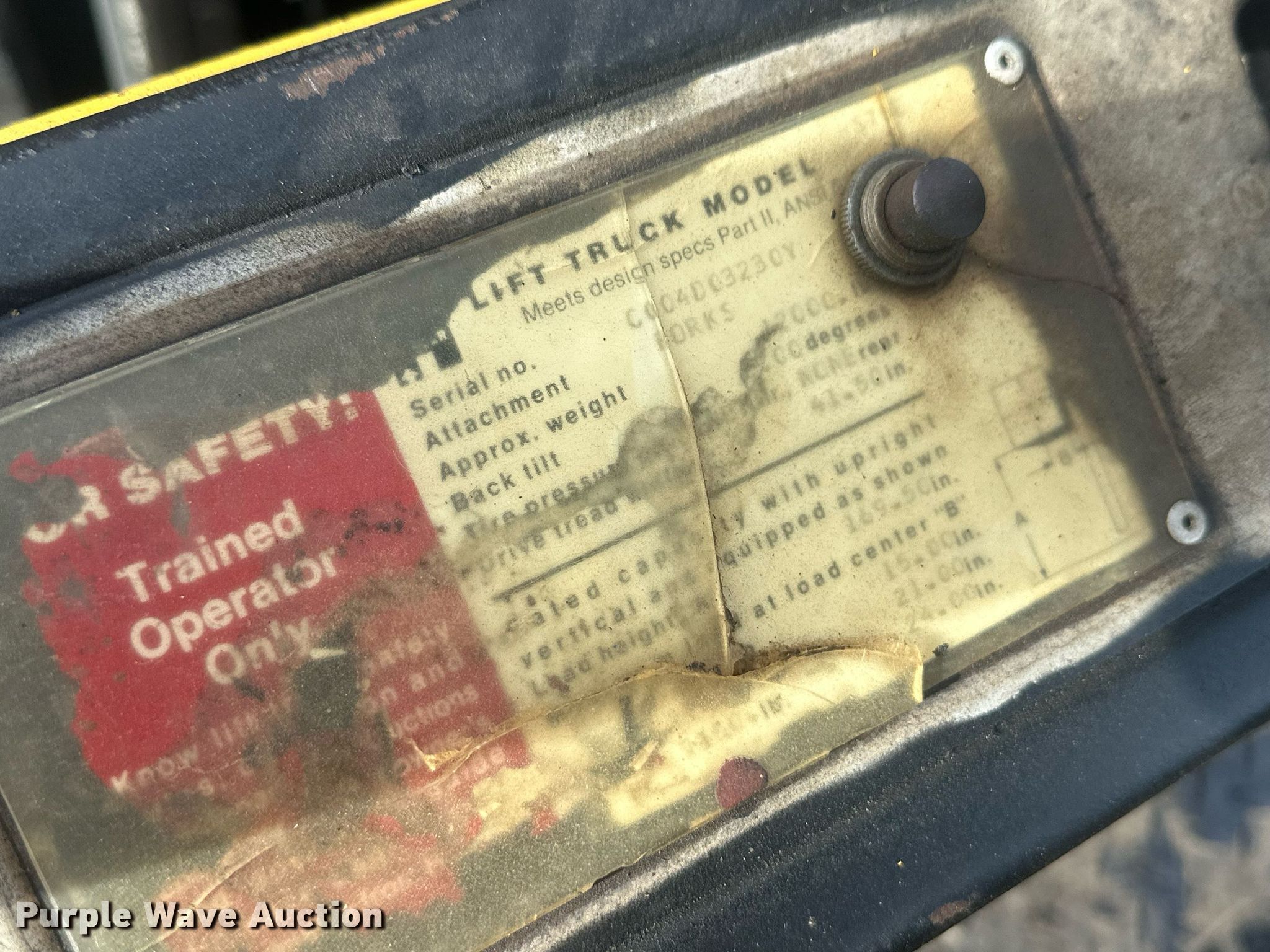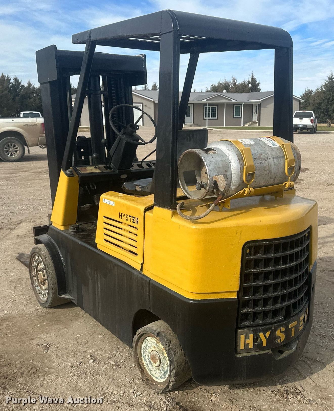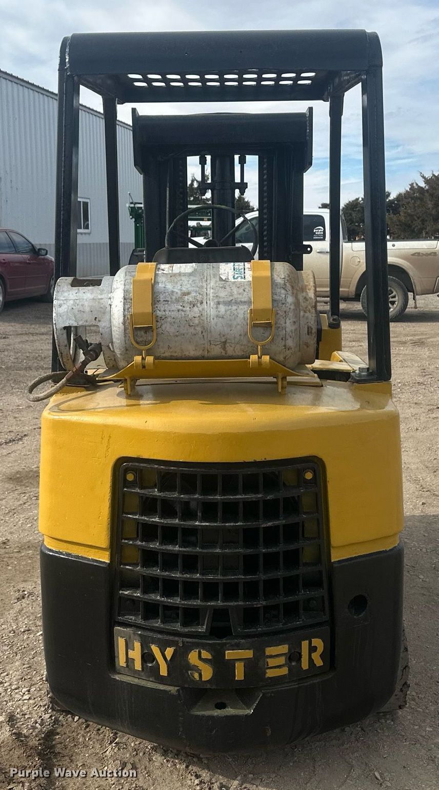 Hyster forklift. Serial: C0004D0323CY. Engine Cylinders: 6, Fuel type: LPG LP bottle: Not included. Transmission Shuttle shift. Operators station Canopy. Features Maximum lift height: 169", Mast stages: 3, Mast tilt, Fork length: 43". Tires Solid. 1587 Cottonwood. Sublette, KS 67877