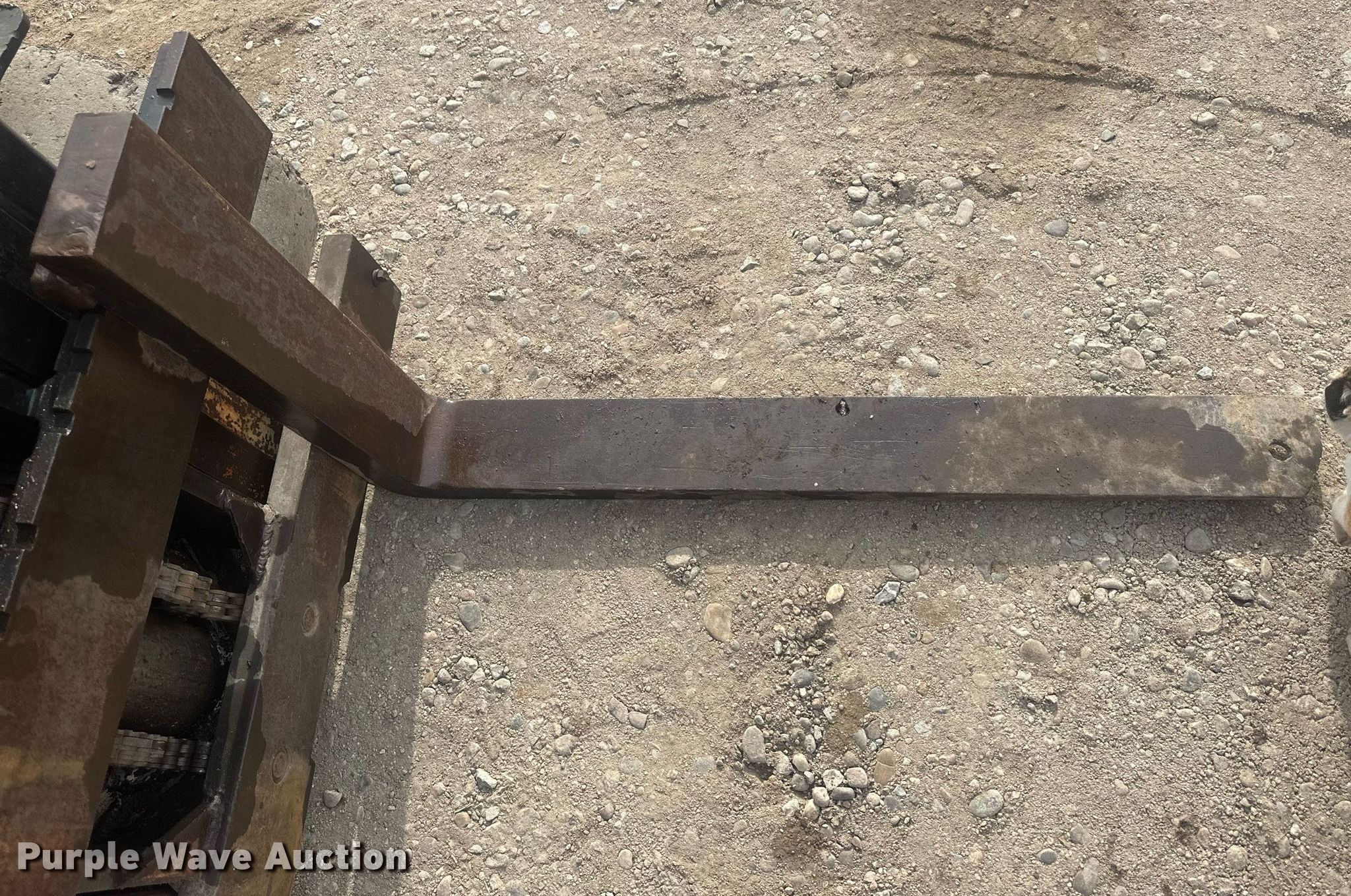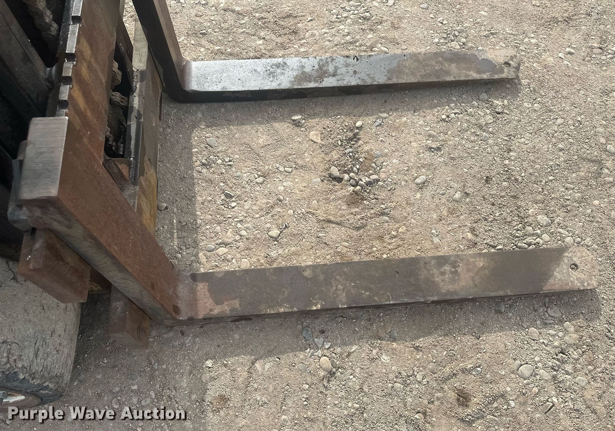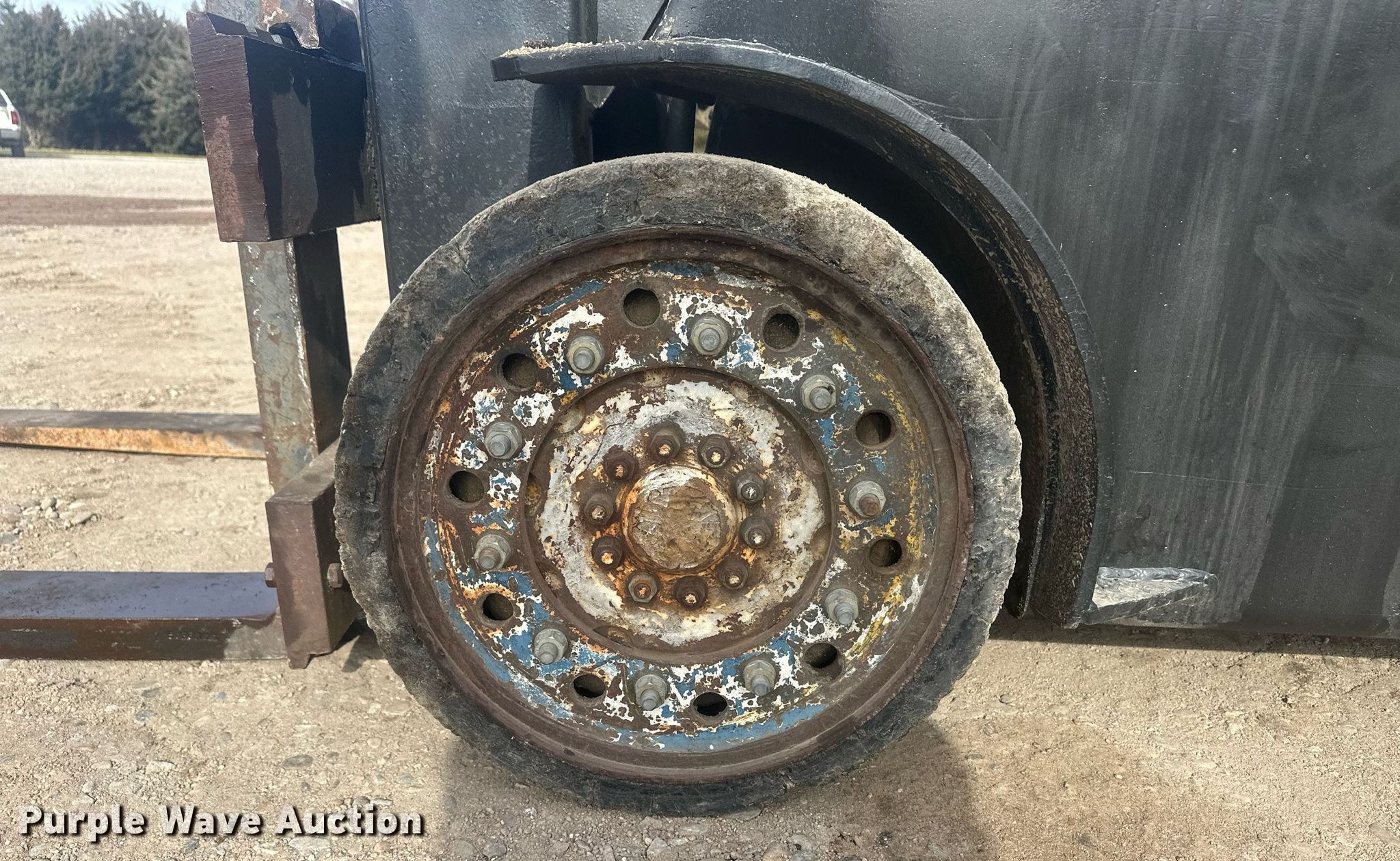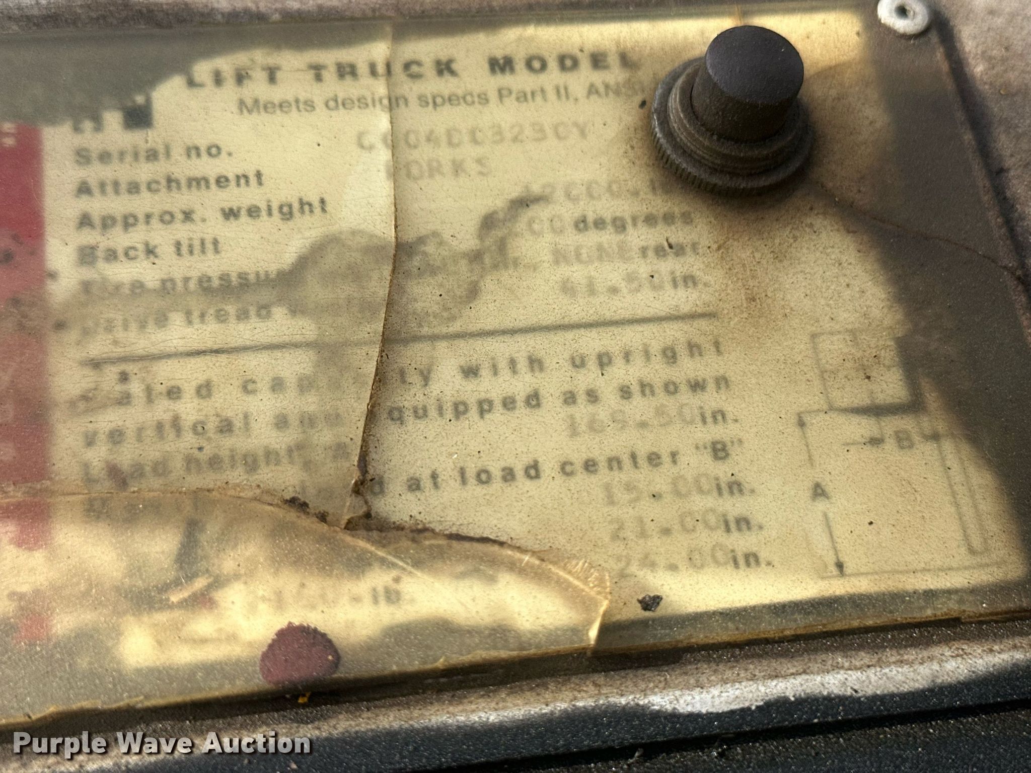 Hyster forklift. Serial: C0004D0323CY. Engine Cylinders: 6, Fuel type: LPG LP bottle: Not included. Transmission Shuttle shift. Operators station Canopy. Features Maximum lift height: 169", Mast stages: 3, Mast tilt, Fork length: 43". Tires Solid. 1587 Cottonwood. Sublette, KS 67877