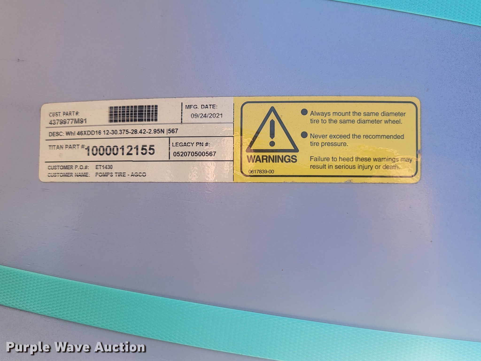 (48) Titan 46xDD16 wheels. Diameter: 48", Unused. AGCO. 3 6th Avenue. Round Lake, MN 56167