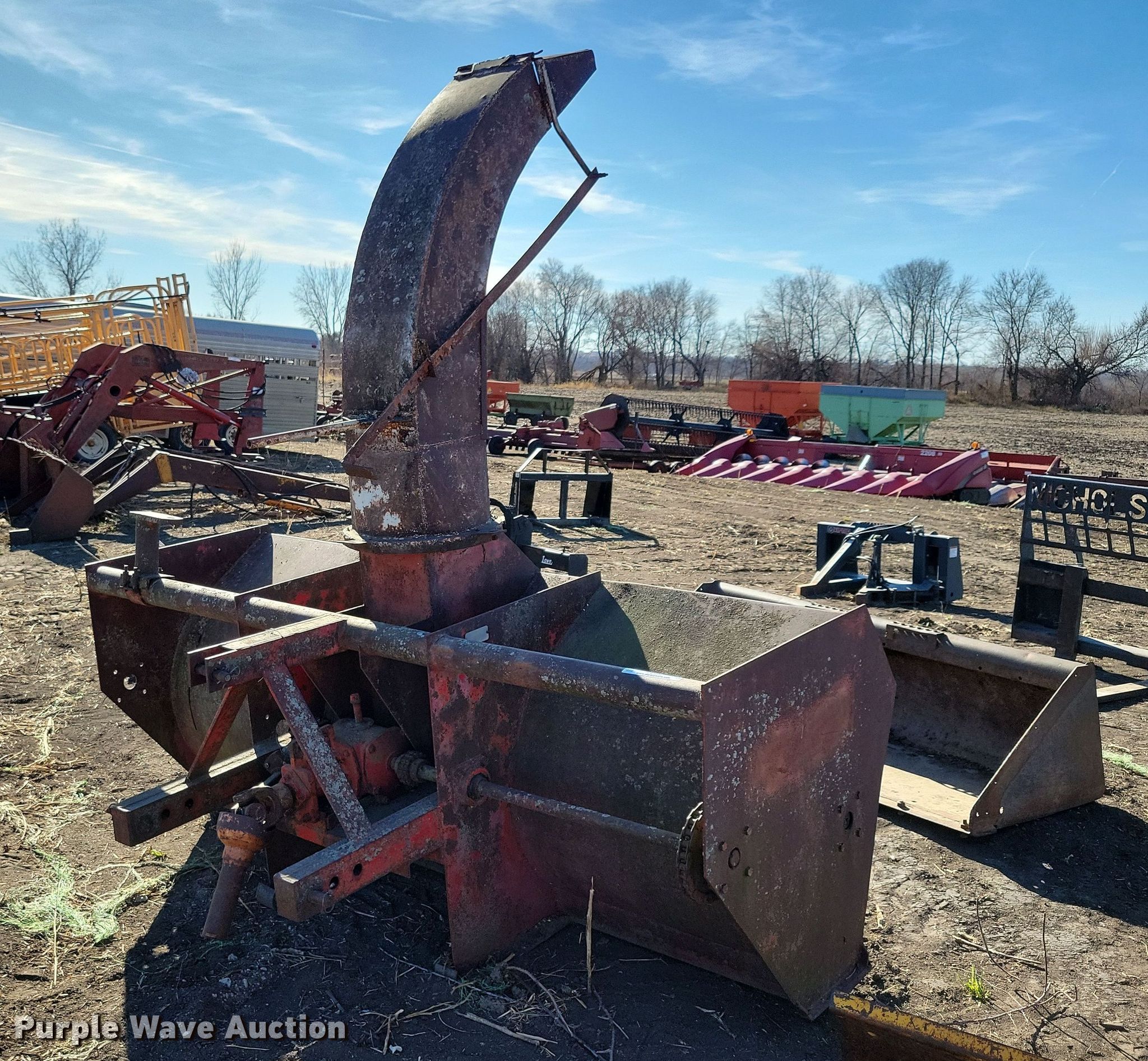 Purple Wave is selling a used Ag Tractor Loader or Attach. in Iowa. This item is a Lundell 3400 snow blower with the following: Serial: 1408, Hitch: Three point, PTO: 540, Width: 8'