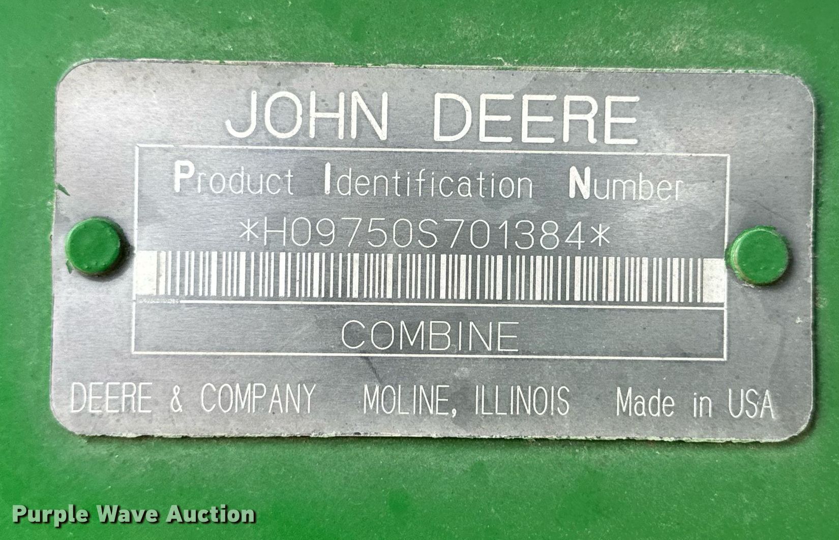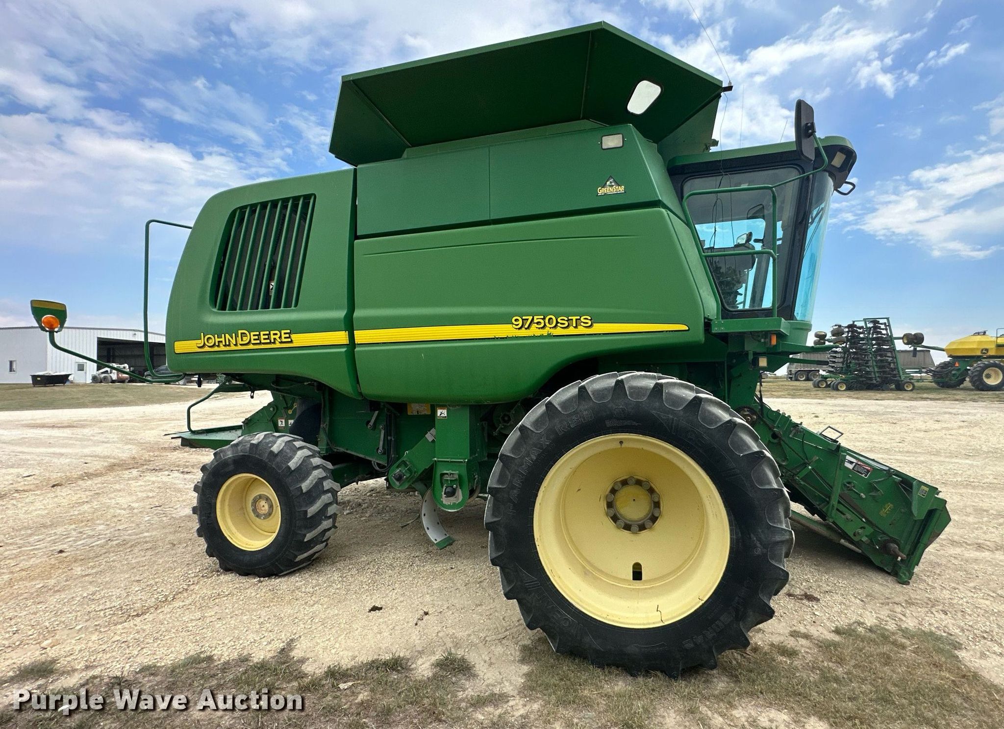 Purple Wave is selling a used Combine in Kansas. This item is a 2003 John Deere 9750STS combine with the following: Engine hours: 7,175 on meter, Separator hours: 4,799 on meter, Miles or hours may vary, unit still in use, Serial: H09750S701384