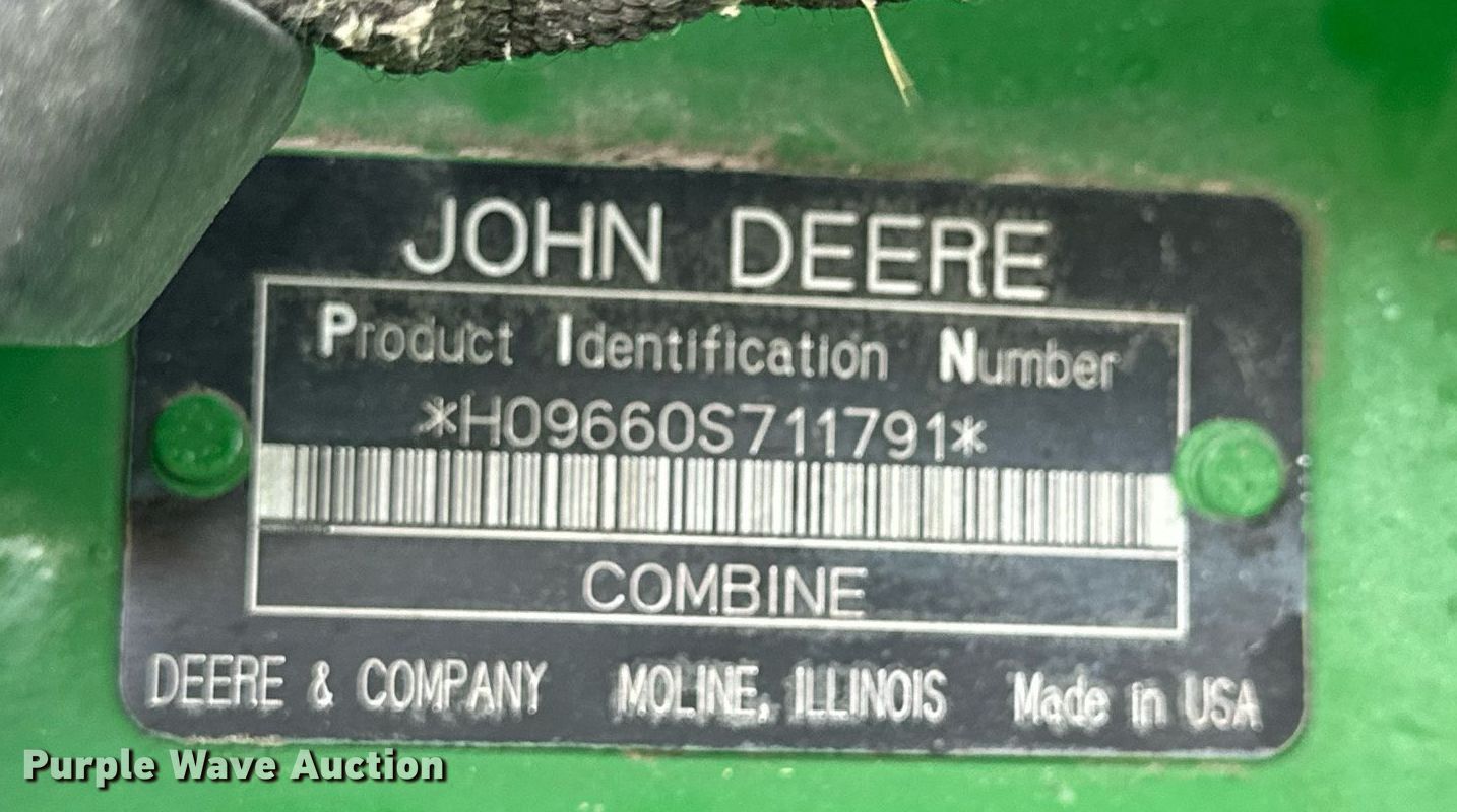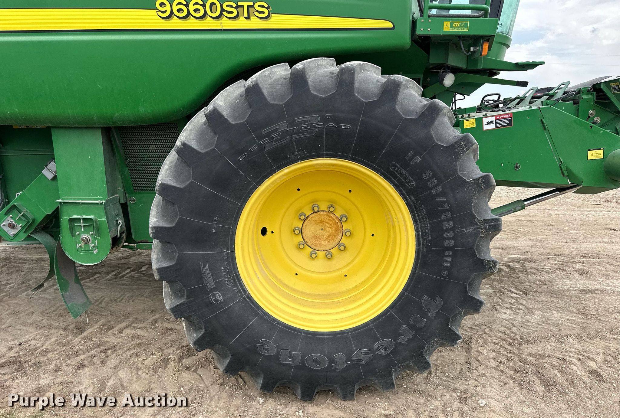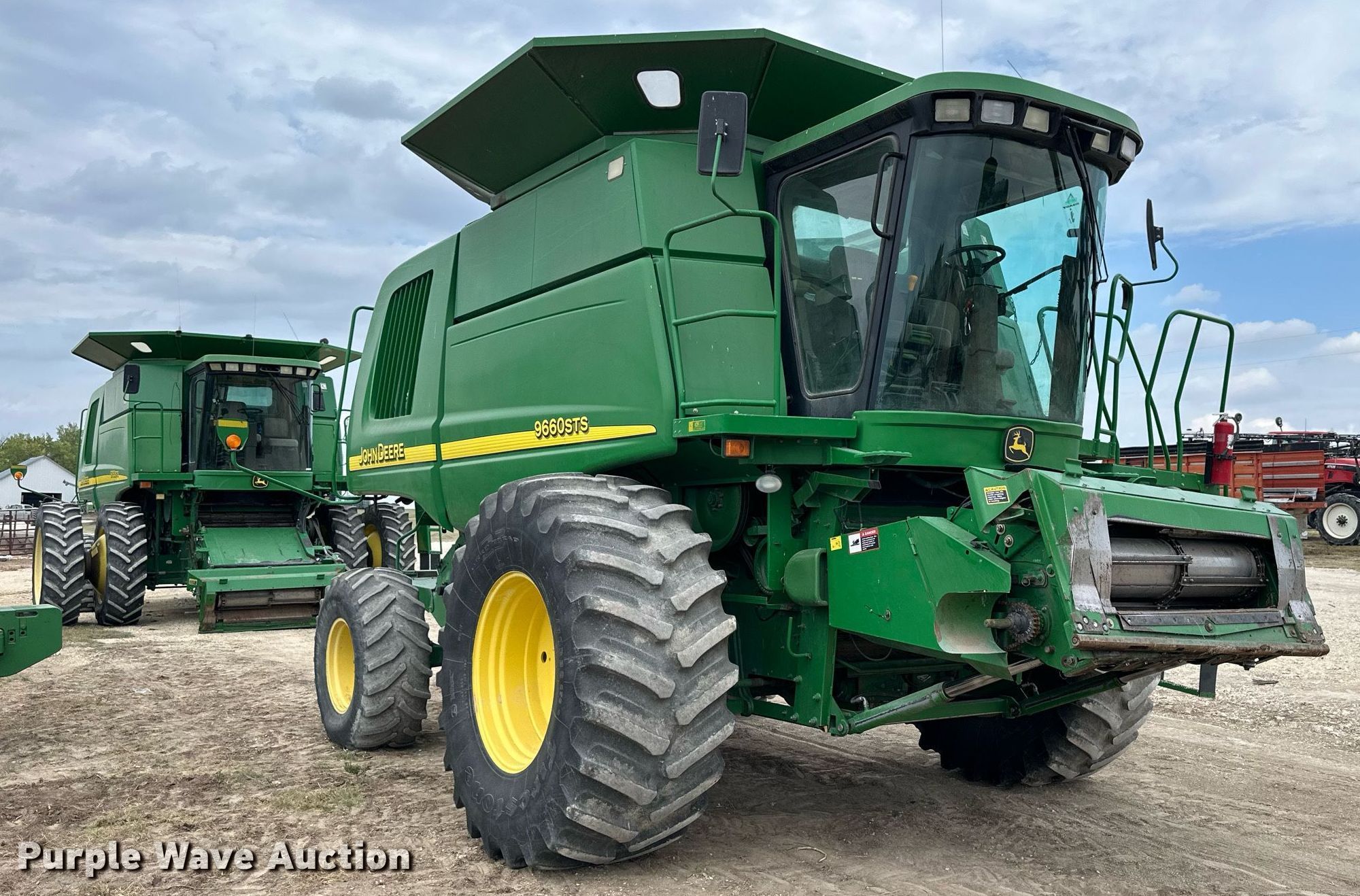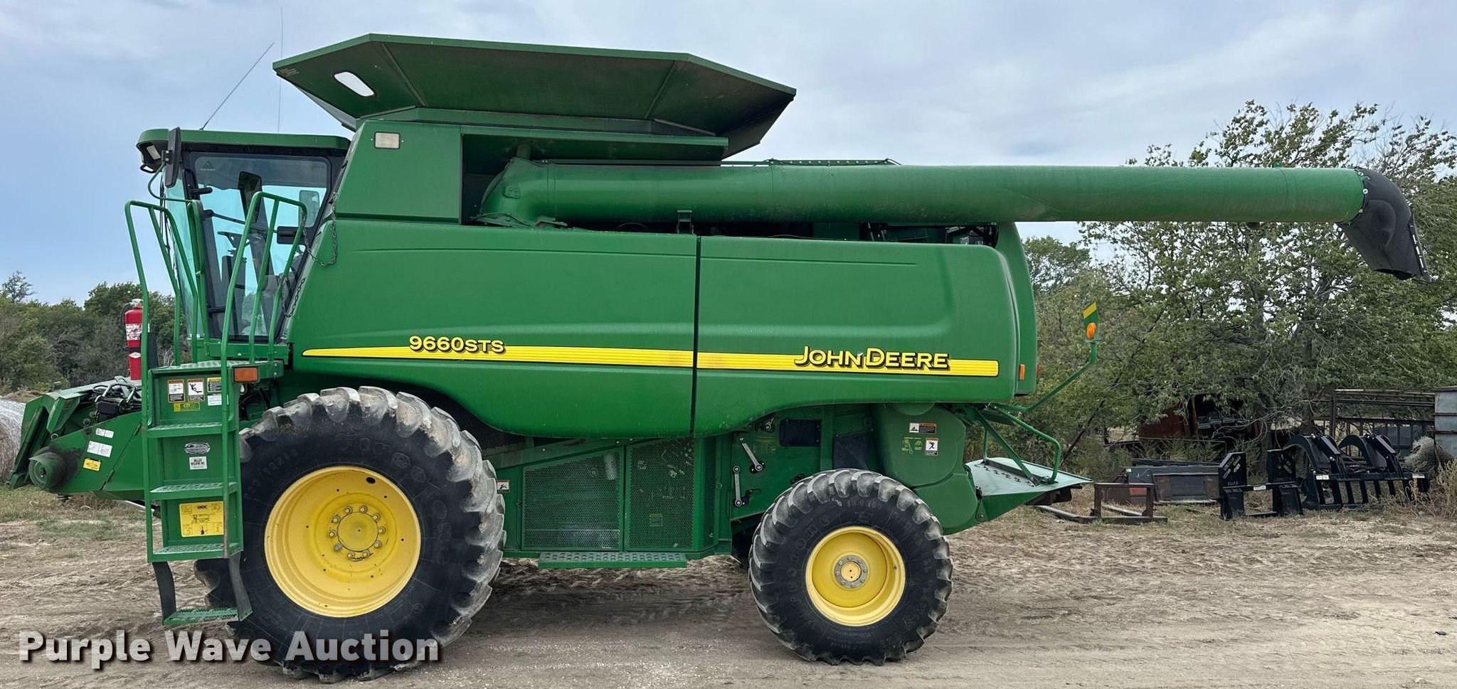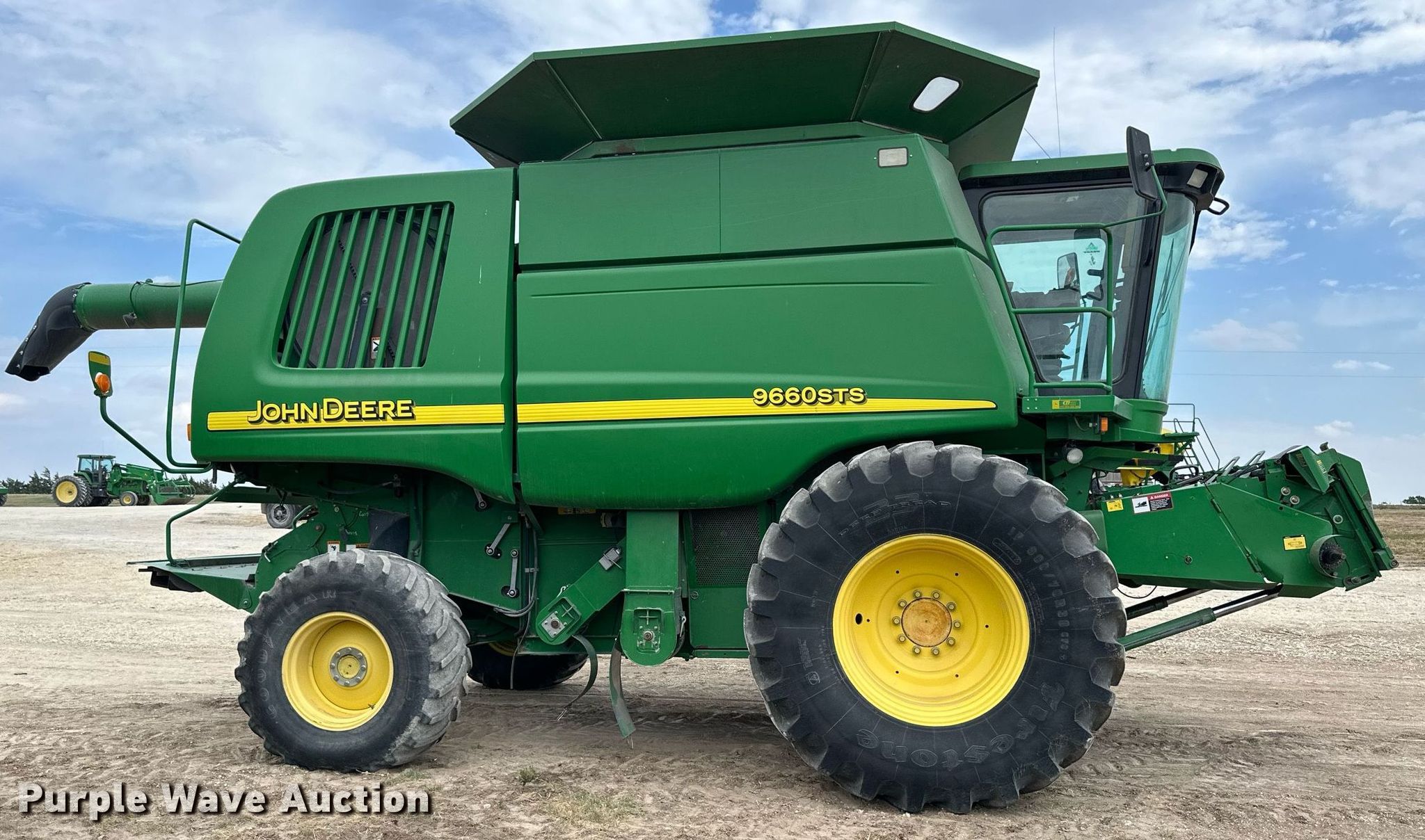 Purple Wave is selling a used Combine in Kansas. This item is a 2005 John Deere 9660 STS combine with the following: Engine hours: 4,557 on meter, Separator hours: 3,128 on meter, Serial: H09660S711791