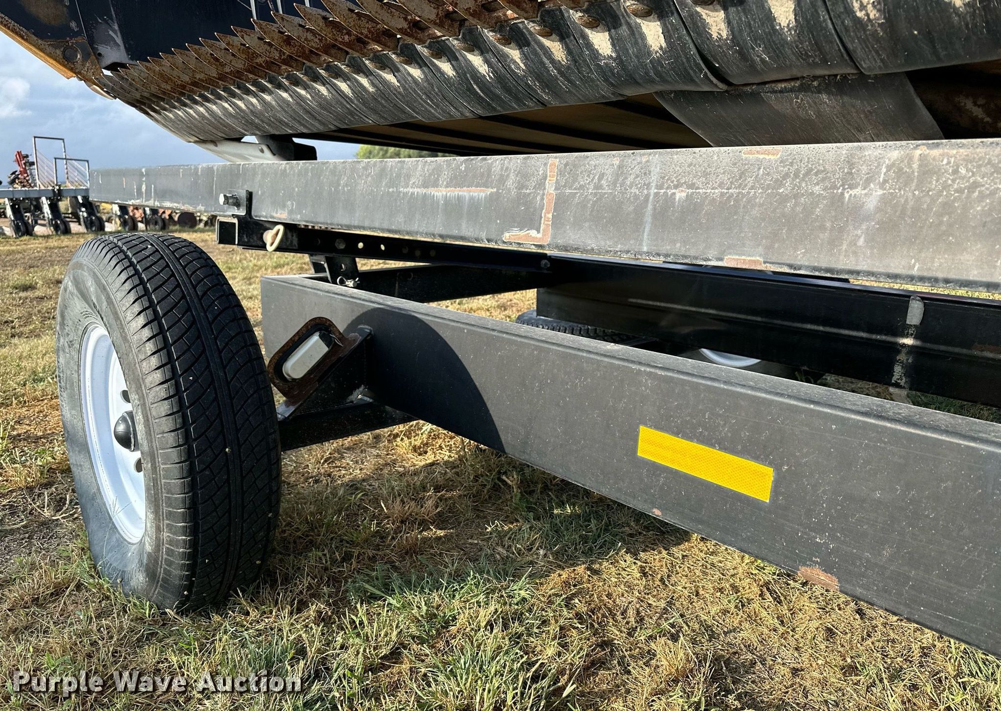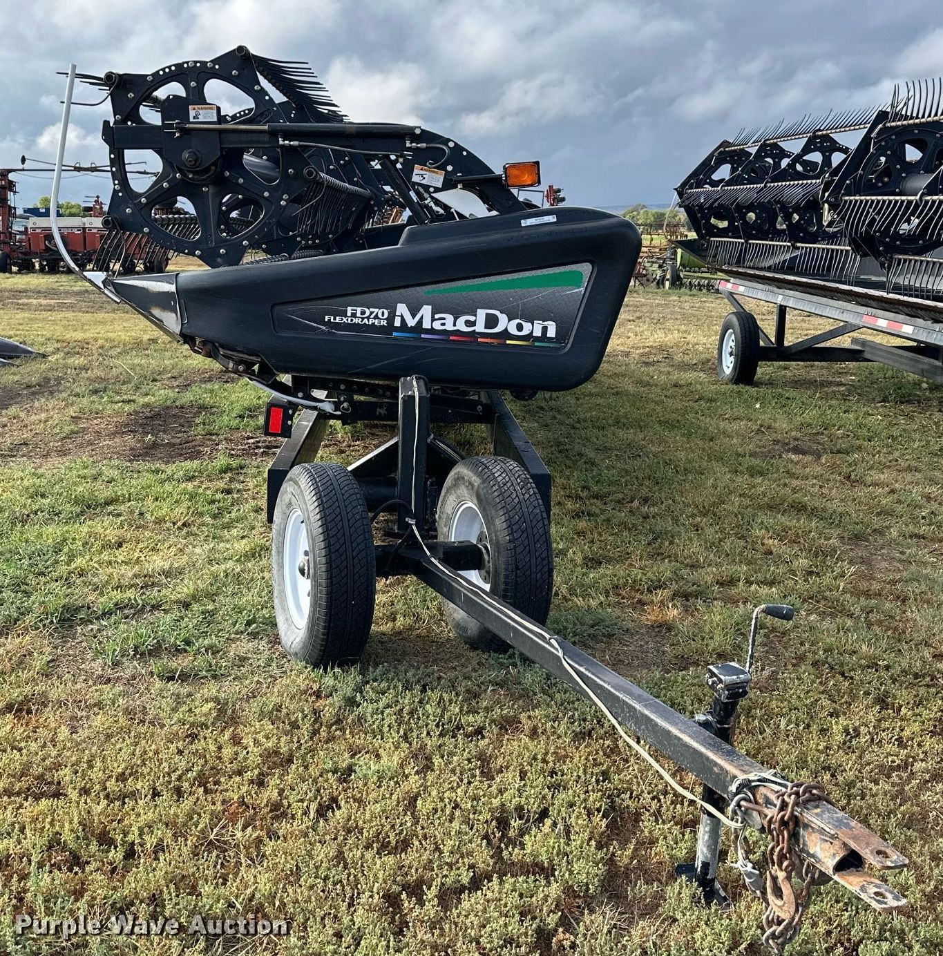 2010 MacDon FD70 flex draper head. Serial: 199485. Features Width: 30', Reel: Finger Hydraulic fore/aft, Hydraulic reel height control, Skid plates: Poly, Single point coupler, Drivelines: Single, PTO: 1000. Trailer Duo Head Hauler, Serial: 91015109, 30' L x 84" W, Axles: Single, Tire size: 235/80R16. Notes (2) additional tires. Doane Family Farms - Open Inspection December 14. Downs, KS 67437
