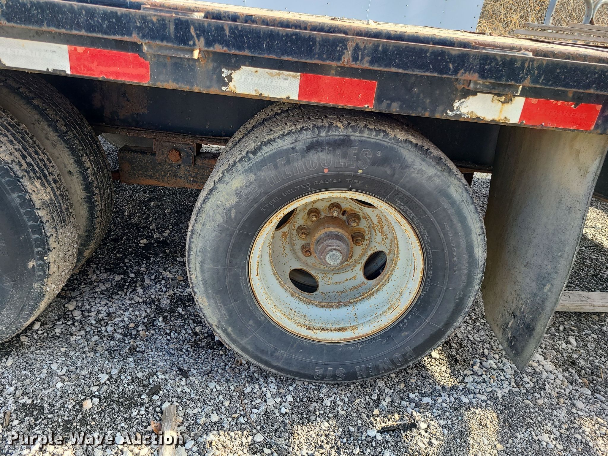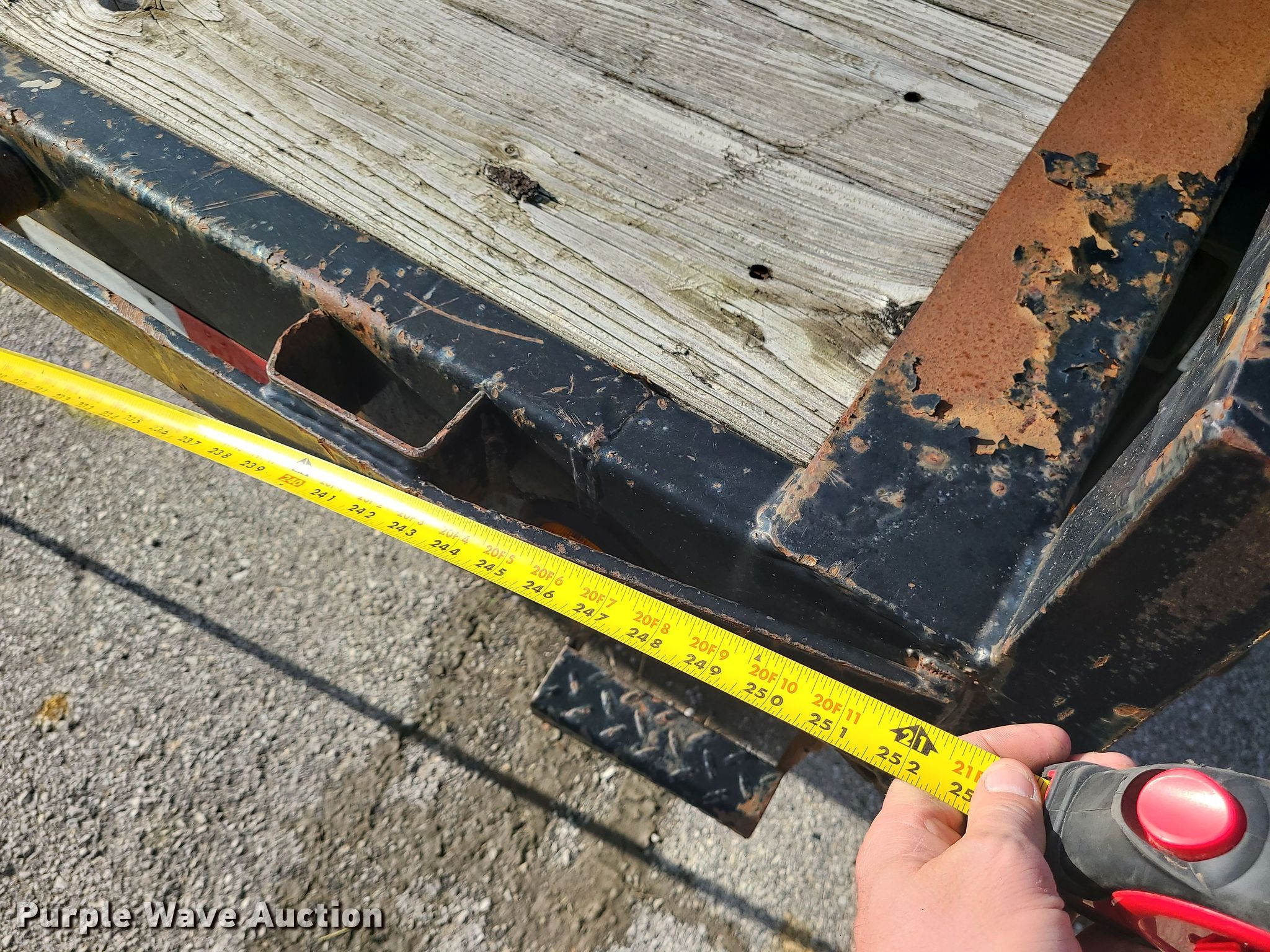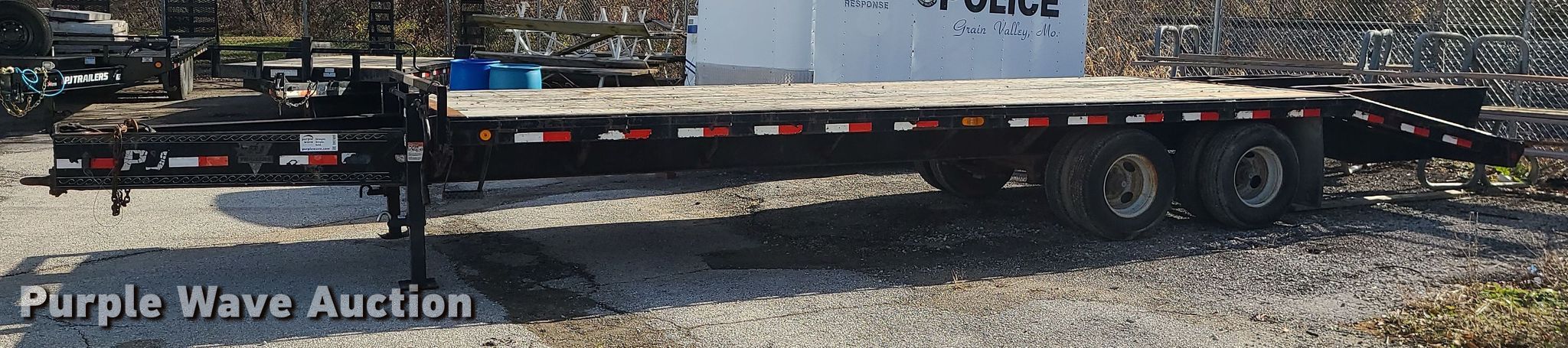 2008 PJ equipment trailer. VIN: 4P5FD262X81117518. Dimensions Overall: 33' L x 102" W, Deck: 21' L x 102" W, Tail length: 6', Ramps: Manual Length: 60'. Features Deck type: Wood. Chassis Hitch: Pintle, Landing gear: Dual, Suspension: Spring, Brakes: Electric, Axles: Tandem. Tires Steel wheels, Size: ST235/80R16. Missouri title. Title distribution may be delayed up to 14 days from verification of funds. City of Grain Valley Fleet Maintenance. 618 James Rollo Ct. Grain Valley, MO 64029