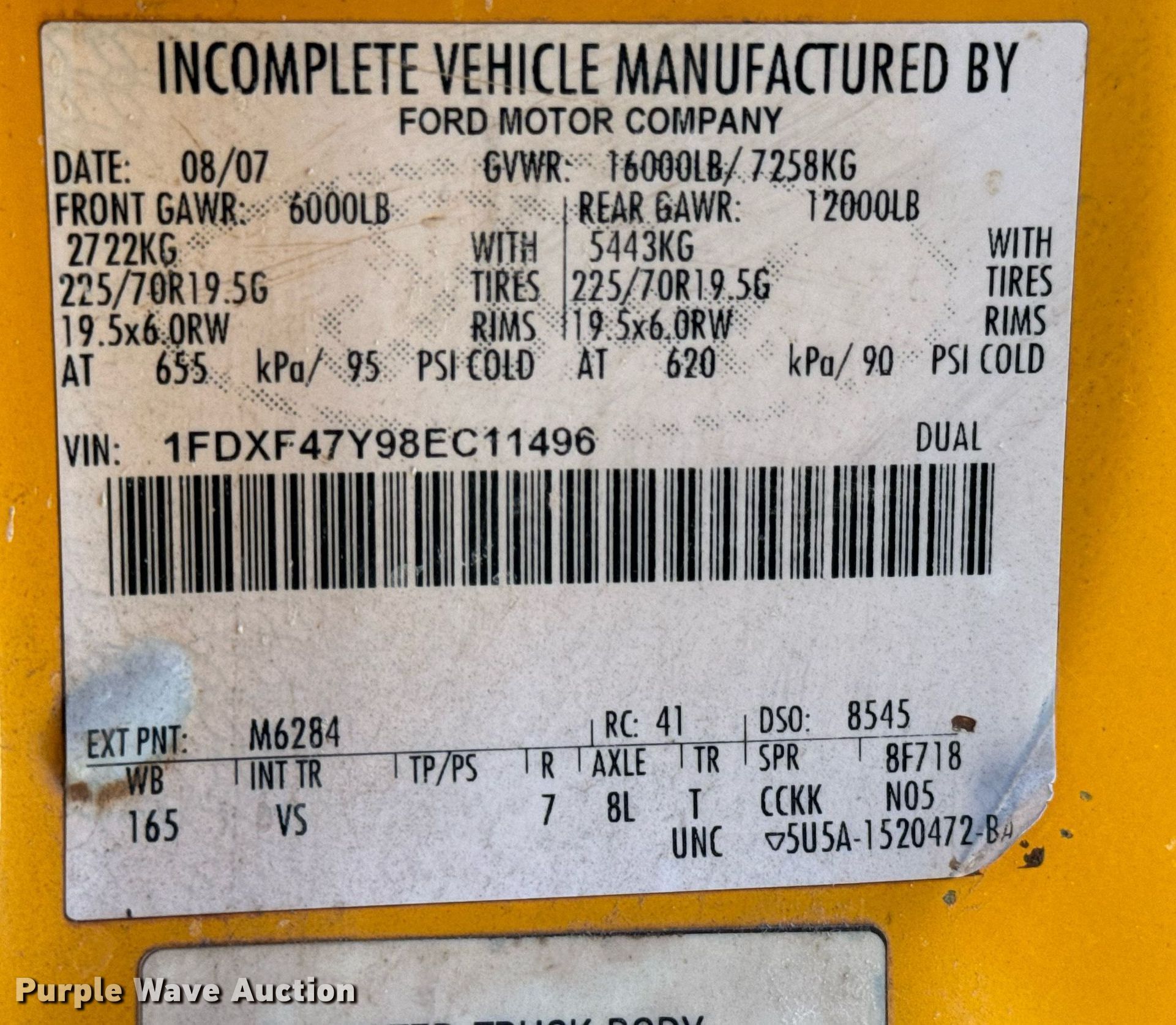 Purple Wave is selling a used Truck Chassis in Kansas. This item is a 2008 Ford F450 Super Duty truck cab and chassis with the following: Miles: 95,305 on odometer, VIN: 1FDXF47Y98EC11496