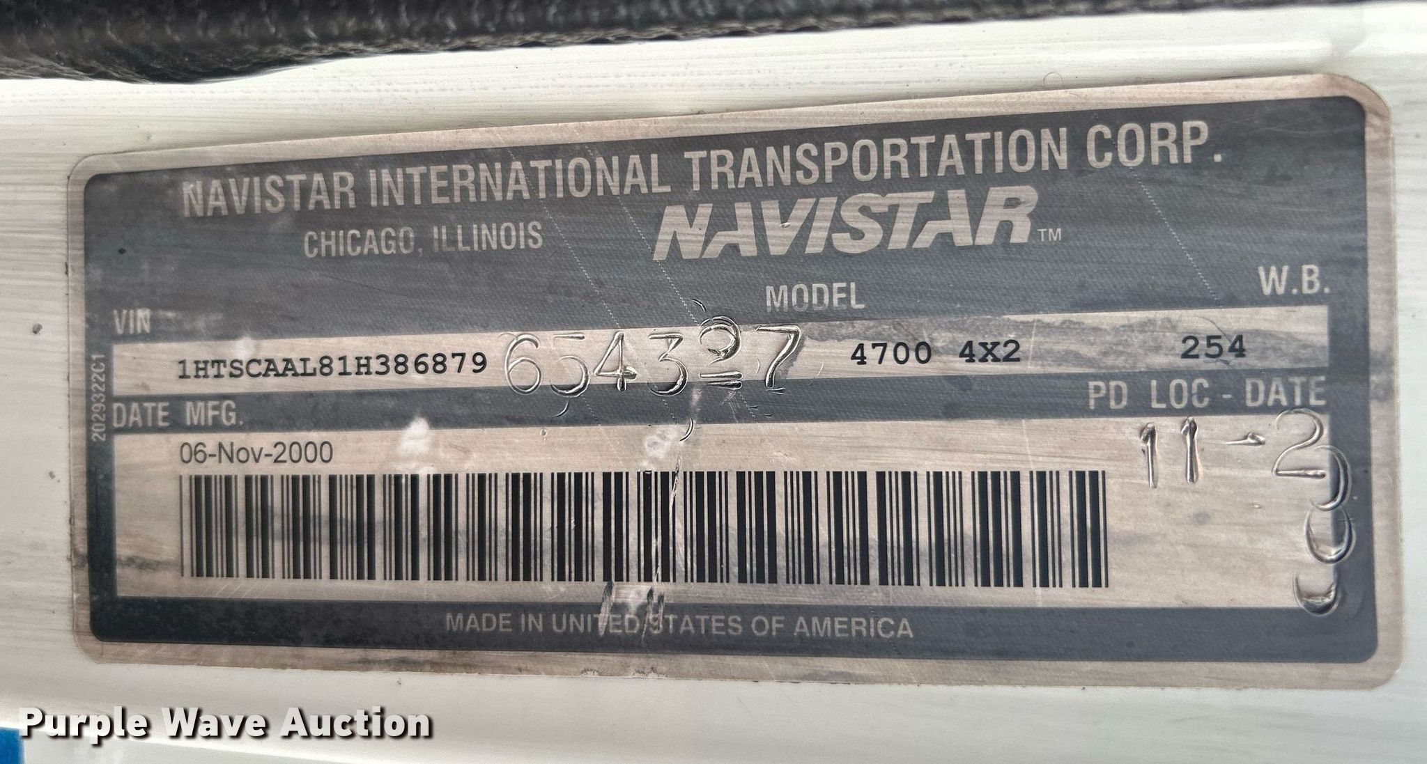 2001 International 4700 box truck. Miles: 440,509 on odometer, Hours: 14,745 on meter, VIN: 1HTSCAAL81H386879. Engine International DT466, Displacement: 7.6L, Cylinders: 6, Fuel type: Diesel. Transmission Spicer, Manual, Speed: 5. Chassis Axles: Single, Suspension: Spring, Brakes: Air. Interior AC, Heat, Cruise control. Features Box bed 24' L x 96" W x 95" H, Floor: Wood. Tires Size: 10R22.5. Oklahoma title. Title distribution may be delayed up to 14 days from verification of funds. 15107 North 137th East Avenue. Collinsville, OK 74021