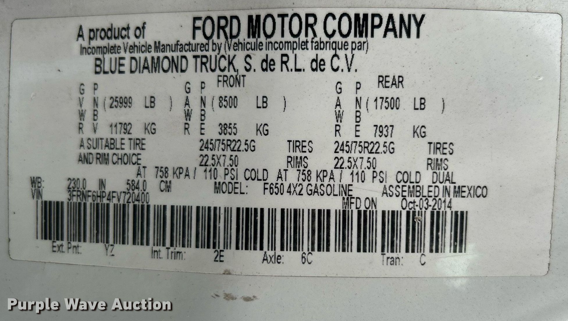 Purple Wave is selling a used Box Truck in Oklahoma. This item is a 2015 Ford F650 Super Duty XLT box truck with the following: Miles: 120,724 on odometer, VIN: 3FRNF6HP4FV720400