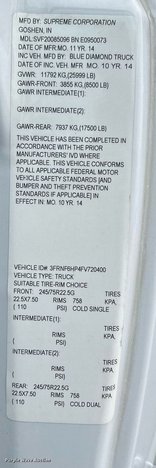2015 Ford F650 Super Duty XLT box truck. Miles: 120,724 on odometer, VIN: 3FRNF6HP4FV720400. Engine Displacement: 6.8L , Cylinders: 10, Fuel type: Gas. Transmission Automatic. Chassis Axles: Single, Suspension: Spring, Brakes: Hydraulic, GVWR: 25,999 lbs, Wheelbase: 130". Interior AC, Heat, Power windows, Power locks, Cruise control. Features Box bed Supreme Corp. E0950073, Serial: SVF20085069, 20' L x 96" W x 90" H, End gate lift Interlift ILK33.. Tires Size: 11R22.5. Notes Unknown operating condition of end gate lift. Oklahoma title. Title distribution may be delayed up to 14 days from verification of funds. 15107 North 137th East Avenue. Collinsville, OK 74021