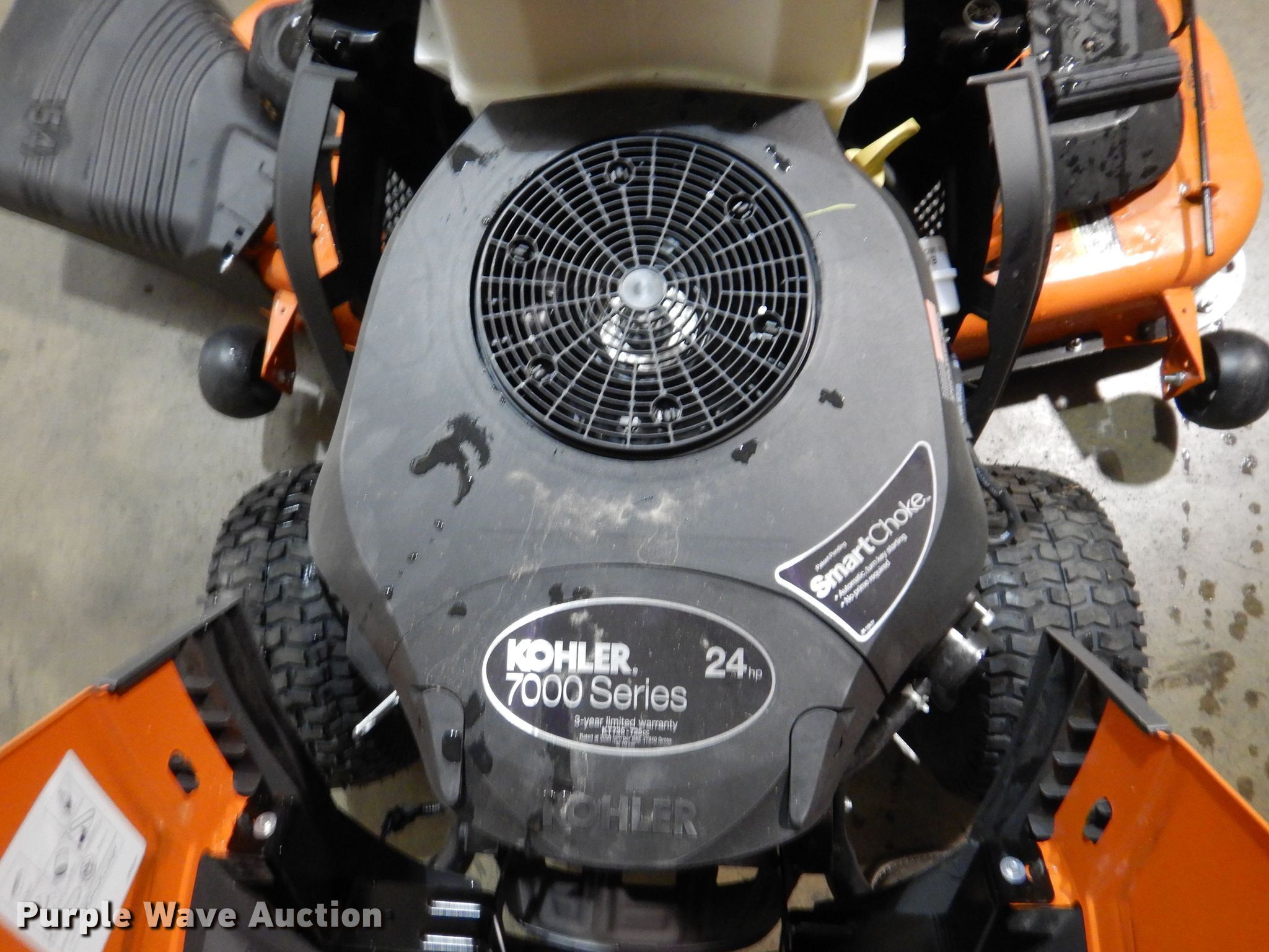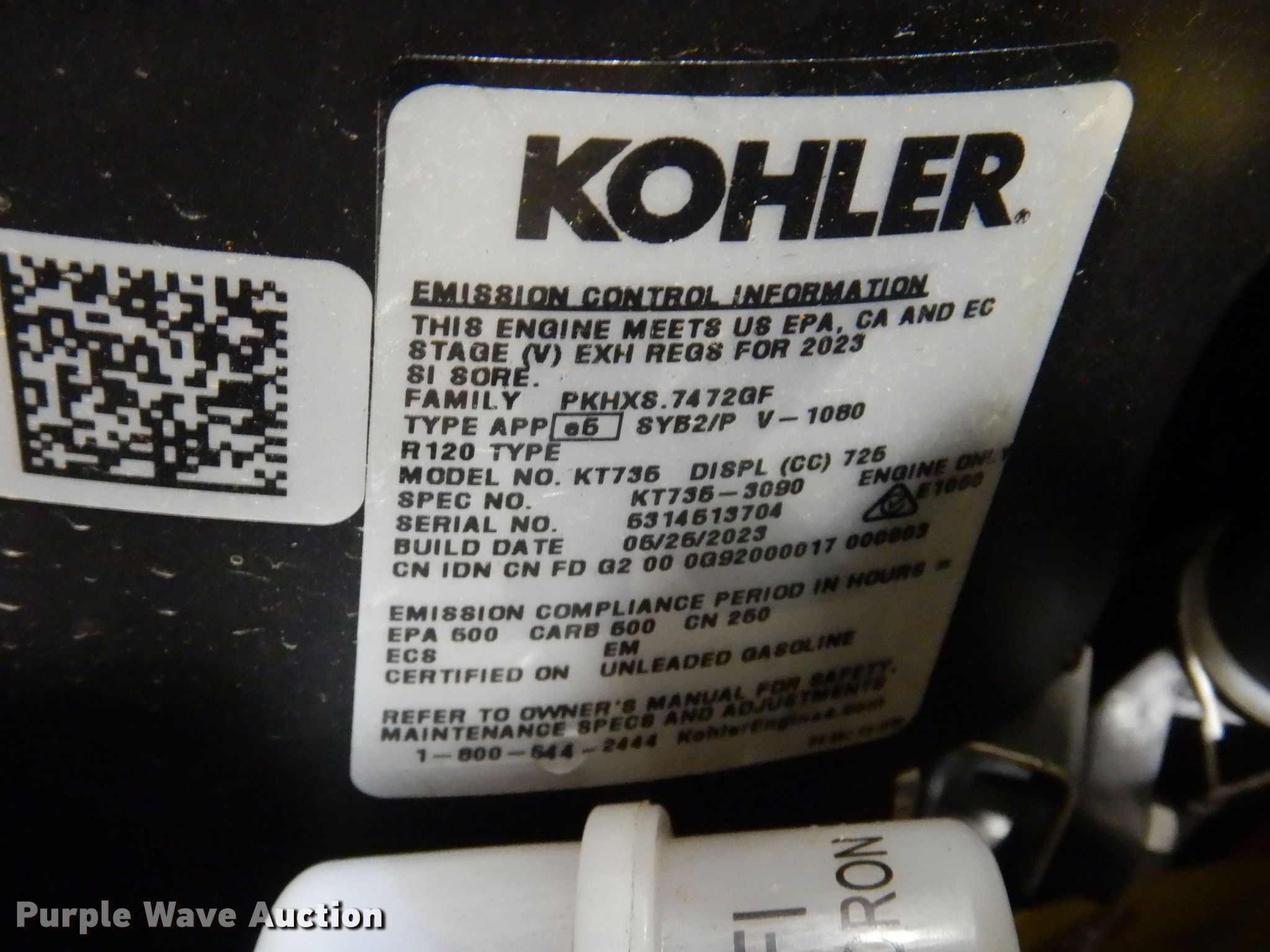 2023 Husqvarna YTH 24K54 lawn mower. Hours: 0.1 on meter, Cutting width: 54", Serial: 062223A011930. Engine Kohler 7000 series, Serial: 5314513704, Displacement: 725 cc, Cylinders: 2, Fuel type: Gas, HP: 24. Transmission Hydrostatic. Tires Front: 15x6-6NHS, Rear: 20x8-8NHS. Notes Unused. AE Outdoor Power. 4063 121st Street. Urbandale, IA 50323