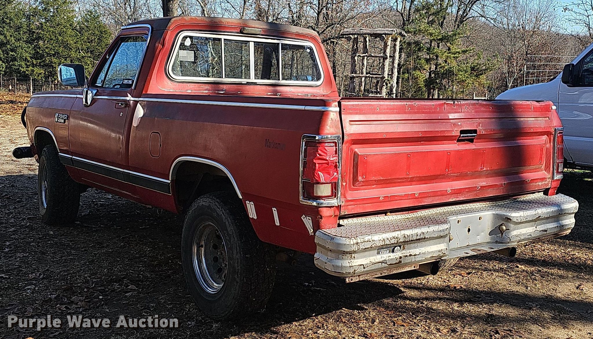 1984 Dodge Ram 150 pickup truck. Miles: 98,196 on odometer, VIN: 1B7HW14T1ES266618. Engine Displacement: 5.2L V8 SD OHV, Cylinders: 8, Fuel type: Gas. Transmission Automatic, Four wheel drive. Interior AC, Heat. Tires Size: 31x10.50R15. Notes. Non-operational taillights. Arkansas title. Title distribution may be delayed up to 14 days from verification of funds. 1213 Cedar Glade Trail. Salem, AR 72576