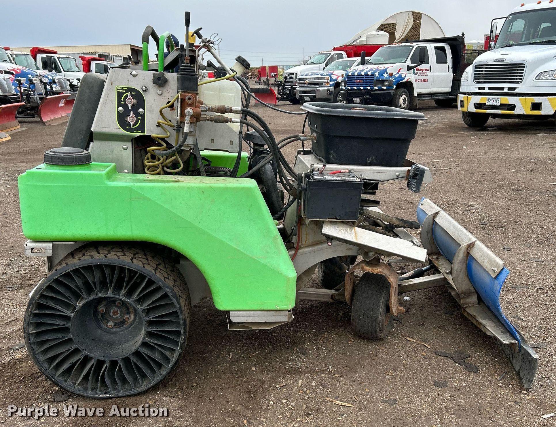 Steel Green SG42 turf sprayer. Hours: 223 on meter, Serial: SG42-20009. Engine Vanguard, Cylinders: 2, Fuel type: Gas. Transmission Hydrostatic. Features 60" plow, (2) sprayer tanks Capacity: 15 gallons, Spreader hopper. Tires Front: 13x6.50-6, Rear: 24x12N11. Notes. Bluegrass Landscape & Snow Management. Bridgeton, MO 63044