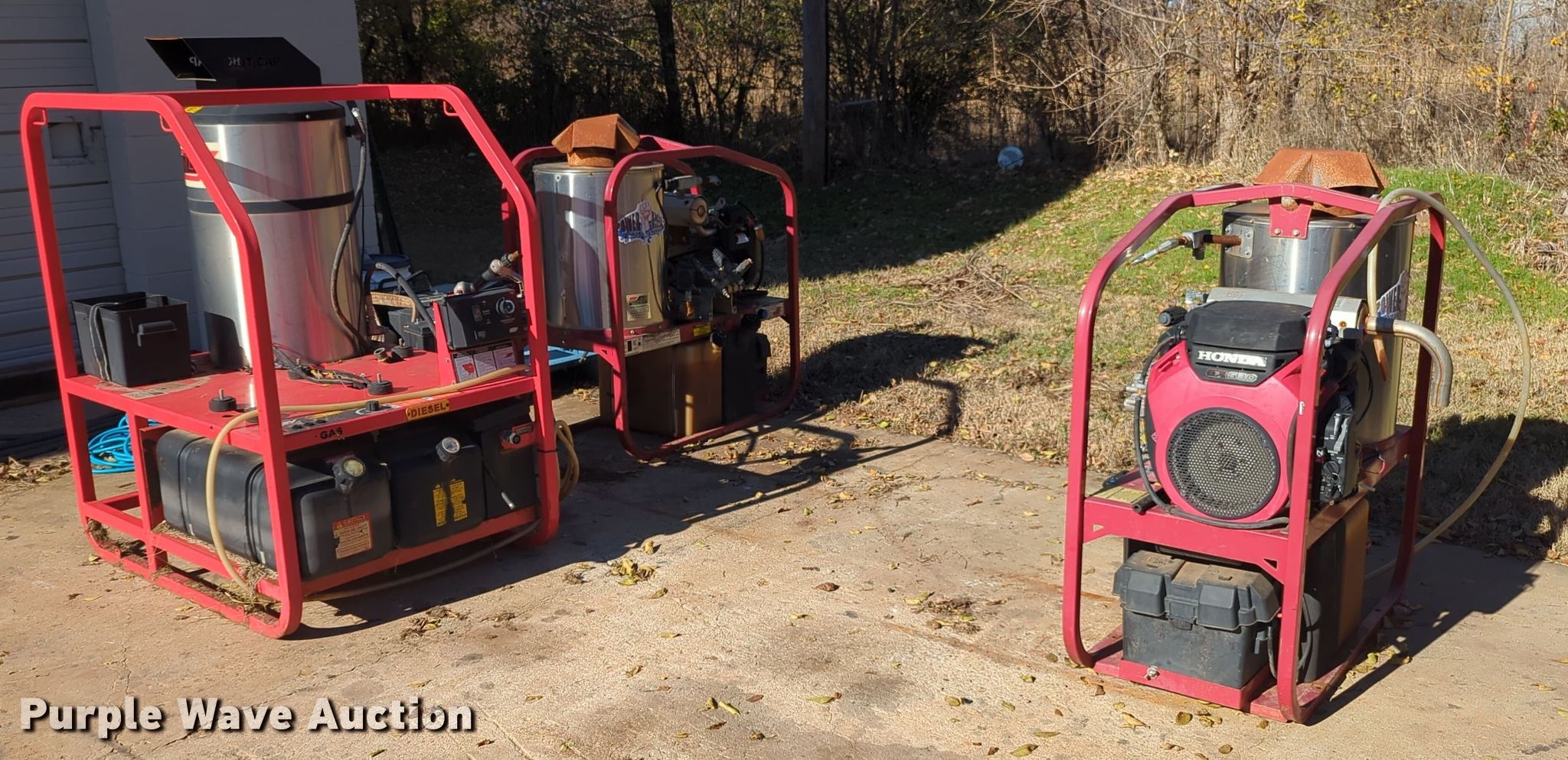 Purple Wave is selling a used Pressure Washer in Oklahoma. This item is a (3) Hotsy pressure washers with the following: Honda 2 cylinder gas engine, Diesel burner, (2) non-operational units, One with carburetor issues, may need replaced, One with engine missing