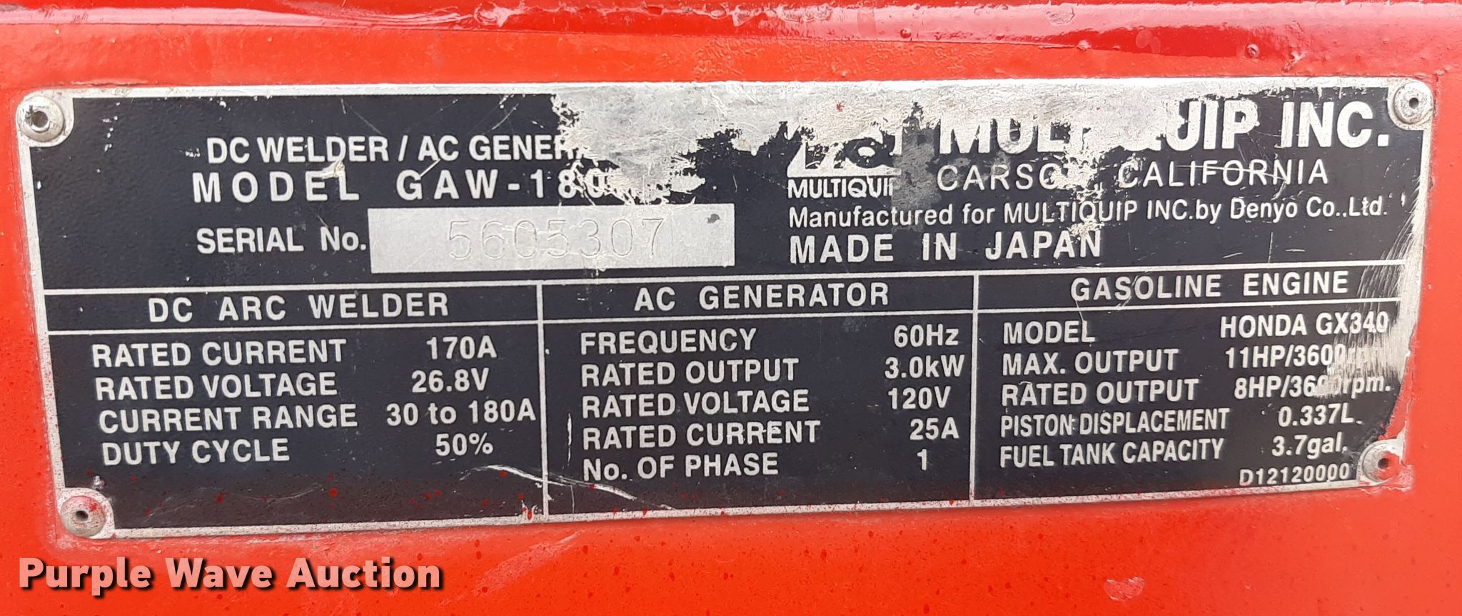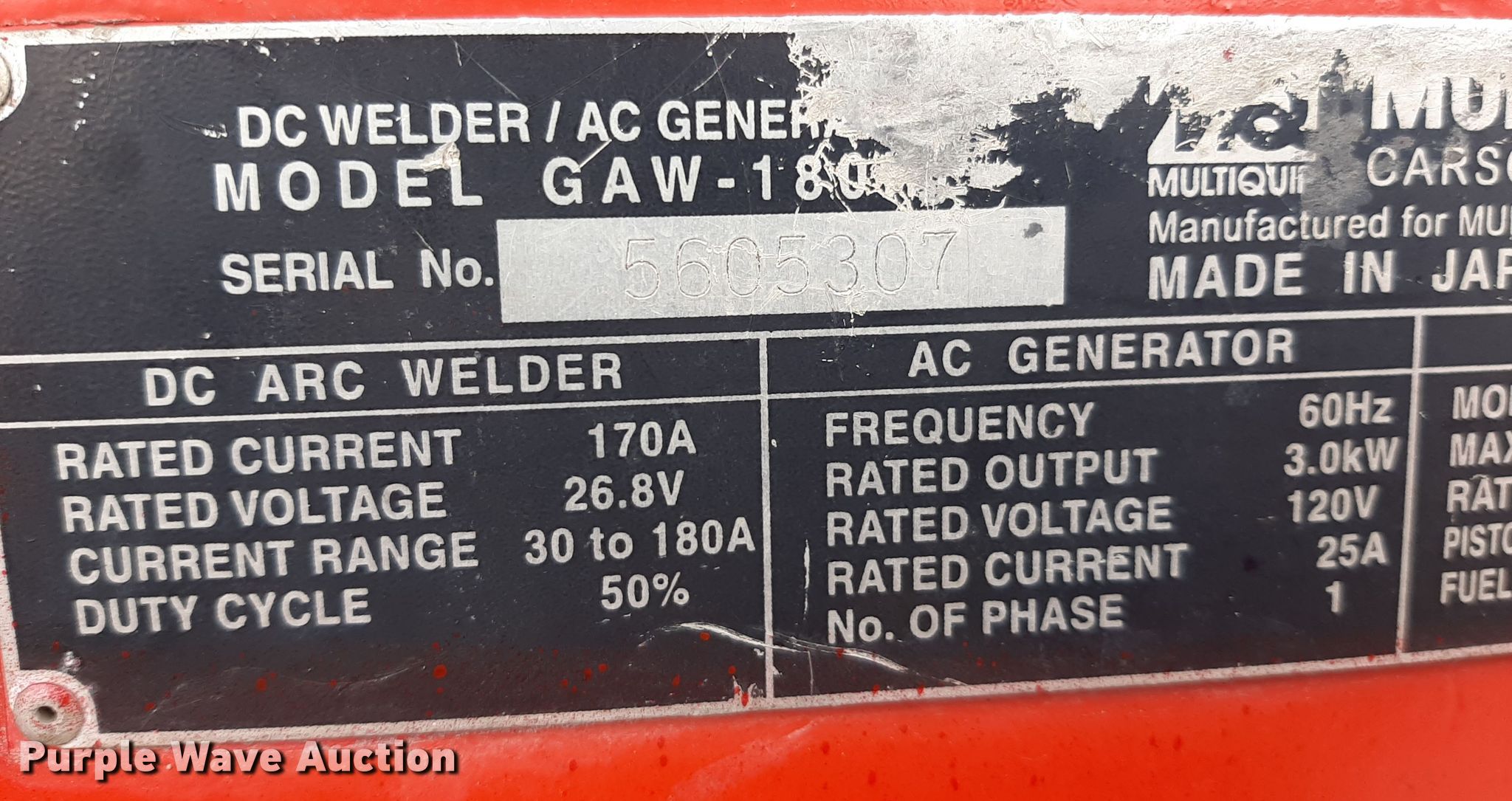 Purple Wave is selling a used Welder (Manual) in Kansas. This item is a Multiquip GAW-180HE welder/generator with the following: Unit still in use, Serial: 5605307