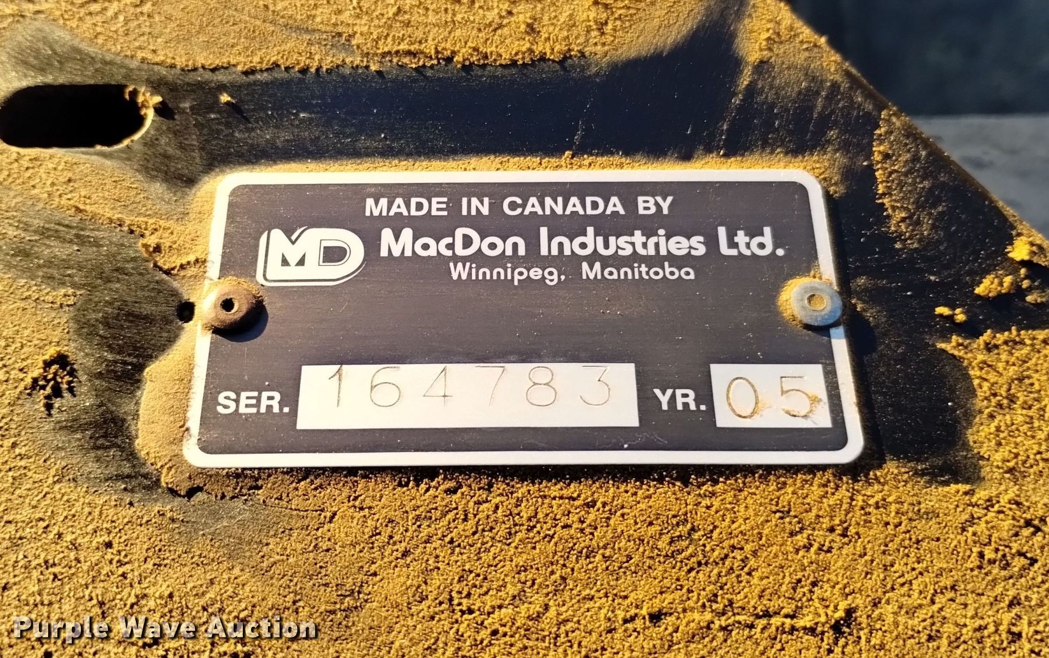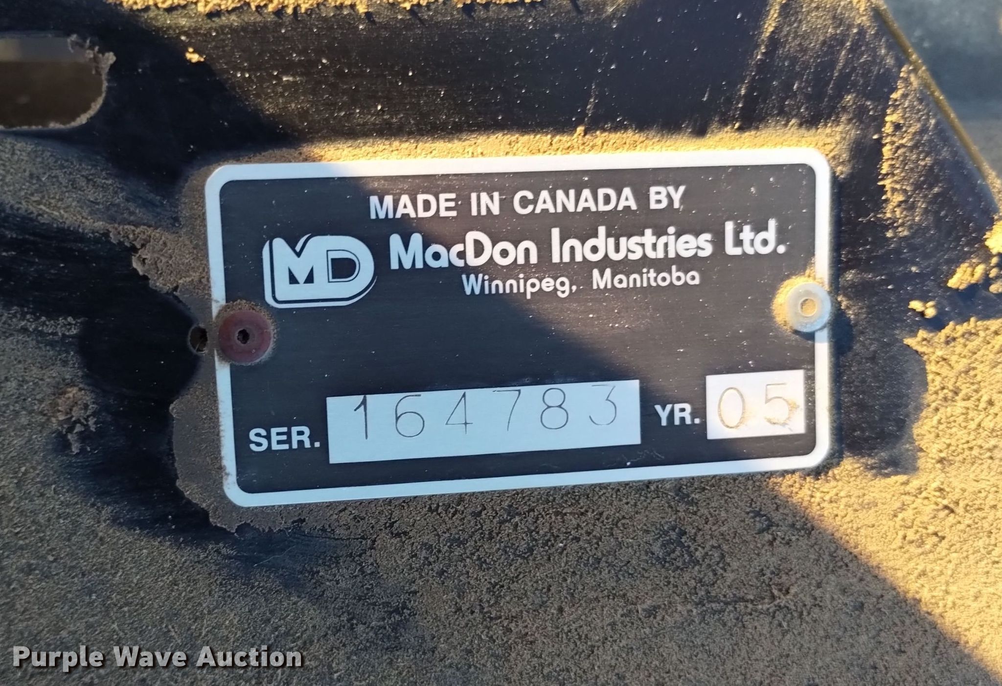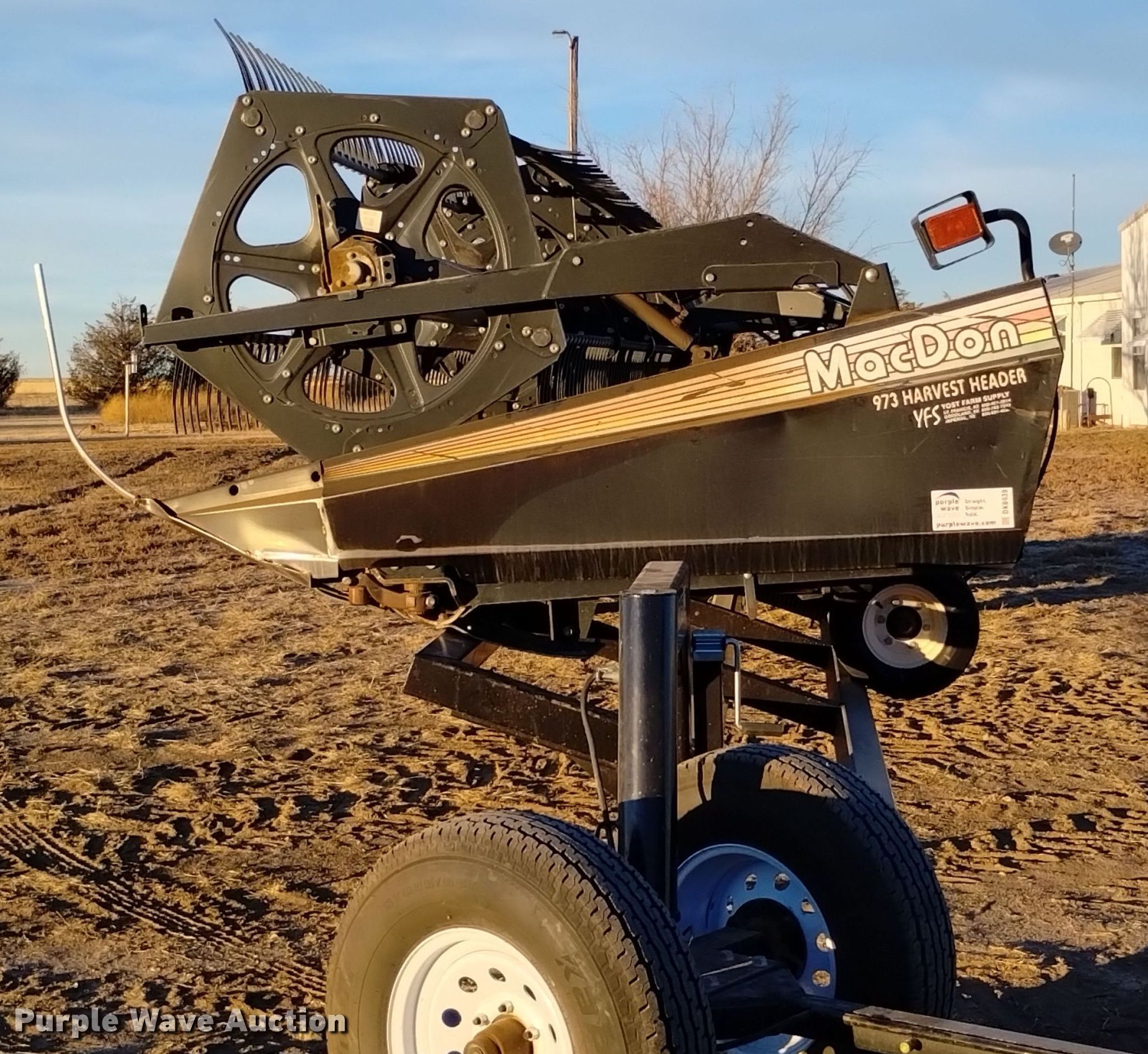 2005 MacDon 973 draper head. Serial: 164783. Features Width: 36', Reel: Finger Hydraulic reel height control, Skid plates: Poly, Single point coupler, Drivelines: Single. Tires Tire size: 20.5-8.00. Notes Trailer not included. Harmon Ranch. Springfield, CO 81073