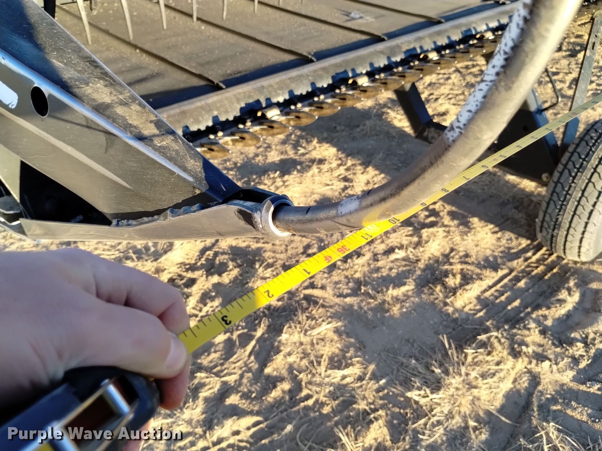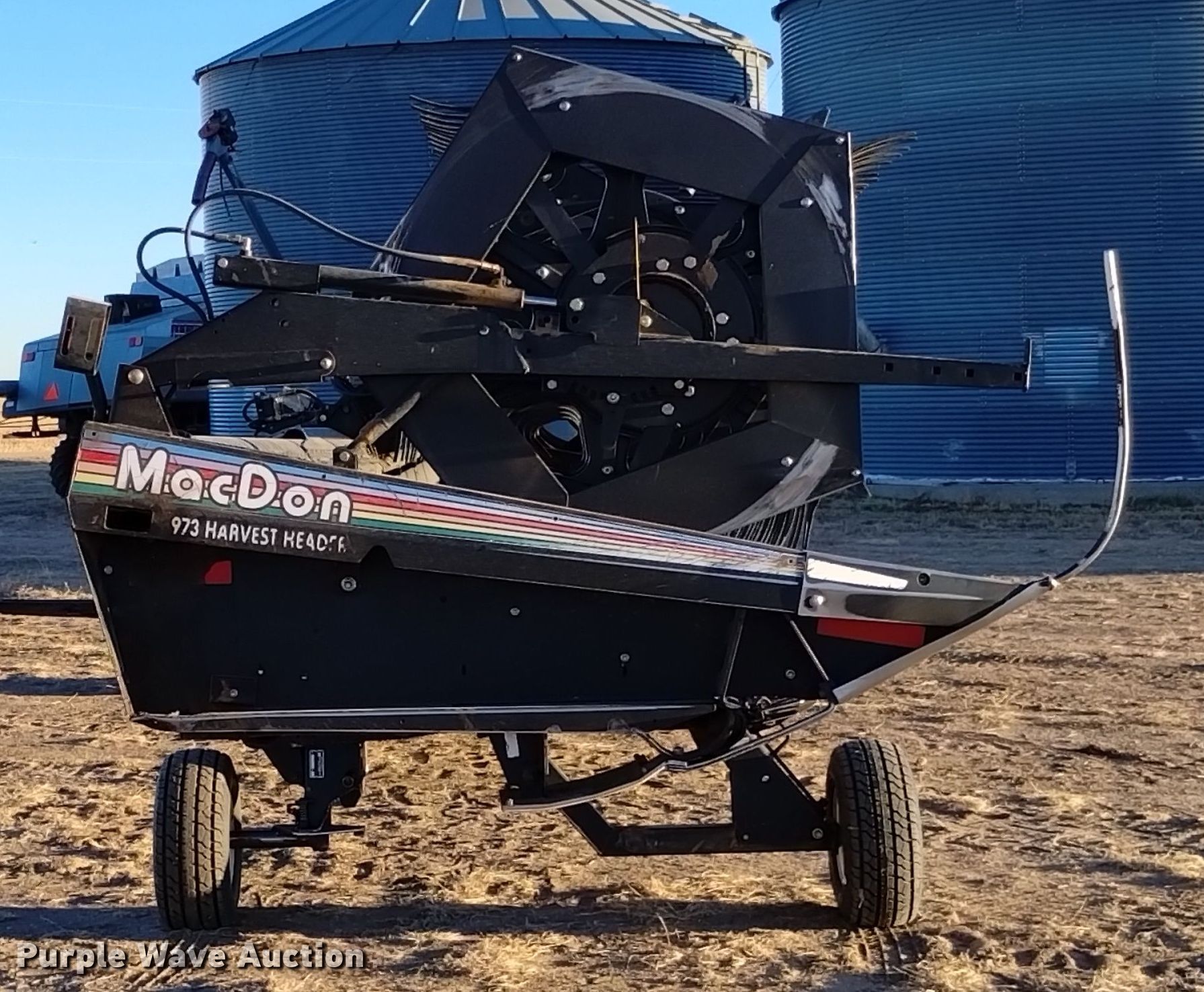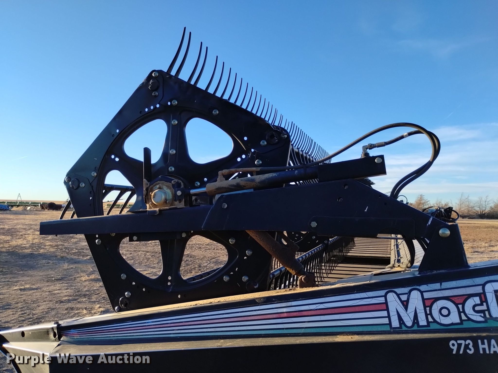 2005 MacDon 973 draper head. Serial: 164742. Features Width: 36', Reel: Finger Hydraulic fore/aft, Hydraulic reel height control, Skid plates: Poly, Transport package, Single point coupler, Drivelines: Single. Tires Tire size: 20.5-8.00. Harmon Ranch. Springfield, CO 81073