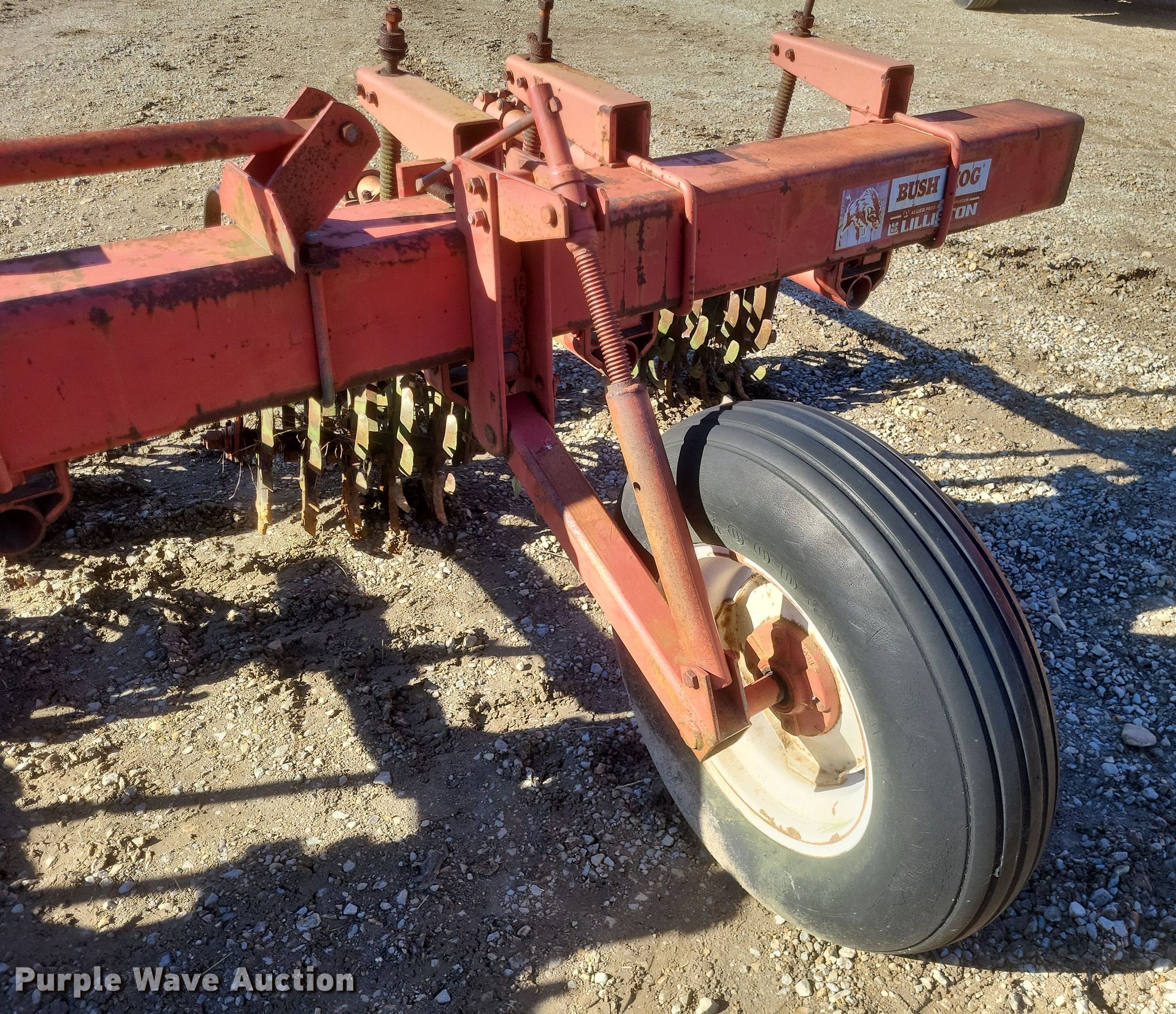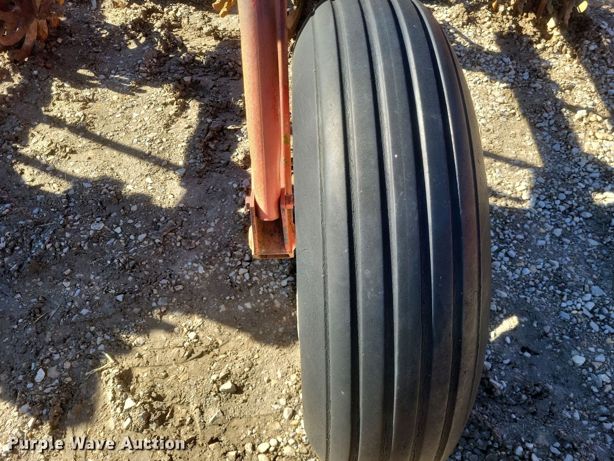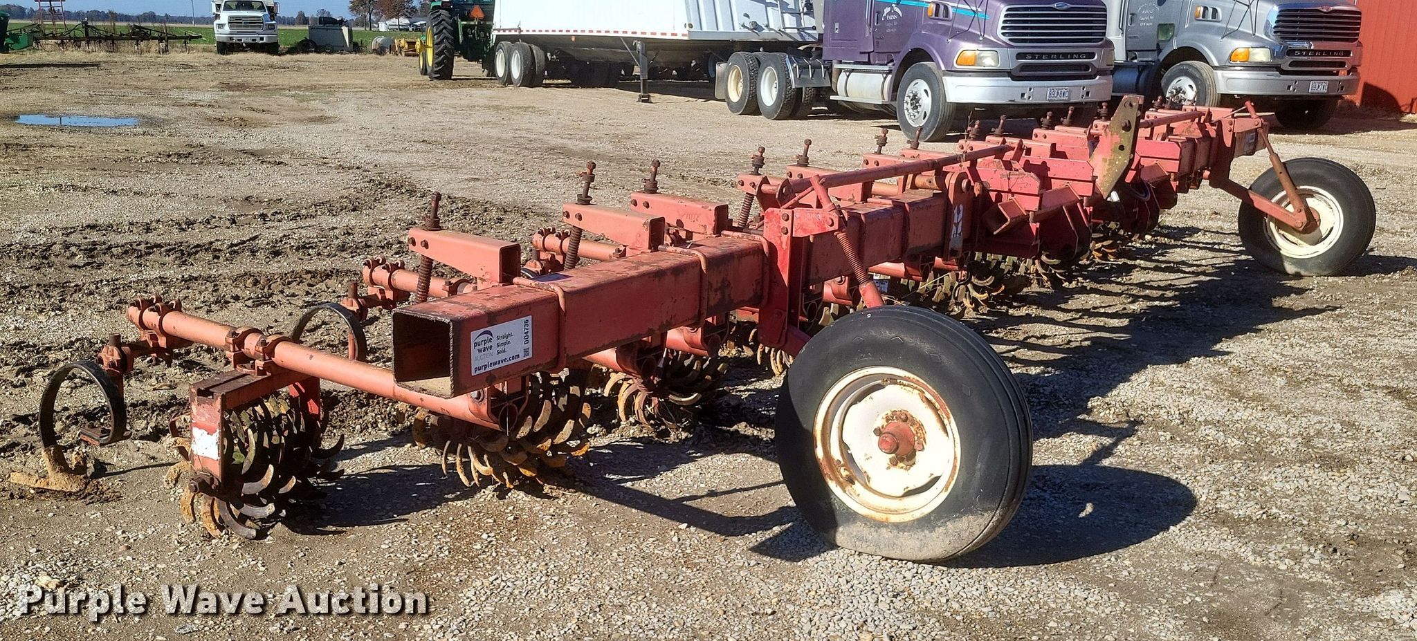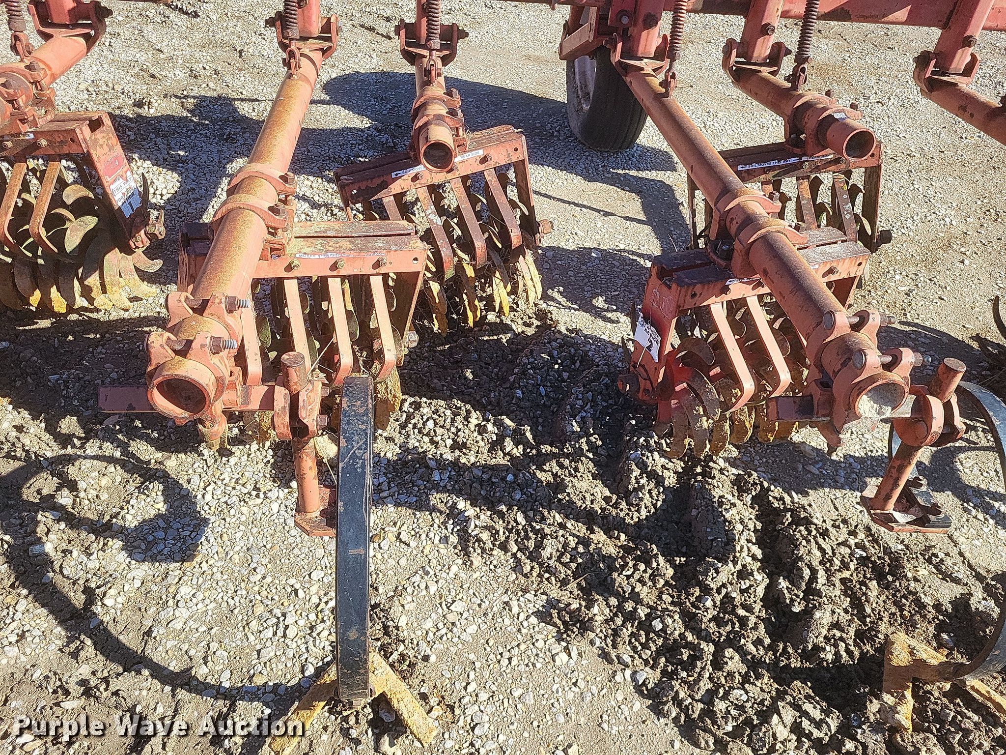 Lilliston row crop cultivator. Overall width: 25' 5". Features 36" rows, 10" sweeps, Hitch: Three point, Gauge wheels Size: 7.60-15. Allen Tesreau Farms Retirement Auction. 16284 County Rd 206. Campbell, MO 63933