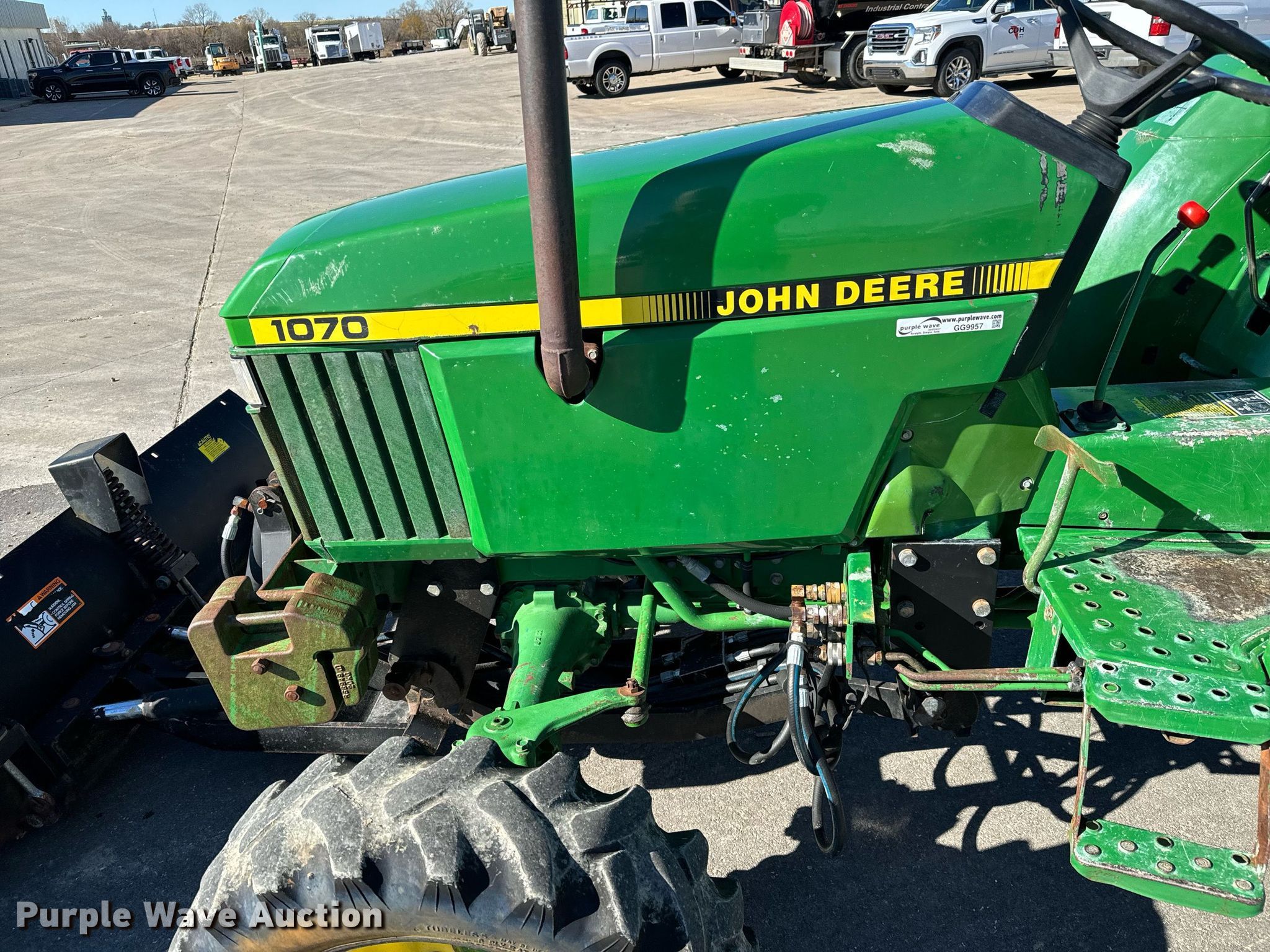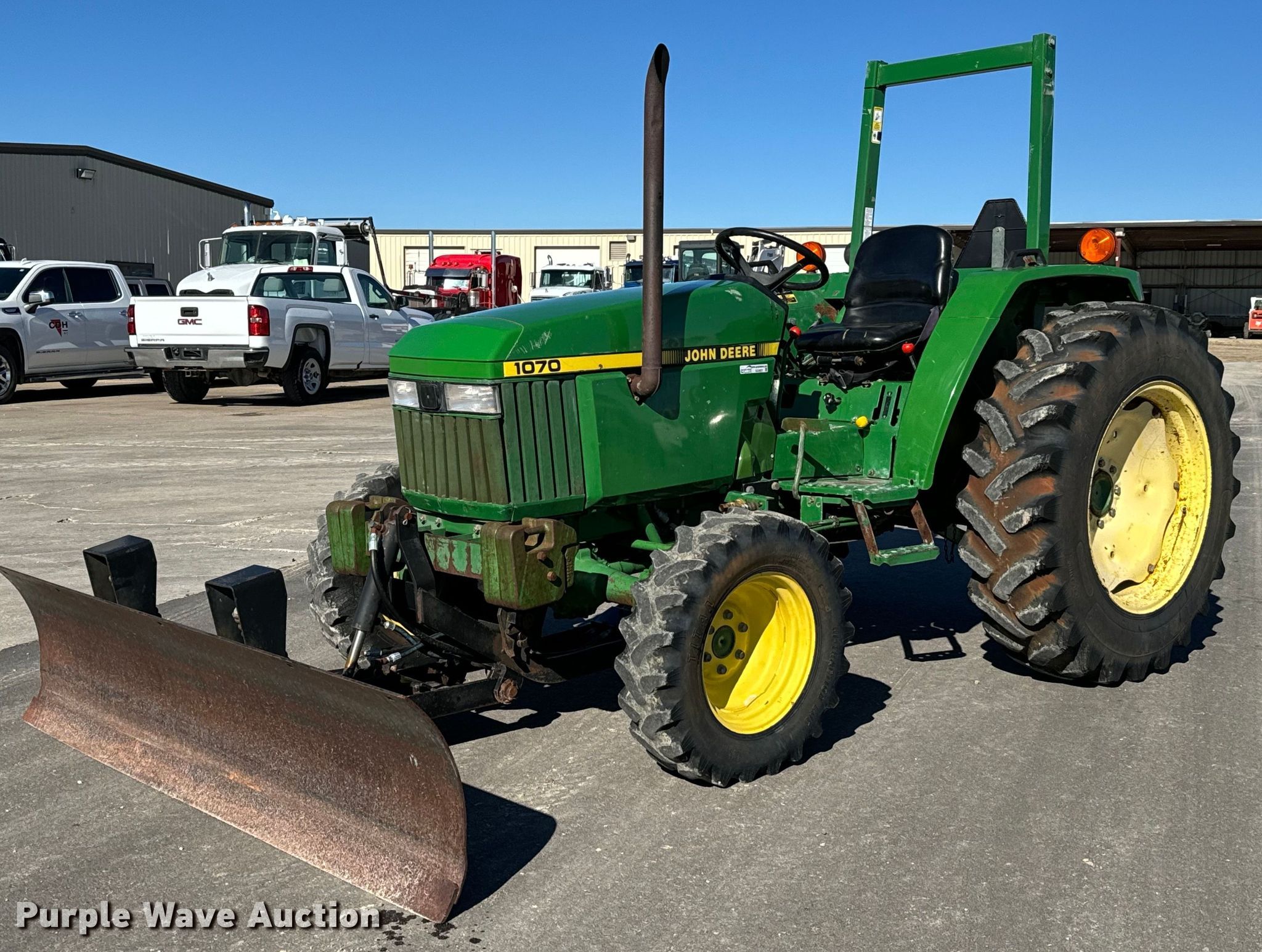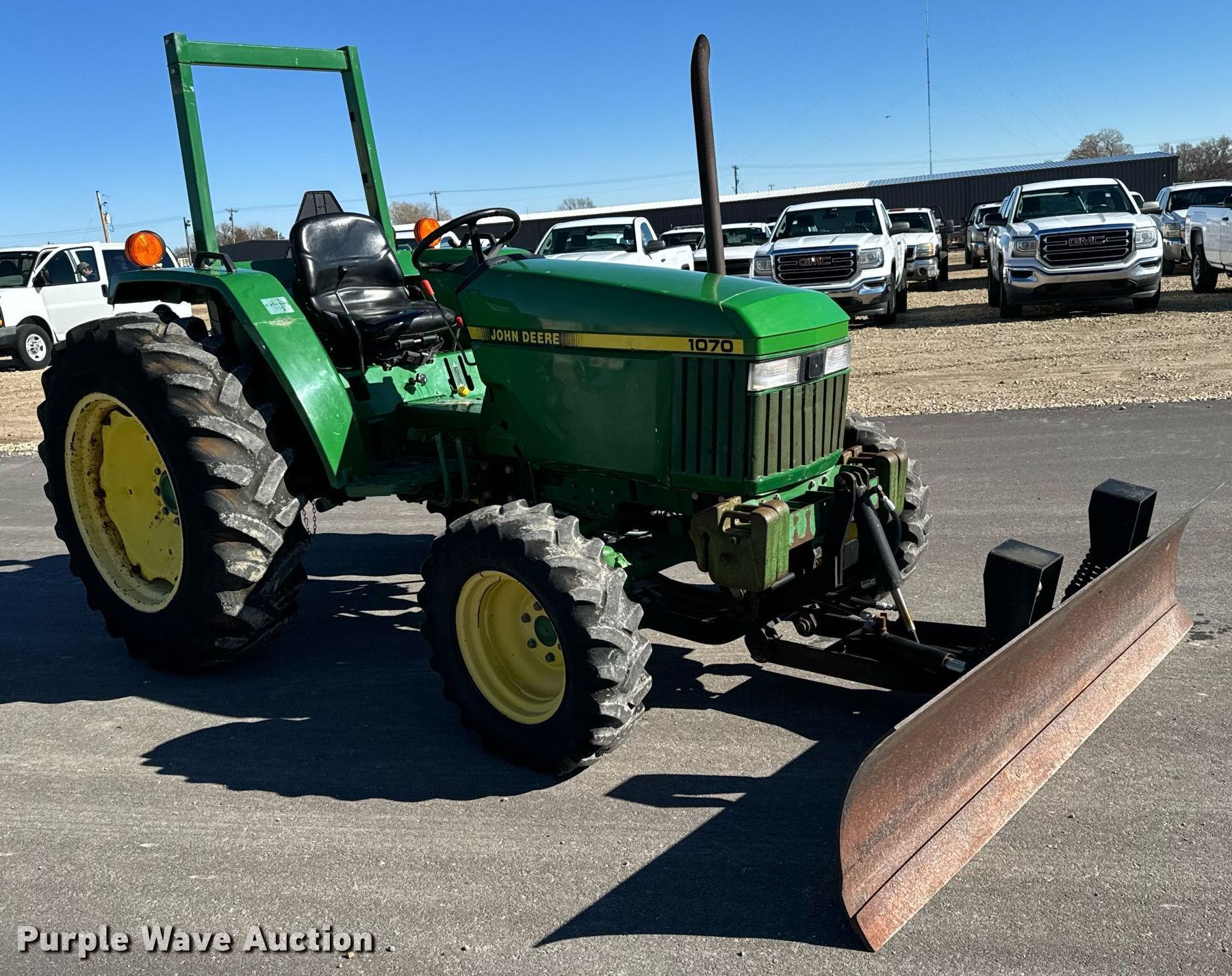 1997 John Deere 1070 MFWD tractor. Hours: 2,393 on meter, Serial: M01070A160291. Engine John Deere 4TN84-RJK, Cylinders: 4, Fuel type: Diesel. Transmission Manual, 9F - 3R. Features PTO: 540, Three point Top link, Hydraulic remote sets Front: 2, Suitcase weights: 4, Front blade John Deere , Width: 84", Height: 20", Blade controls: Joystick. Tires Front: 8-16, Rear: 13.6-28. CD&H, Inc.. El Dorado, KS 67042