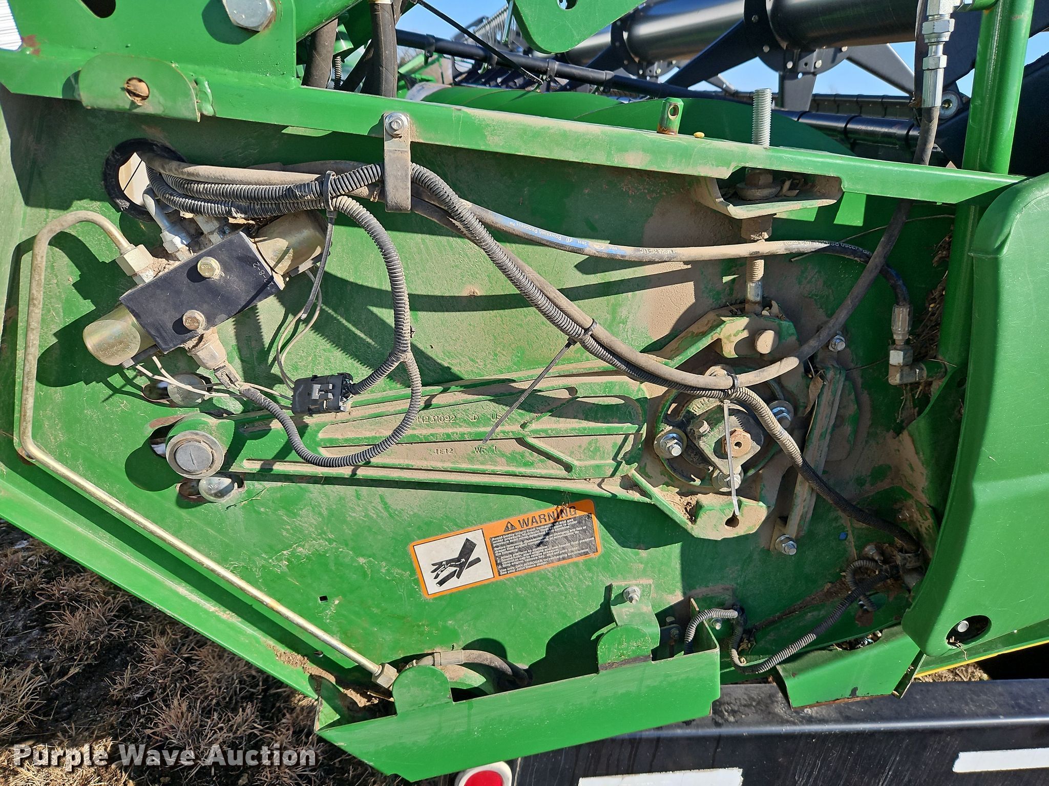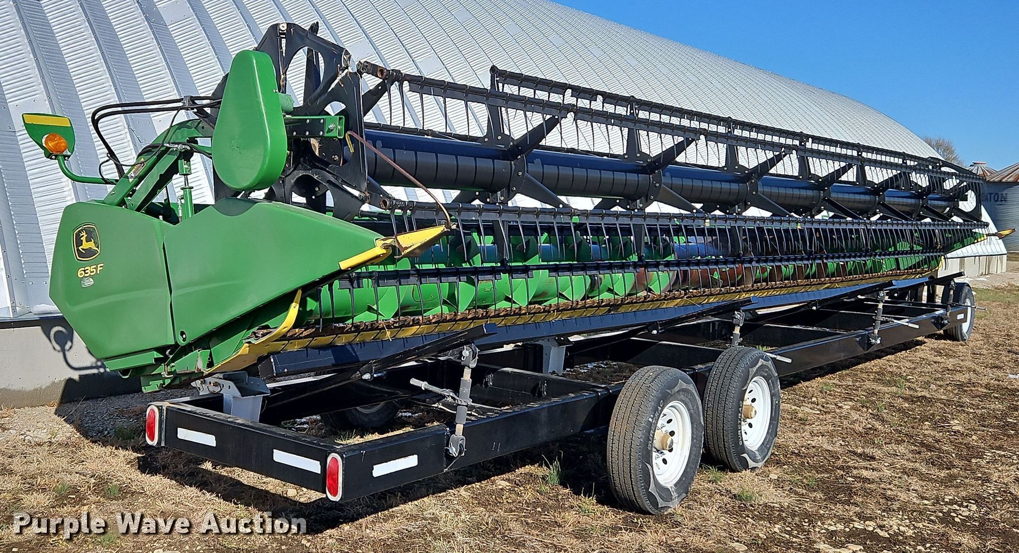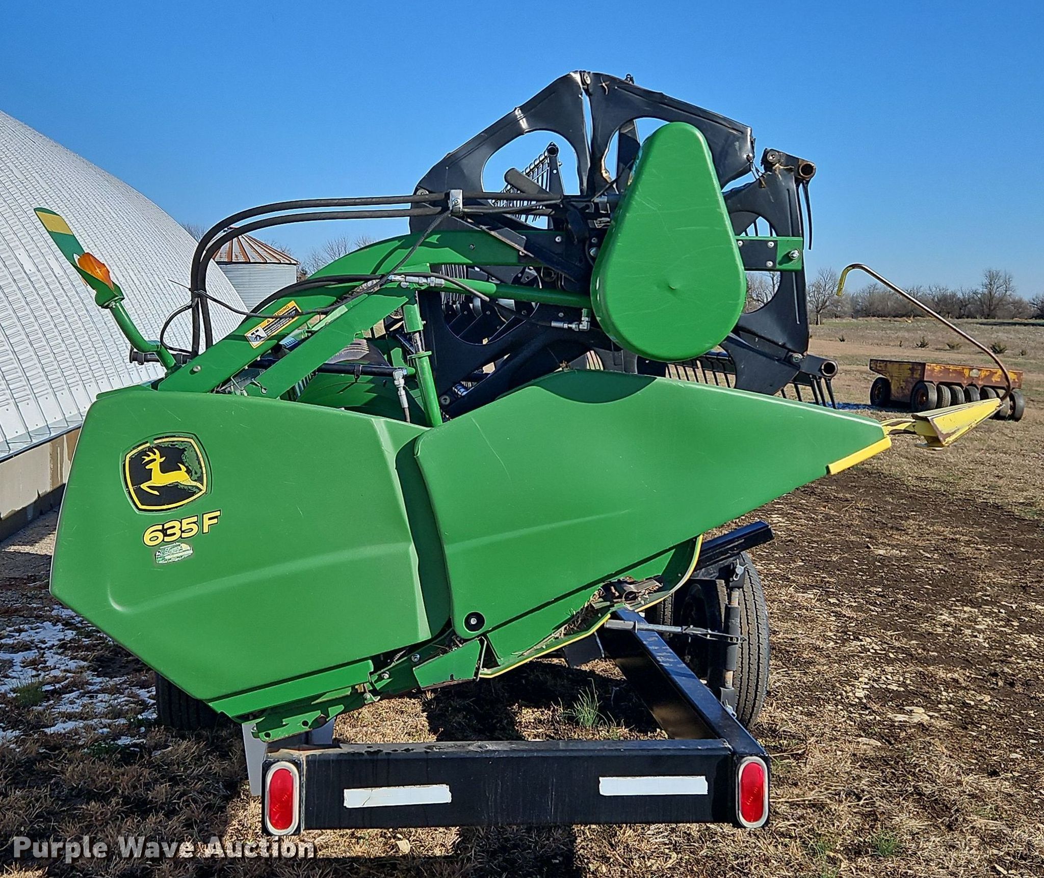 2011 John Deere 635F flex head. Serial: 1H00635FEB0742471. Features Width: 35', Reel: Finger Hydraulic fore/aft, Hydraulic reel height control, Skid plates: Poly, Single point coupler, Drivelines: Single, Full finger auger. Notes Trailer not included, Reel needs repairs. Iola , KS 66749