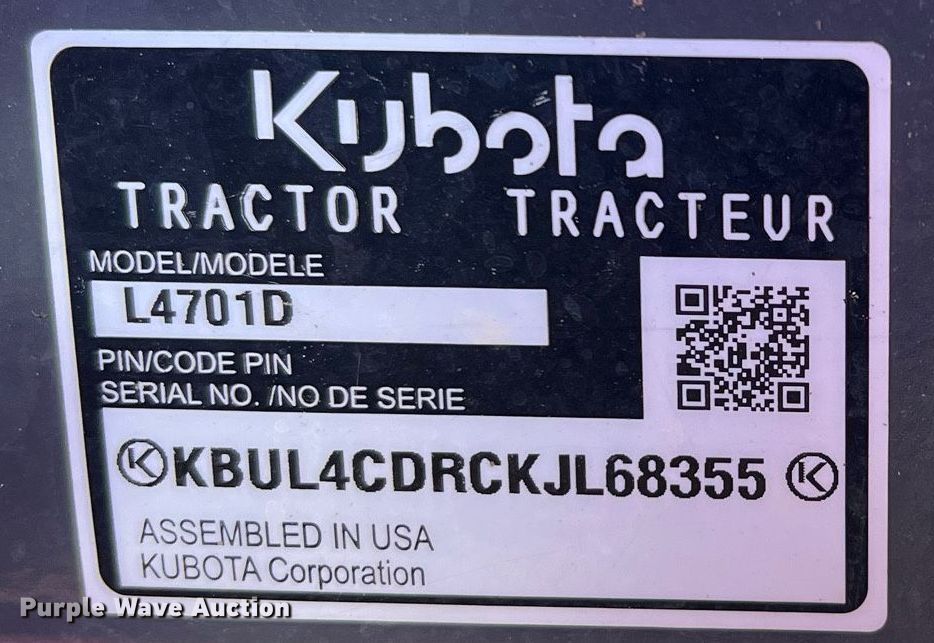 Purple Wave is selling a used Tractor in Texas. This item is a 2020 Kubota L4701DT MFWD tractor with the following: Hours: 198 on meter, Serial: KBUL4CDRCKJL68355, Unit #: M02217