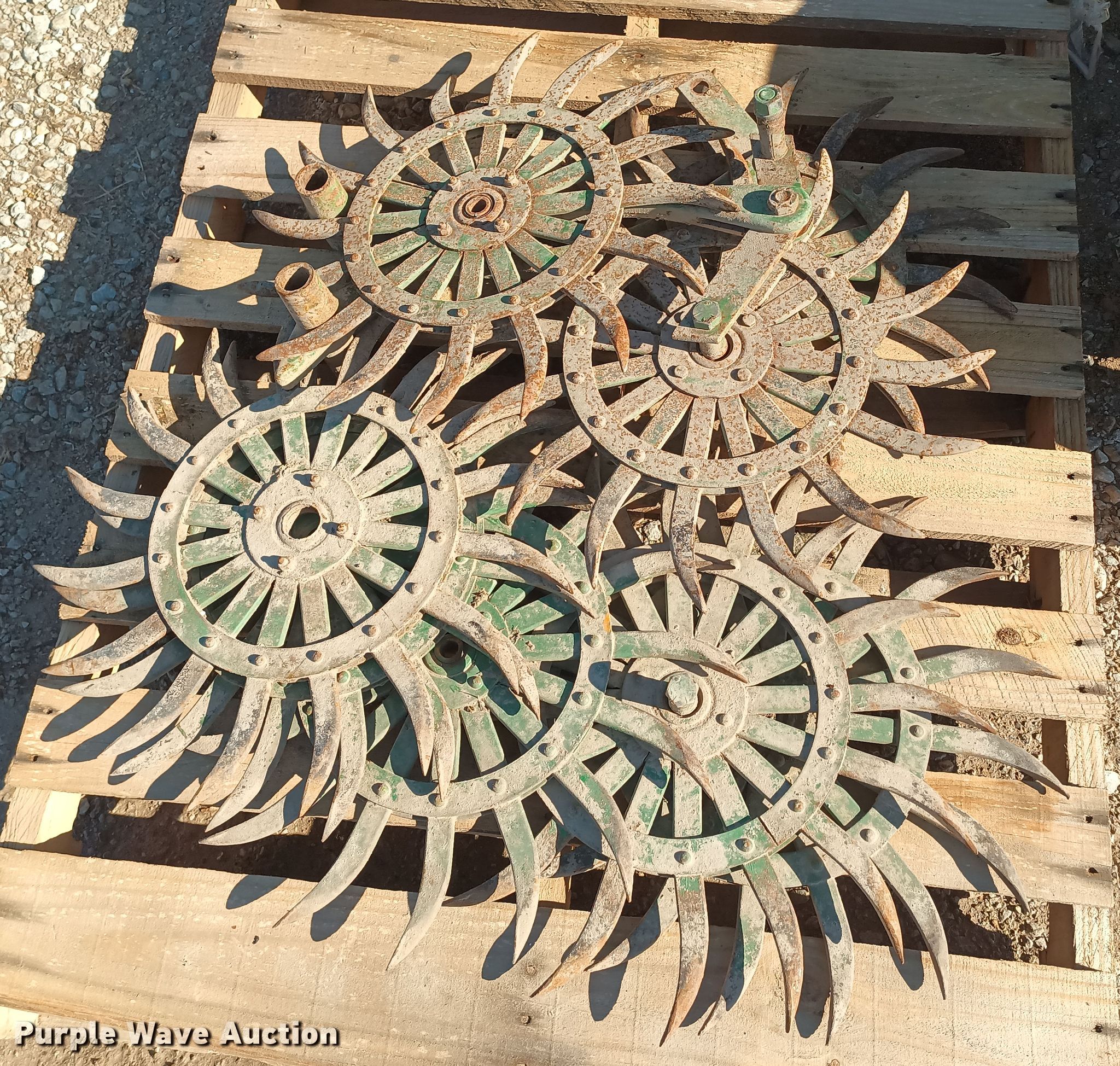 John Deere EO400 rotary hoe. Overall width: 30', Serial: 005858N. Features Diameter: 20", Spacing: 2", Hydraulic fold, Leveler: Manual, Hitch: Three point. Notes Extra wheels included. 2682 Barton County Boulevard. Golden City, MO 64748