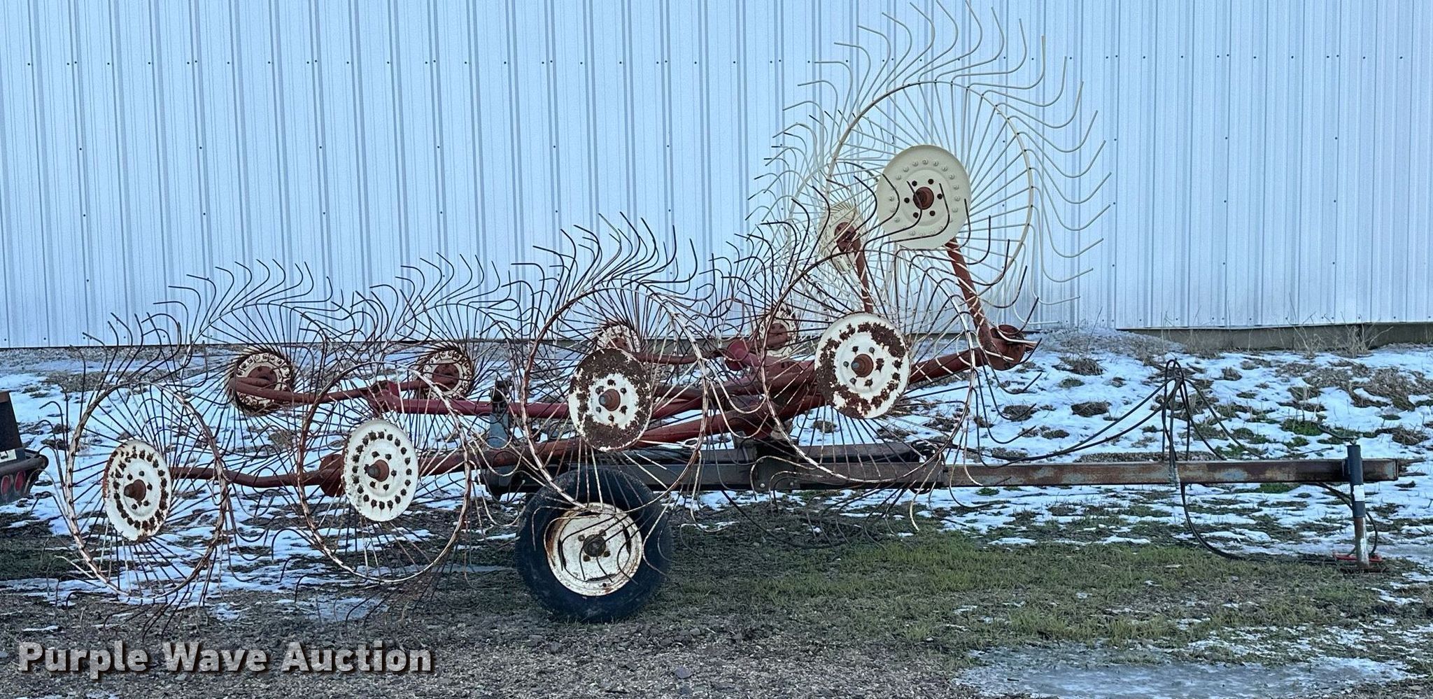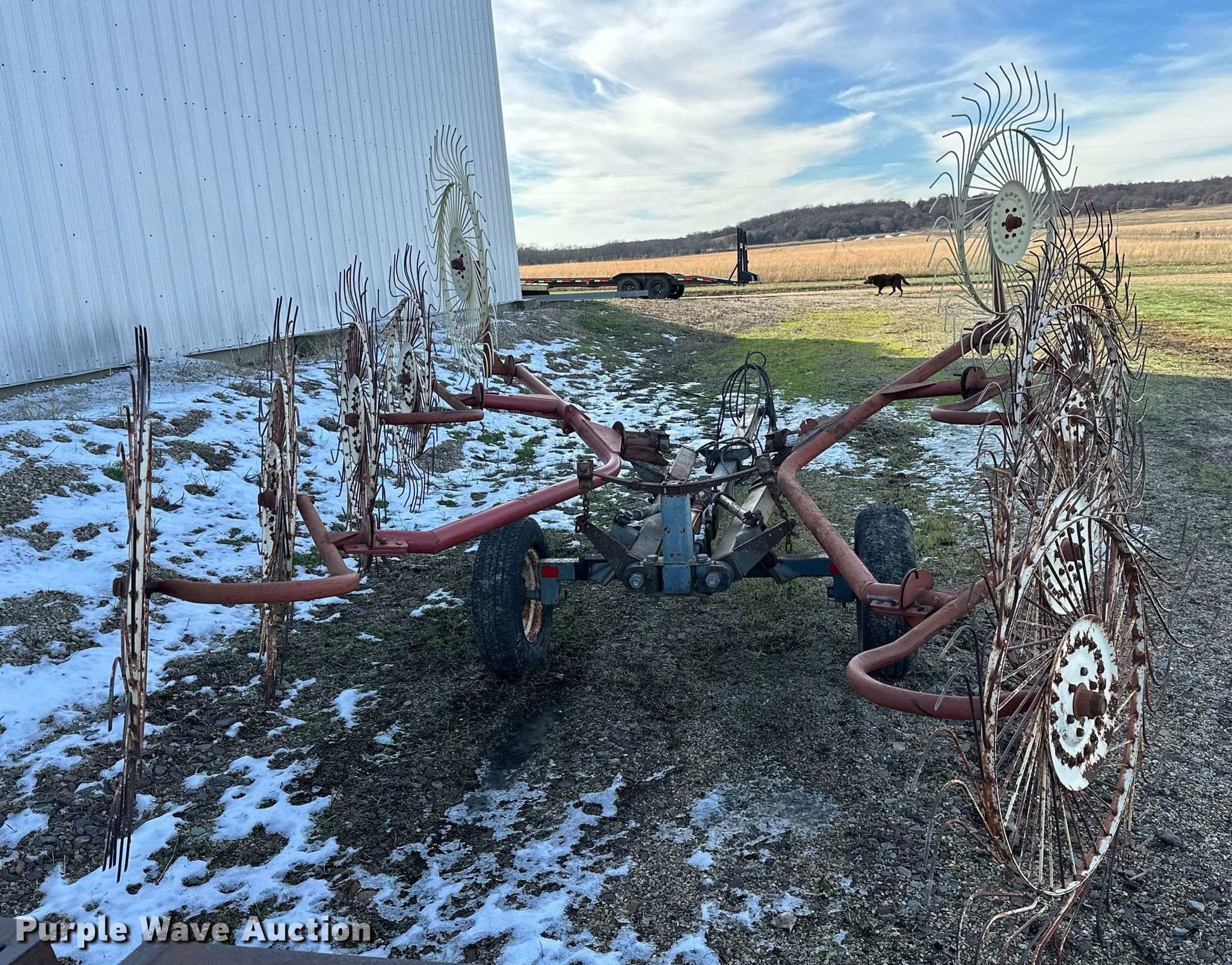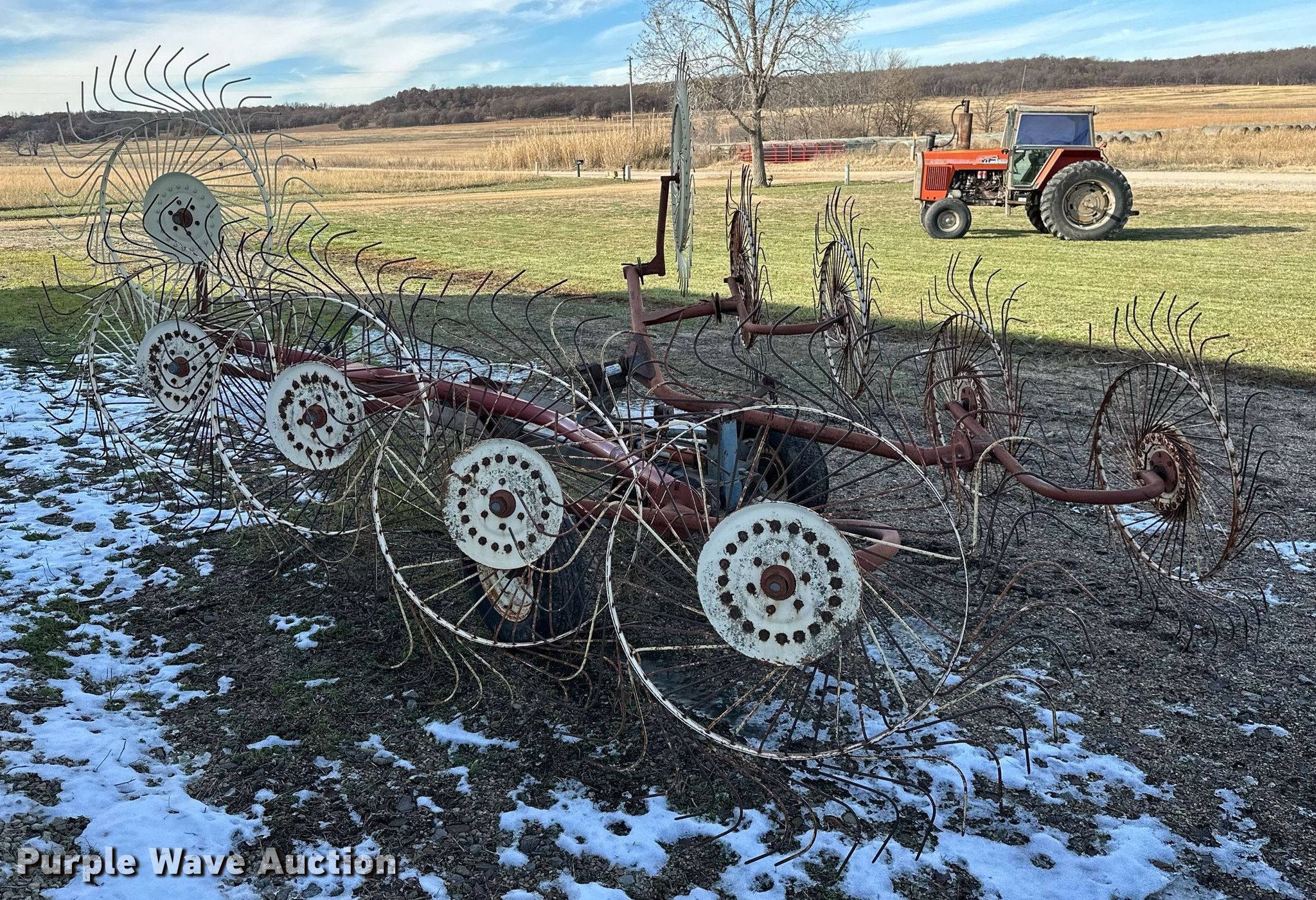 Purple Wave is selling a used Hay Rake in Kansas. This item is a OMI AGC hay rake with the following: Wheels: 10, Diameter: 55", Hydraulic lift, Hydraulic fold, Ground driven