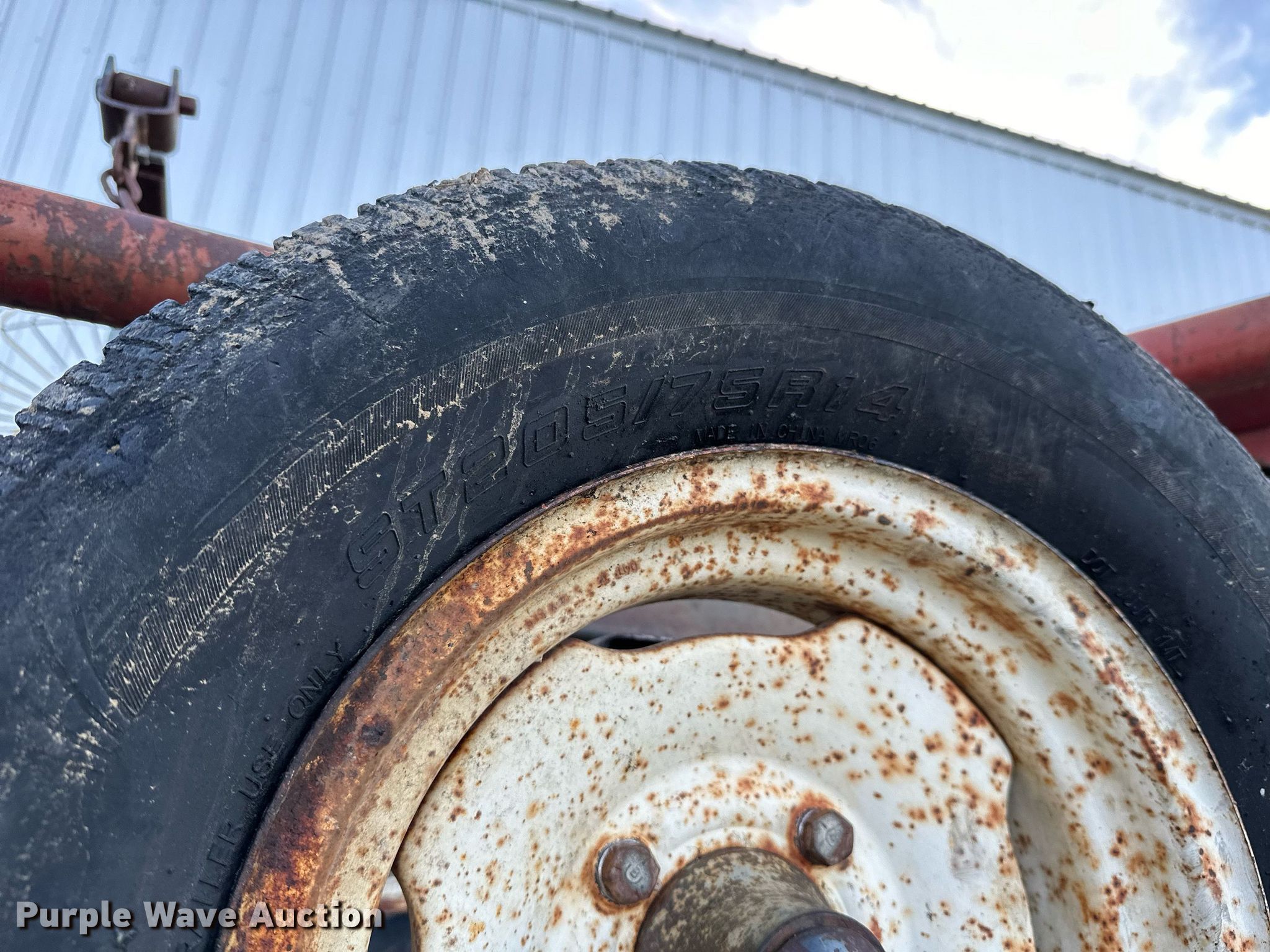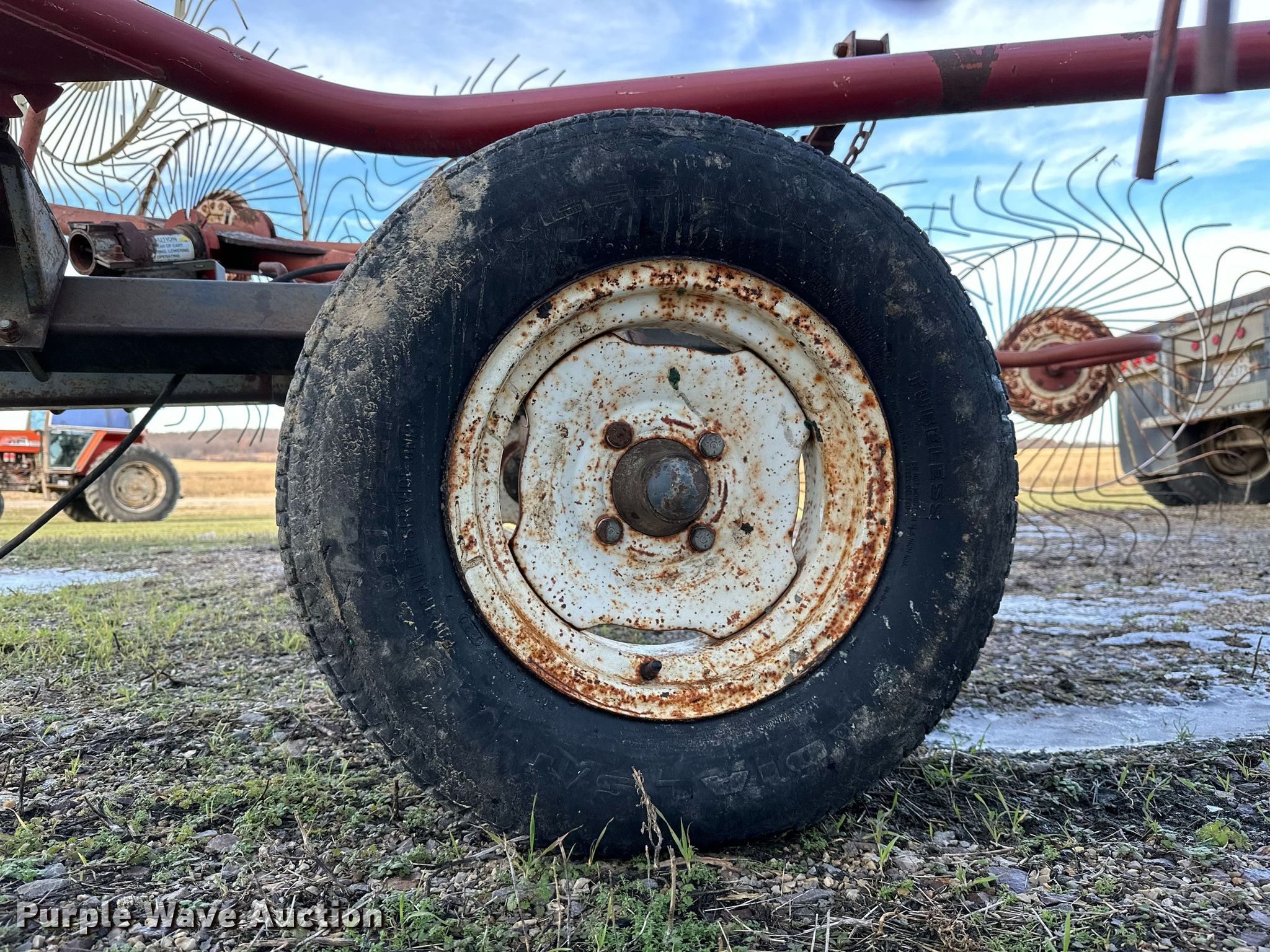 OMI AGC hay rake. Wheels: 10 Diameter: 55", Hydraulic lift, Hydraulic fold, Ground driven. Tires Size: ST205/75R14. KC Farms. 3473 2100 Rd. Fredonia, KS 66736