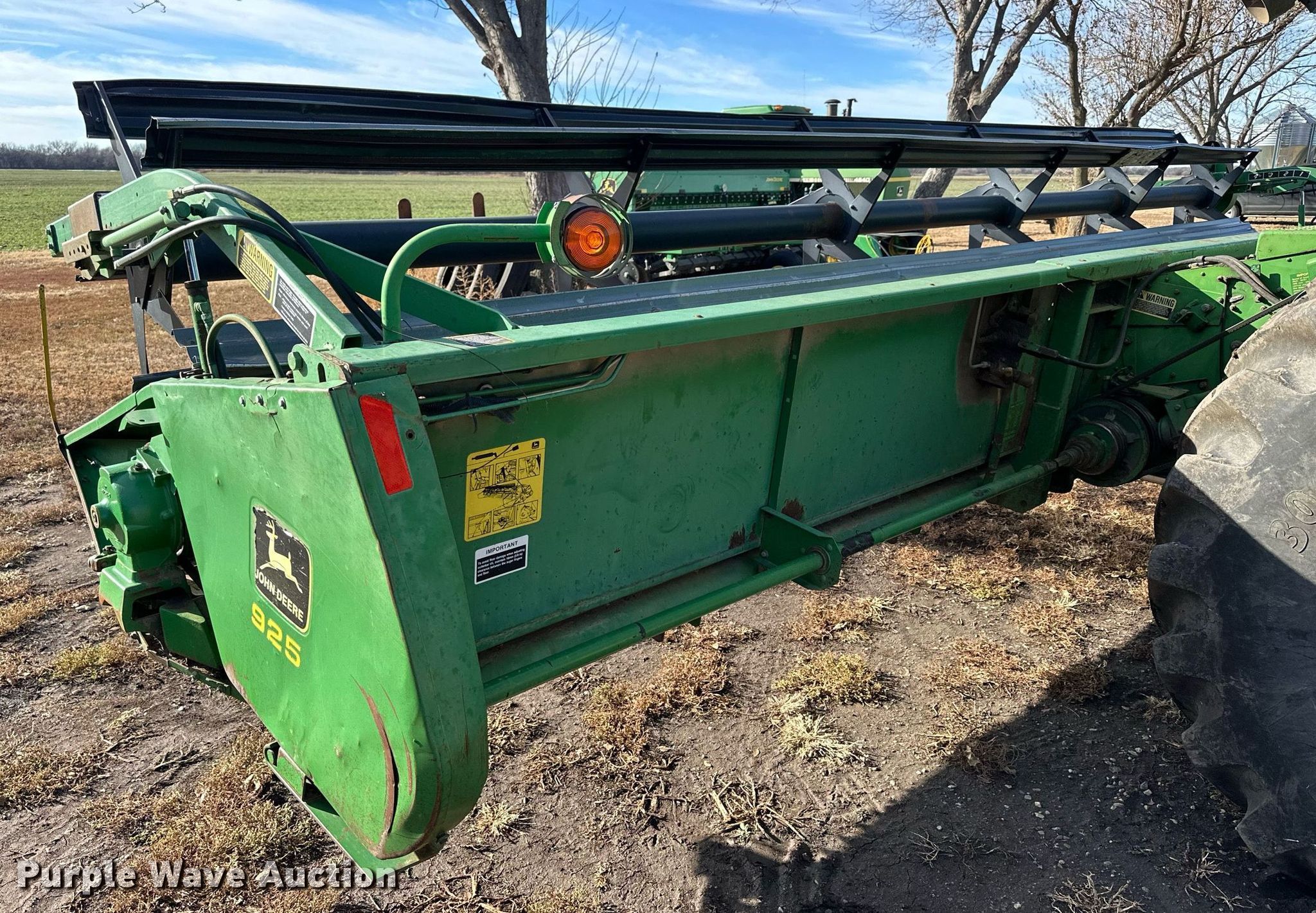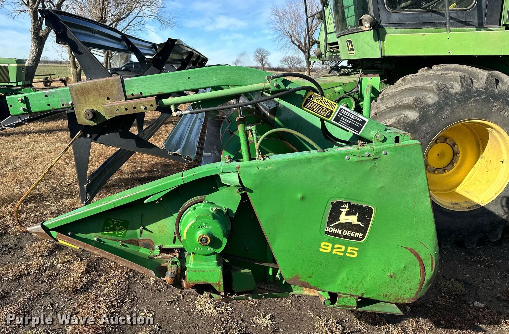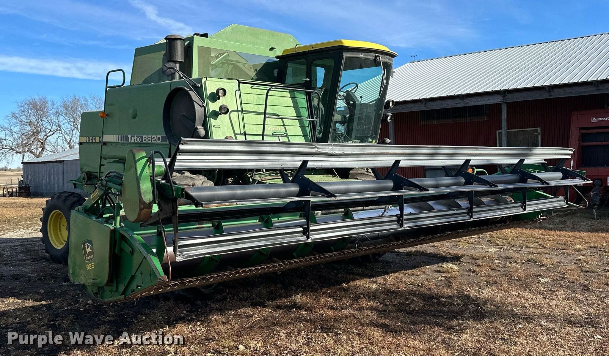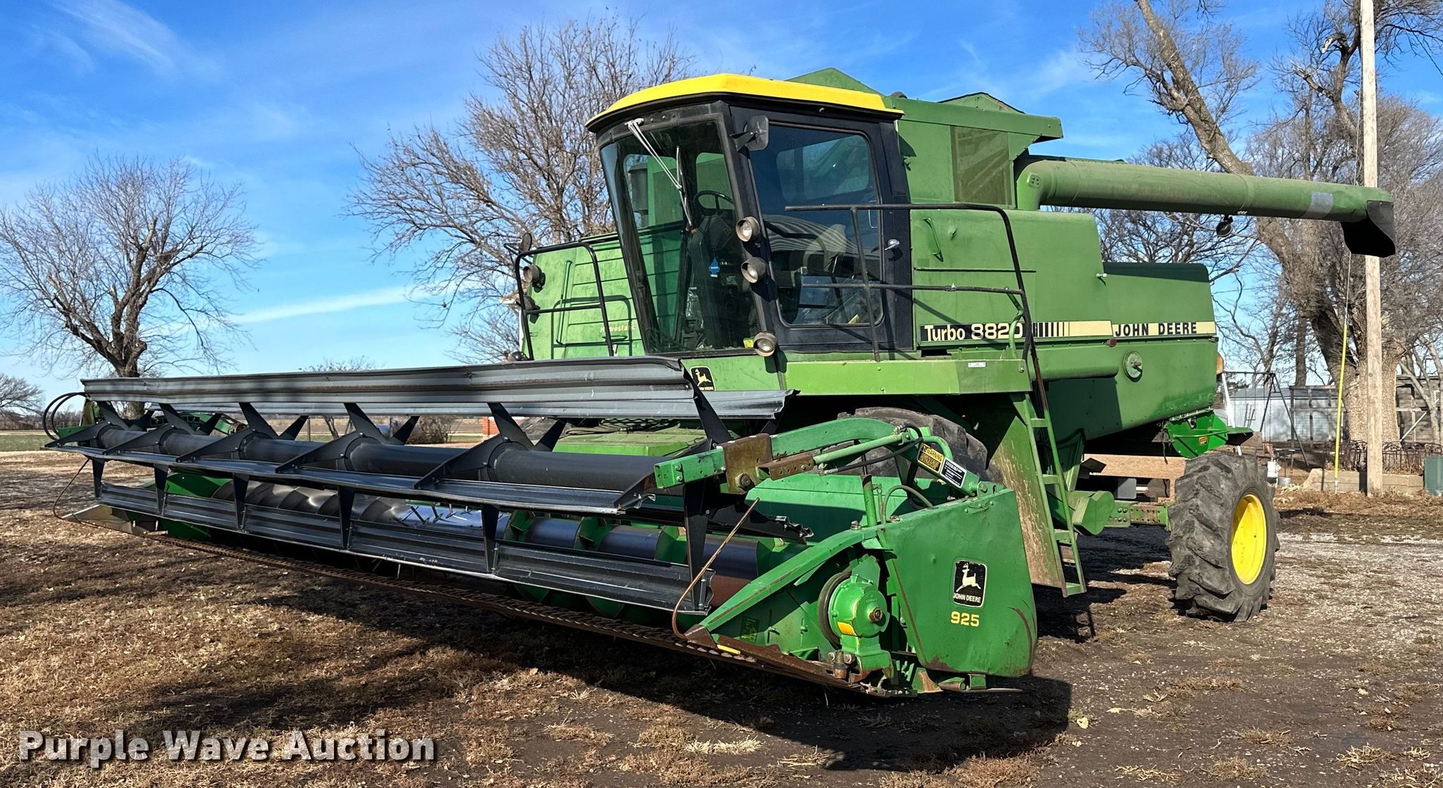 1983 John Deere 8820 combine. Engine hours: 2,482 on meter, Serial: H08820X564616. Engine John Deere 6466AH-02, Serial: RG6466A248400, Displacement: 7.6L, Cylinders: 6, Fuel type: Diesel. Transmission Hydrostatic. Interior AC, Heat. Features Feederhouse: Variable speed, Reverser, Concaves: Round, Chaff spreader, Straw chopper, Bin: Extensions, Unloading auger length: 15', Header 1993 John Deere 925, Serial: H00925P651354, Platform head Rigid, Width: 25', Reel: Bat Hydraulic fore/aft, Hydraulic reel height control, Skid plates: Steel, Single point coupler, Drivelines: Dual. Tires Front: 30.5L-32, Rear: 16.9-26. 150 North 80th Road. Tescott, KS 67484