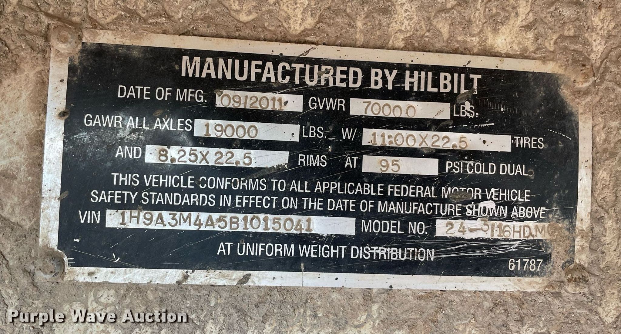 2011 Hilbilt 24-3/16 HD XL end dump trailer. VIN: 1H9A3M4A5B1015041, Unit #: 595.408. Dimensions Overall: 24' L x 96" W, Side height: 36'. Features Body type: Steel, Ram: Single, End gate: Air operated, Roll tarp. Chassis Landing gear: Dual, Suspension: Spring, Brakes: Air, Axles: Tandem, GVWR: 70,000 lbs. Tires Size: 11R22.5. Oklahoma title. Title distribution may be delayed up to 30 days from verification of funds. Duit Holdings, Inc. - Open inspection December 27, 2023. 7183 E Waterloo Industrial Road. Edmond, OK 73034