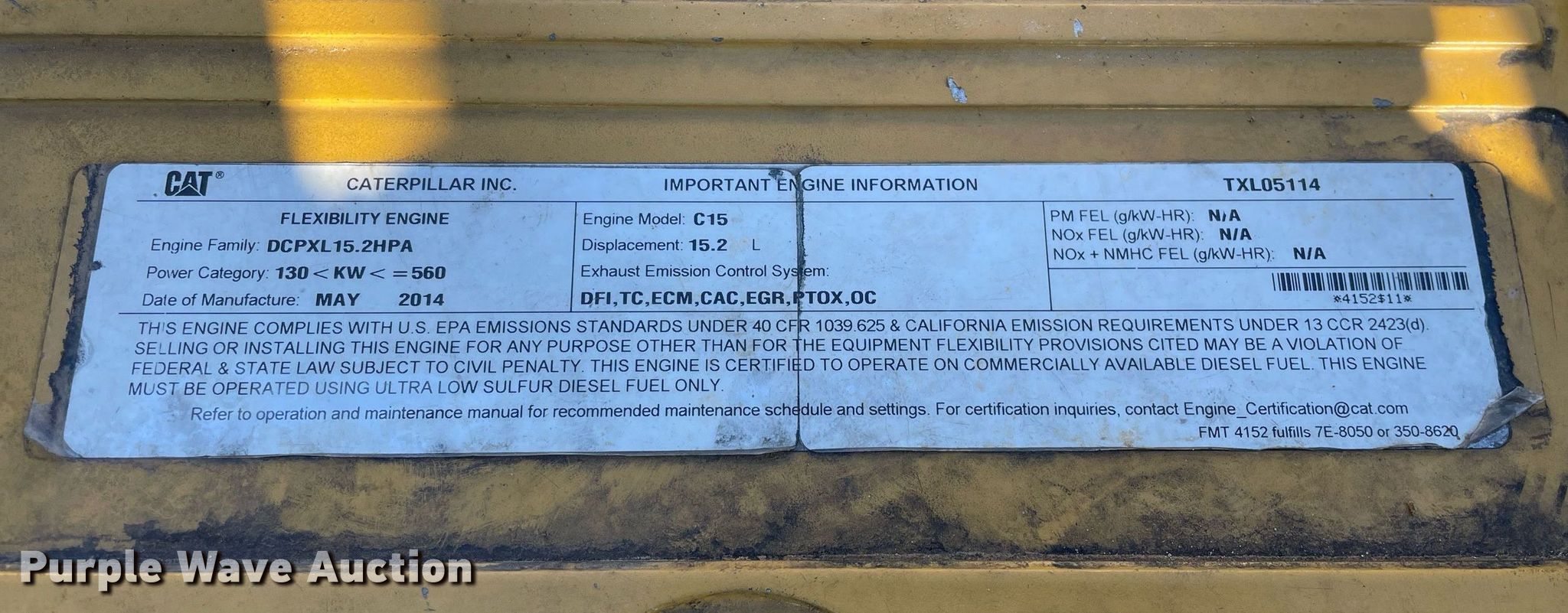 2015 Caterpillar 740B haul truck. Hours: 12,863 on meter, Serial: CAT0740BJT4R02747, Unit #: L-34. Engine Caterpillar C15, Displacement: 15.2L, Fuel type: Diesel. Transmission Automatic. Chassis Six wheel drive. Interior AC, Heat, Retarder, Backup camera, Auto lube. Features Dump bed Capacity: 43.5 tons. Tires Size: 29.5R25. Notes Exhaust stack removed but included , Belly pan removed but included. Flash, Inc.. 630 Commercial Avenue. Green Lake, WI 54941