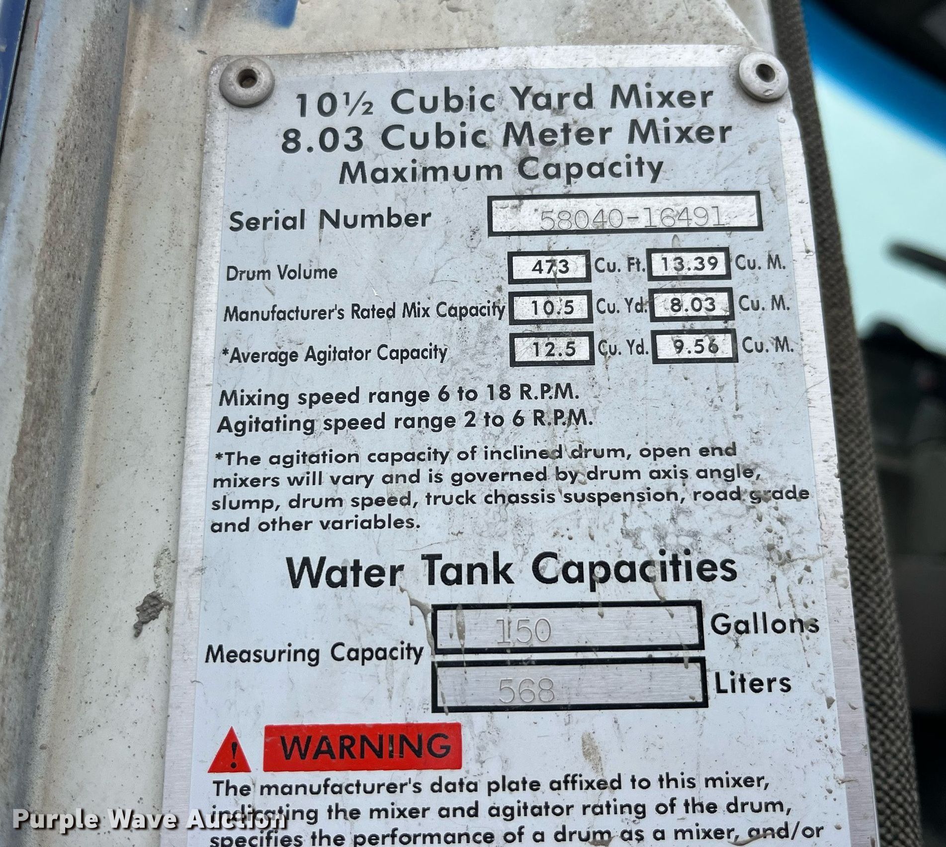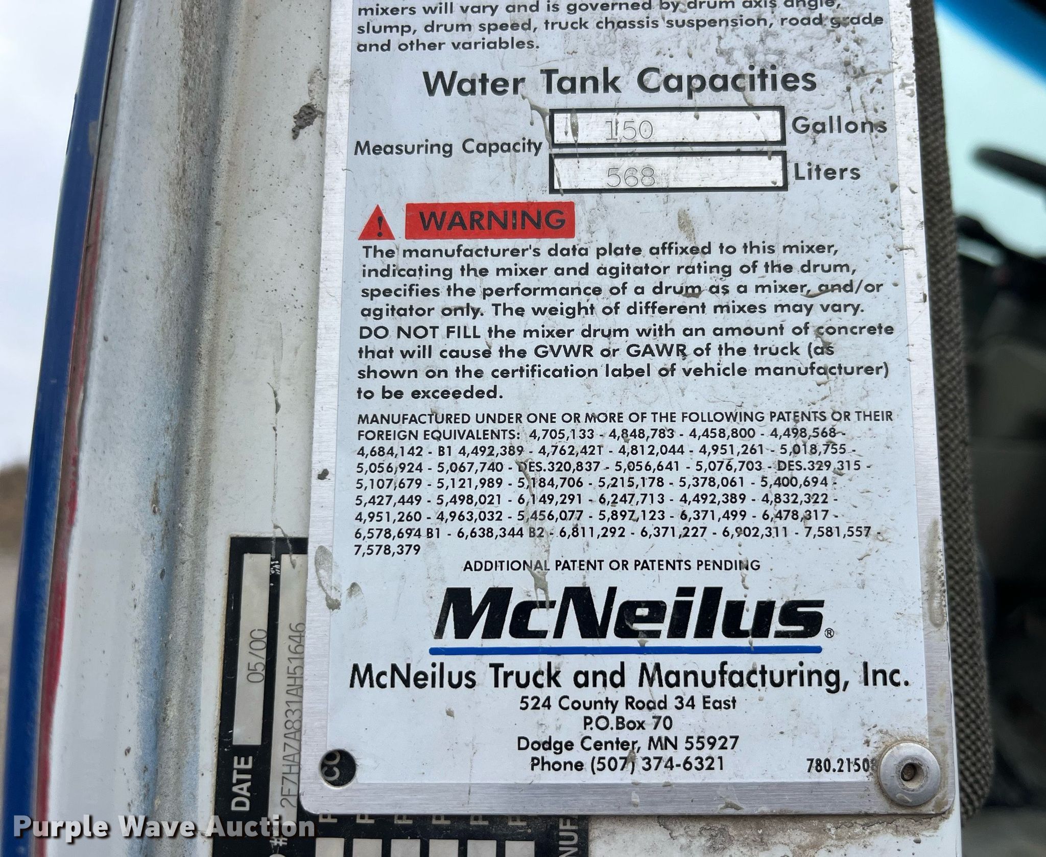 2001 Sterling L9500 ready mix truck. Miles: 196,298 on odometer, Hours: 22,563 on meter, VIN: 2FZHAZA831AH51646. Engine Displacement: 10.8L, Cylinders: 6, Fuel type: Diesel. Transmission Eaton Fuller, Manual, Speed: 11. Chassis Axles: Triple, Tag axle, Differential lock: Full, Suspension: Spring over walking beam, Brakes: Air, PTO, GVWR: 66,000 lbs FAWR: 20,000 lbs, IAWR: 23,000 lbs, RAWR: 23,000 lbs. Interior AC, Heat, Heated mirrors, Cruise control. Features Mixer McNeilus, Serial: 58040-16491, Capacity: 10.5 cu.yd., Discharge: Rear, In-cab controls, Rear drum controls, Water tank capacity: 150 gallons, Chute Extensions: 2, Chute type: Steel.. Tires Size: 425/65R22.5, Lift axle: 11/R22.5. Illinois title. Title distribution may be delayed up to 14 days from verification of funds. All American Ready Mix. 2510 Richards Ln. Springfield, IL 62702