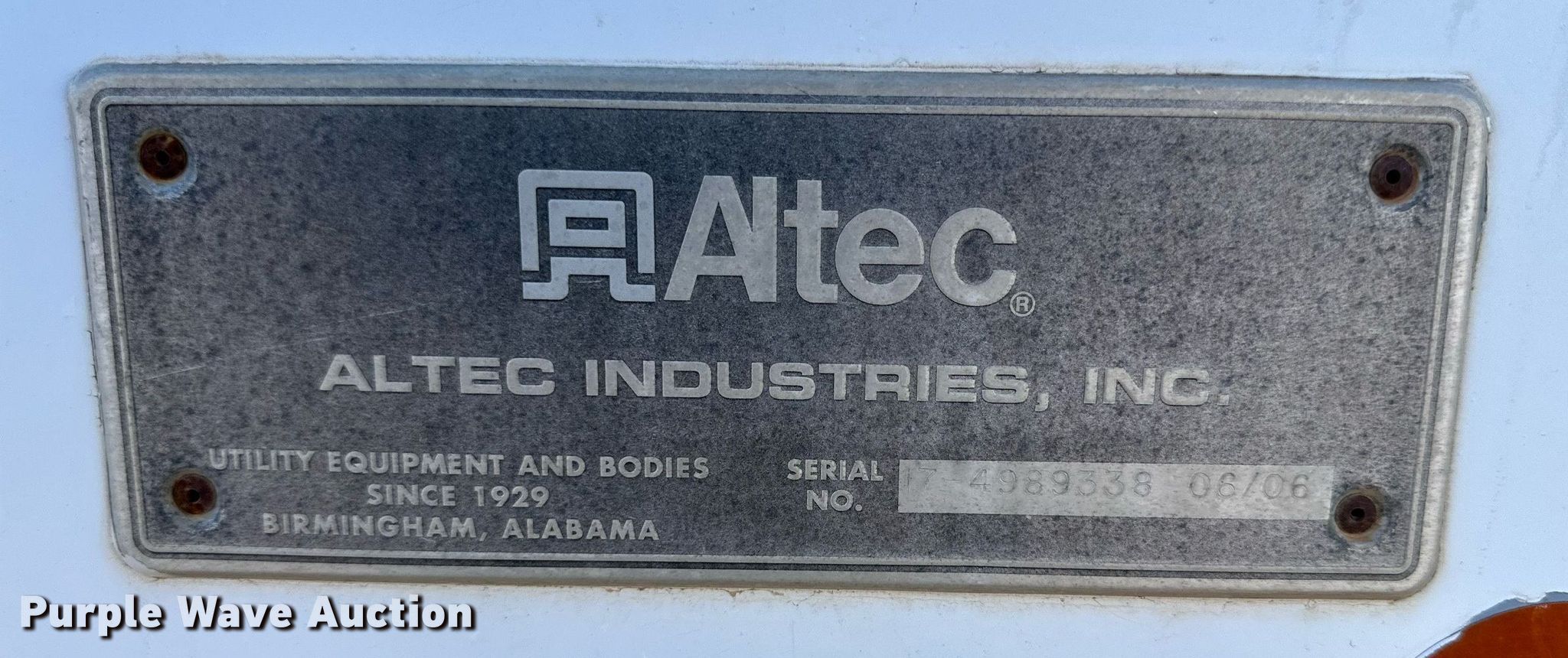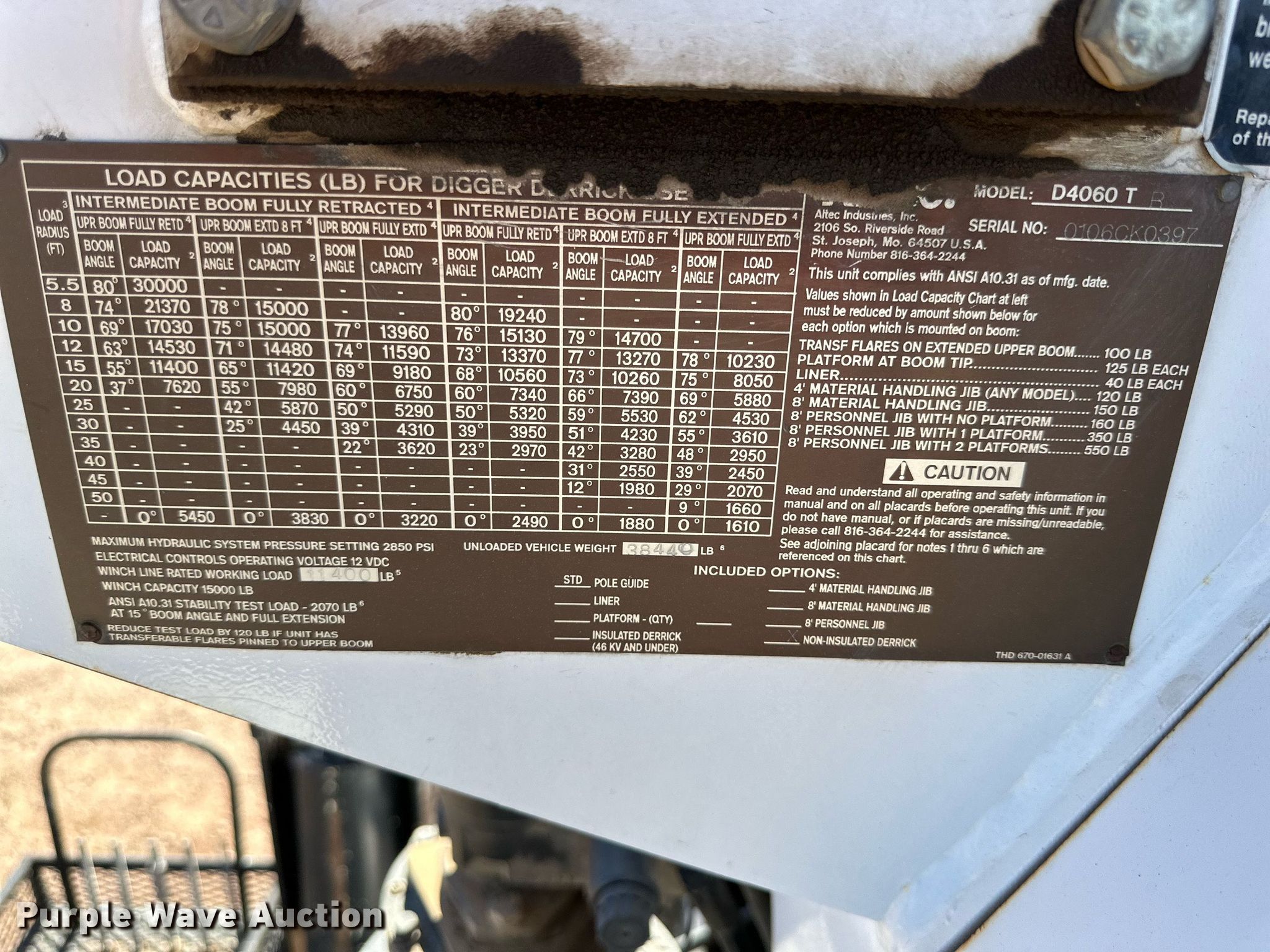 2006 International 7400 digger derrick truck. Miles: 58,248 on odometer, VIN: 1HTWGAAT66J322314. Engine International DT466, Displacement: 7.6L, Cylinders: 6, Fuel type: Diesel. Transmission Allison, Automatic. Chassis Axles: Tandem, Suspension: Spring, Brakes: Air. Interior AC, Heat, Cruise control, Auxiliary controls. Features Bed Altec, 19' L x 96" W, Boom Altec D4060 TB, Serial: 0106Ck0397, Mast height: 50', Maximum lift capacity: 11,400 lbs, Boom type: Articulating, Telescopic, Boom controls Platform/ basket, Pole guide, Auger Diameter: 16".. Tires Front: 385/65R22.5, Rear: 11R22.5. Texas title. Title has a lien that will be released following the close of the auction. Title distribution may be delayed up to 30 days from verification of funds. J&N Utilities. 6849 East Highway 80. Abilene, TX 79601