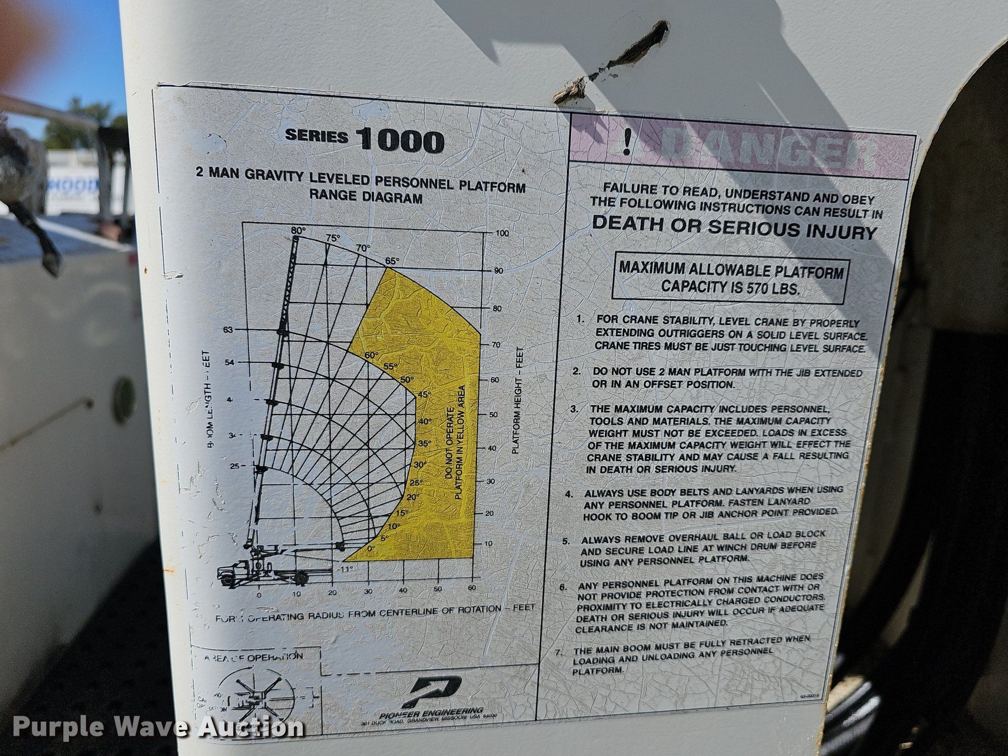 1998 Freightliner FL70 crane truck. Miles: 34,506 on odometer, Hours: 3,363 on meter, VIN: 1FV6HFBA7WH894735. Engine Cummins ISB, Displacement: 5.9L, Cylinders: 6, Fuel type: Diesel. Transmission Spicer, Manual, Speed: 7. Chassis Axles: Single, Suspension: Spring, Brakes: Air. Operators station Crane controls: Joysticks. Features Boom Pioneer 1000, Telescopic, Maximum boom length: 60' Sections: 2, Maximum lift capacity: 570 lbs, Maximum lift height: 95', Jib: 25', Stabilizers: 4, Boom controls Ground, Winches: 1, Crane block, Crane ball & hook, Lift chart, 42" forks, (4) stabilizer blocks, Wood bed 16' 6" L x 8' W. Tires Size: 11R22.5. Notes Unknown operating condition of crane. Kansas title. Title distribution may be delayed up to 14 days from verification of funds. Manhattan, KS 66503